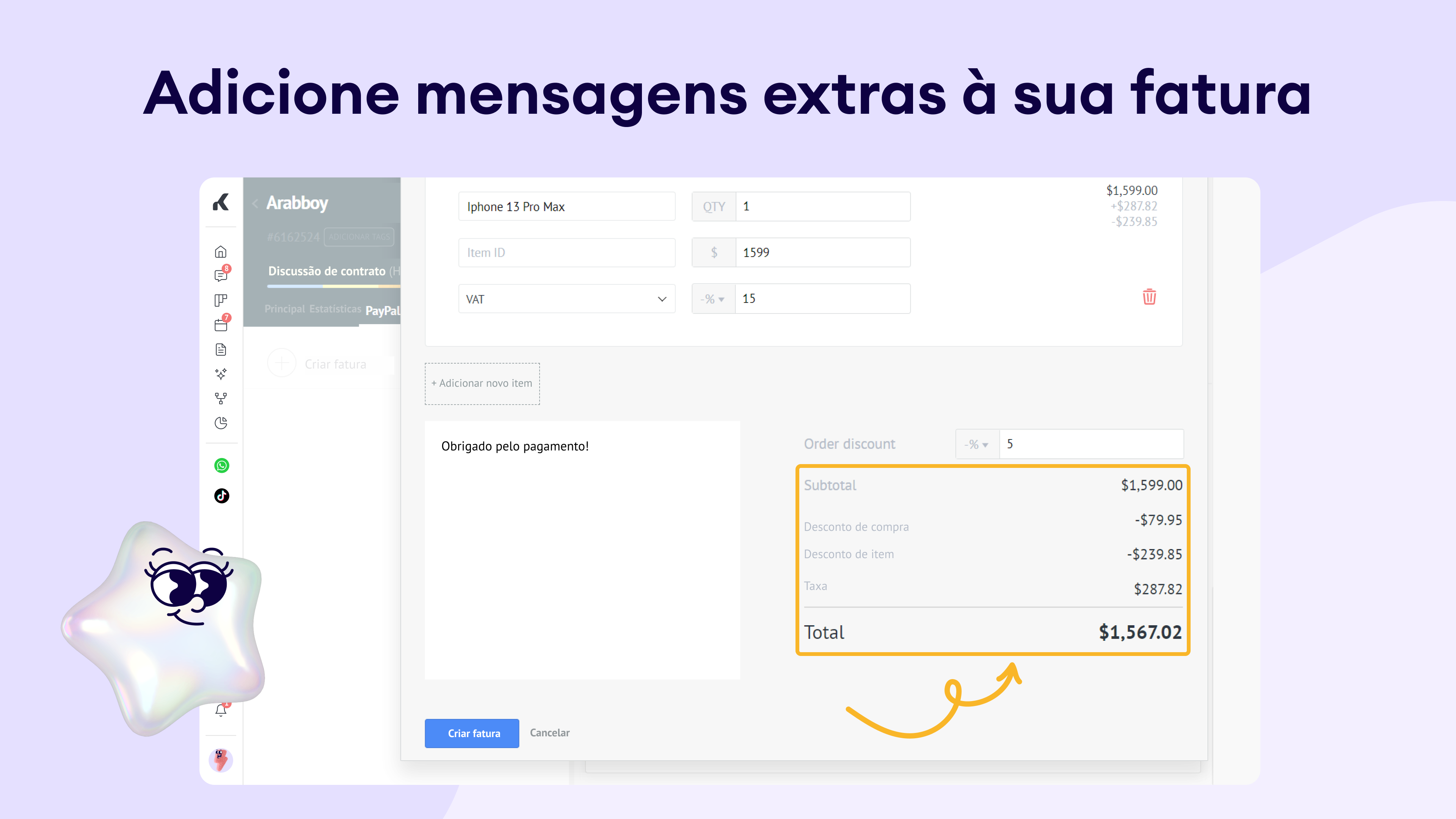 • Faturas automatizadas: Deixe o Salesbot cuidar da criação e distribuição de faturas automaticamente. Chega de rascunhos ou copiar e colar manualmente, cada venda pode gerar uma fatura em segundos.