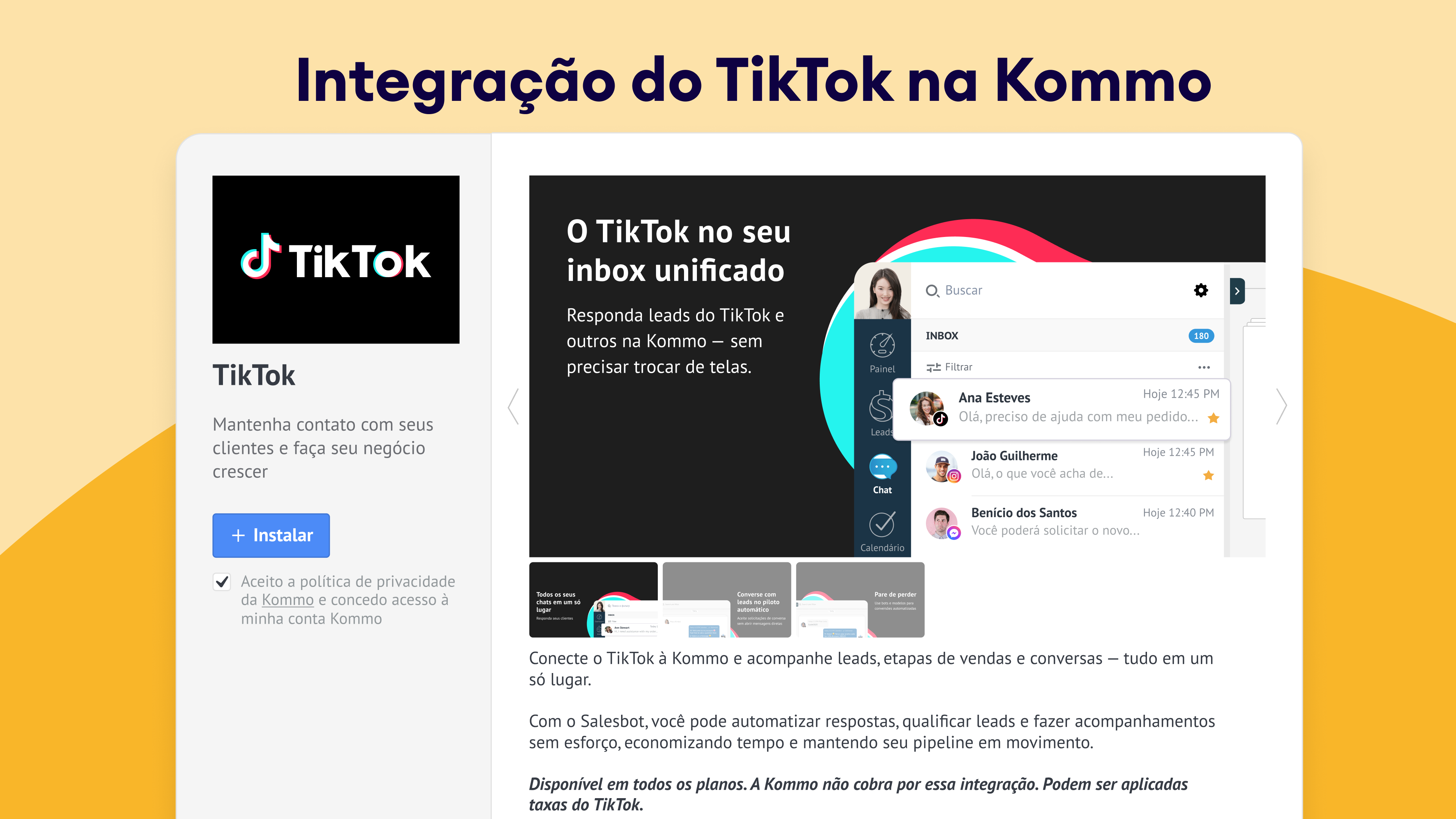 Geração automática de leads: quando alguém envia uma mensagem para sua conta do TikTok, ele é adicionado como um lead na Kommo, sem necessidade de adicionar manualmente.
