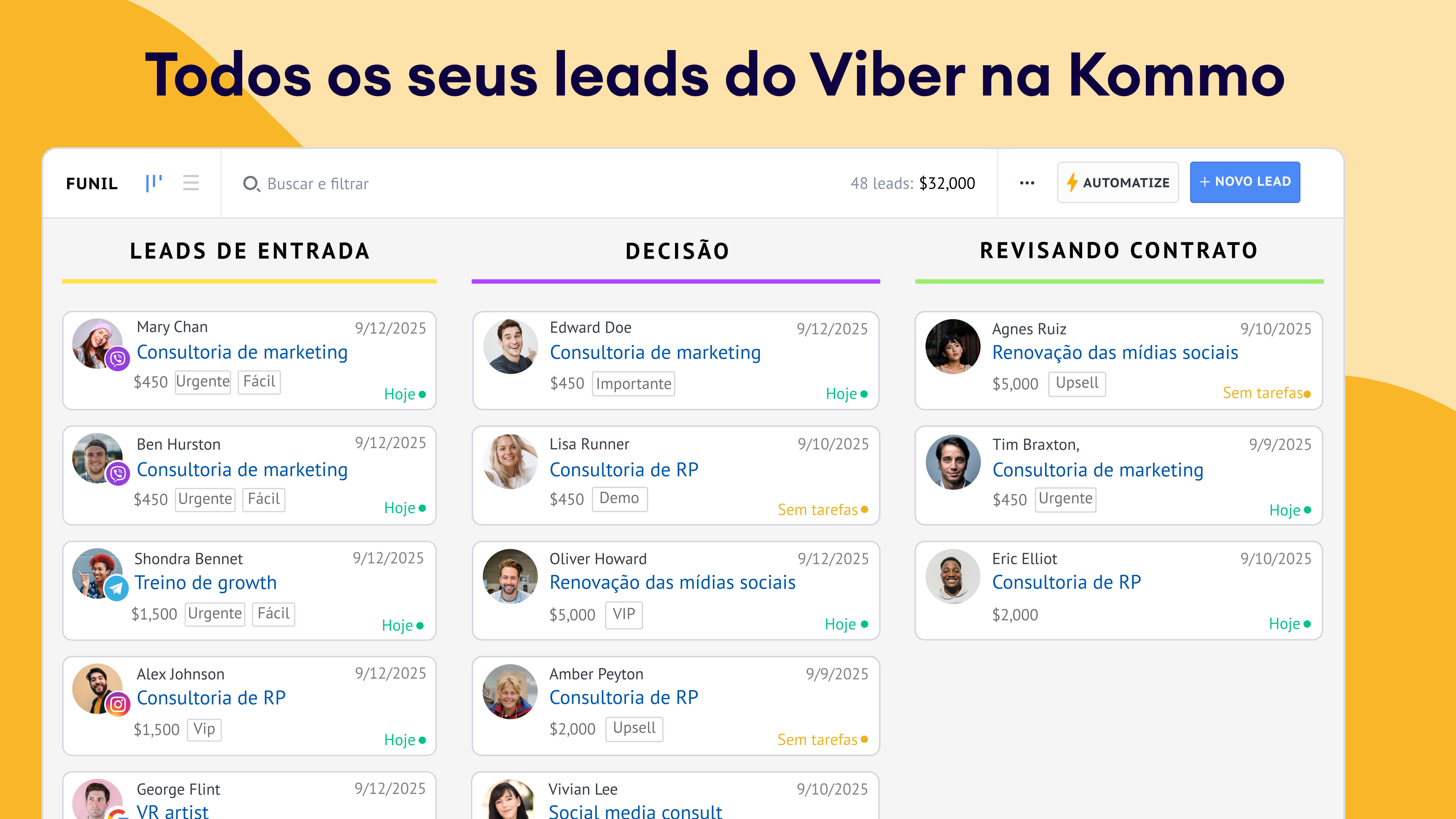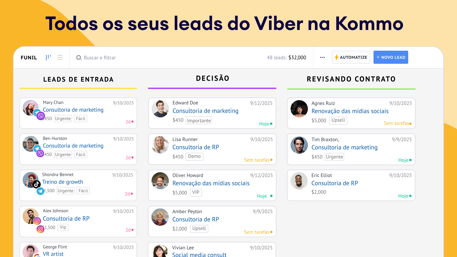 Captura instantânea de leads: Sempre que um novo cliente envia uma mensagem para você no Viber, um lead é criado automaticamente em seu pipeline — sem necessidade de entrada manual.