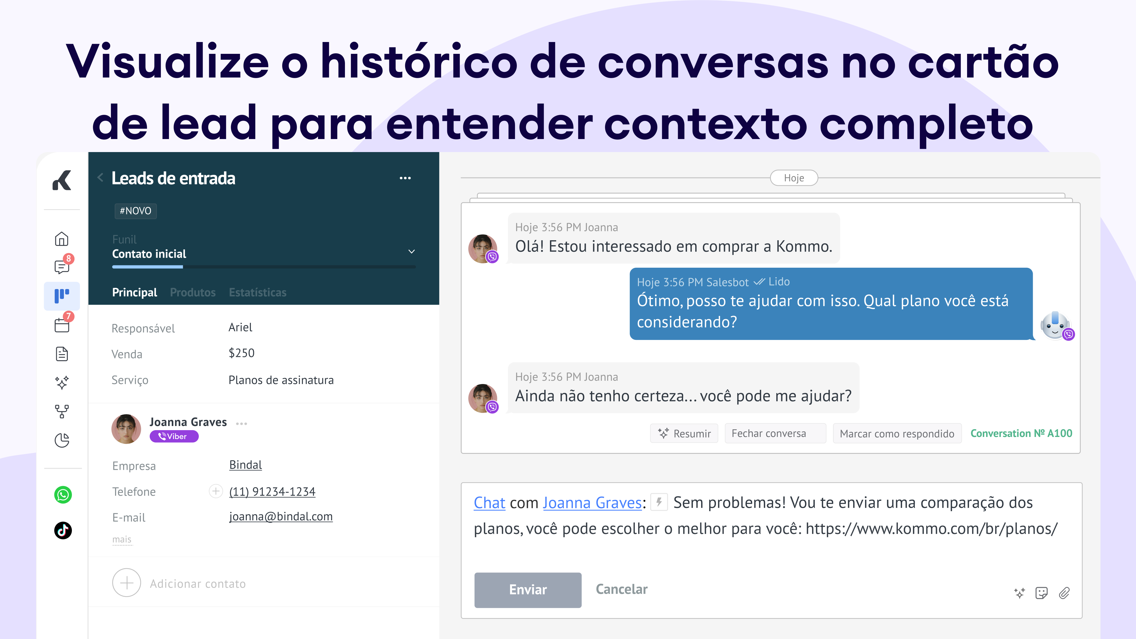 Gerenciamento de chats simplificado: Responda às mensagens diretamente no cartão de leads, mantendo toda a comunicação em um só lugar organizado.