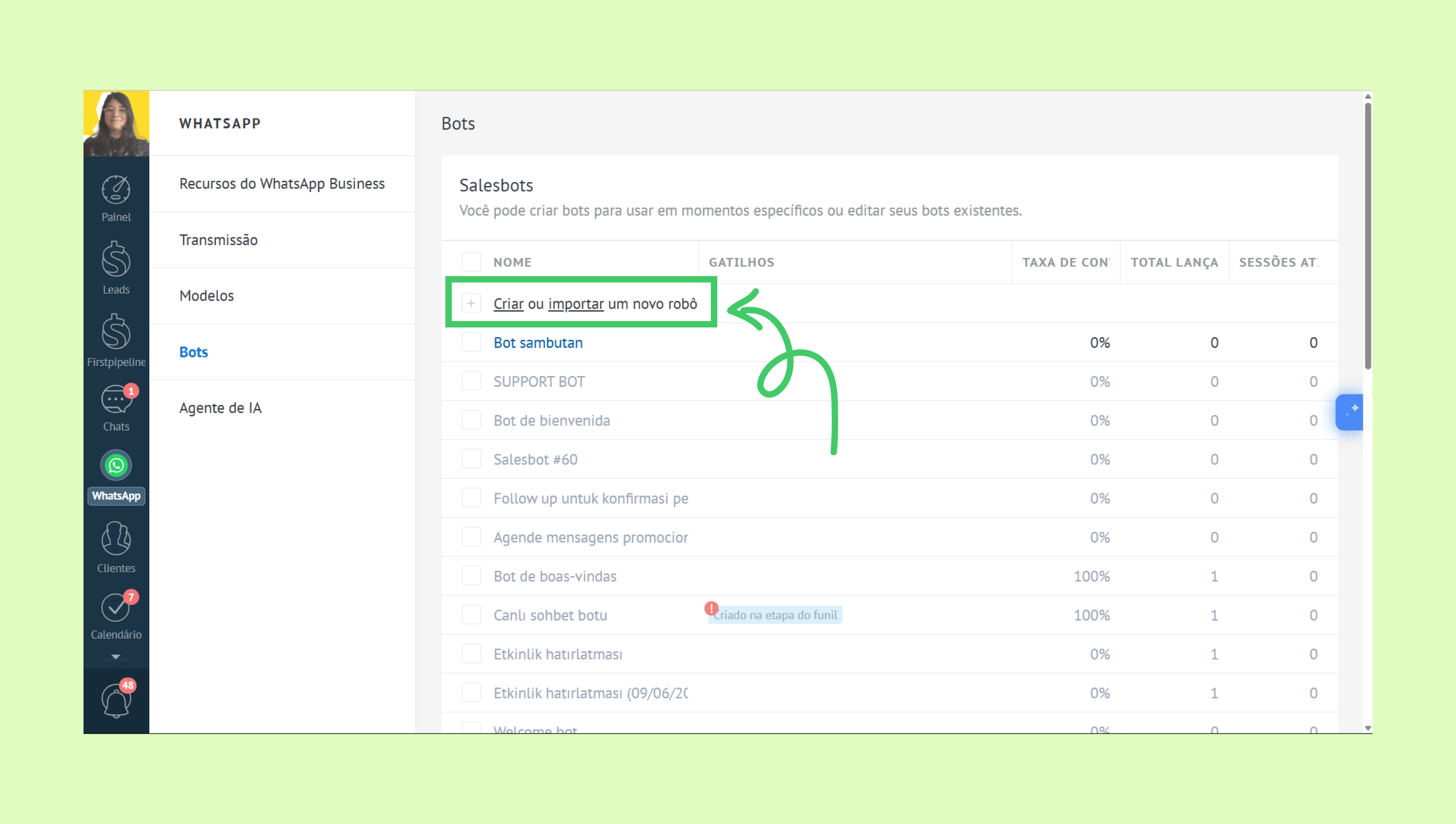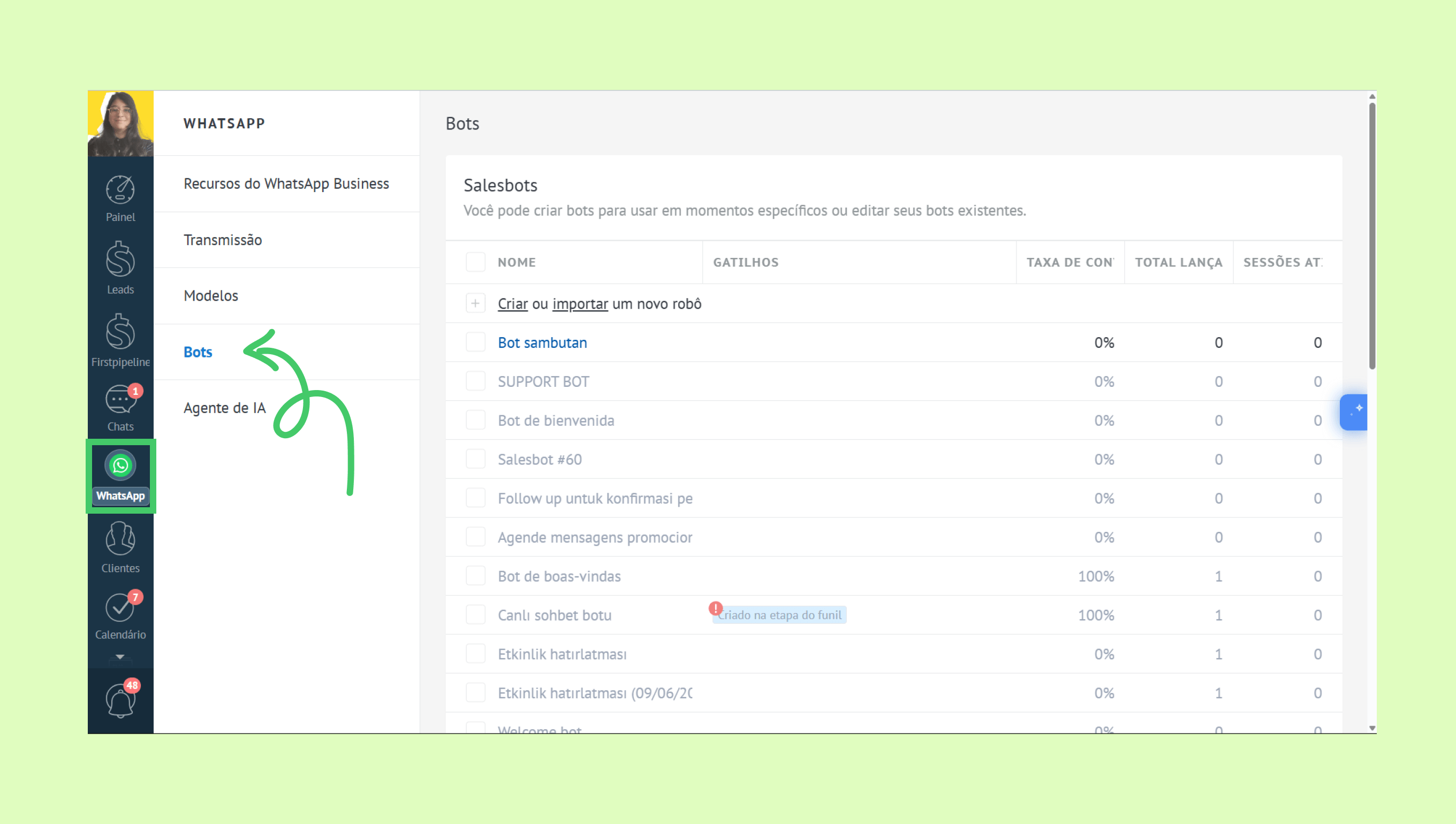 Lembre-se: o Salesbot funciona quando você configura um gatilho ou o inicia manualmente a partir do cartão de lead. Os gatilhos informam ao bot quando iniciar e quando enviar a Mensagem em Lista. Não sabe como os gatilhos funcionam? Confira nosso artigo sobre gatilhos do Salesbot.