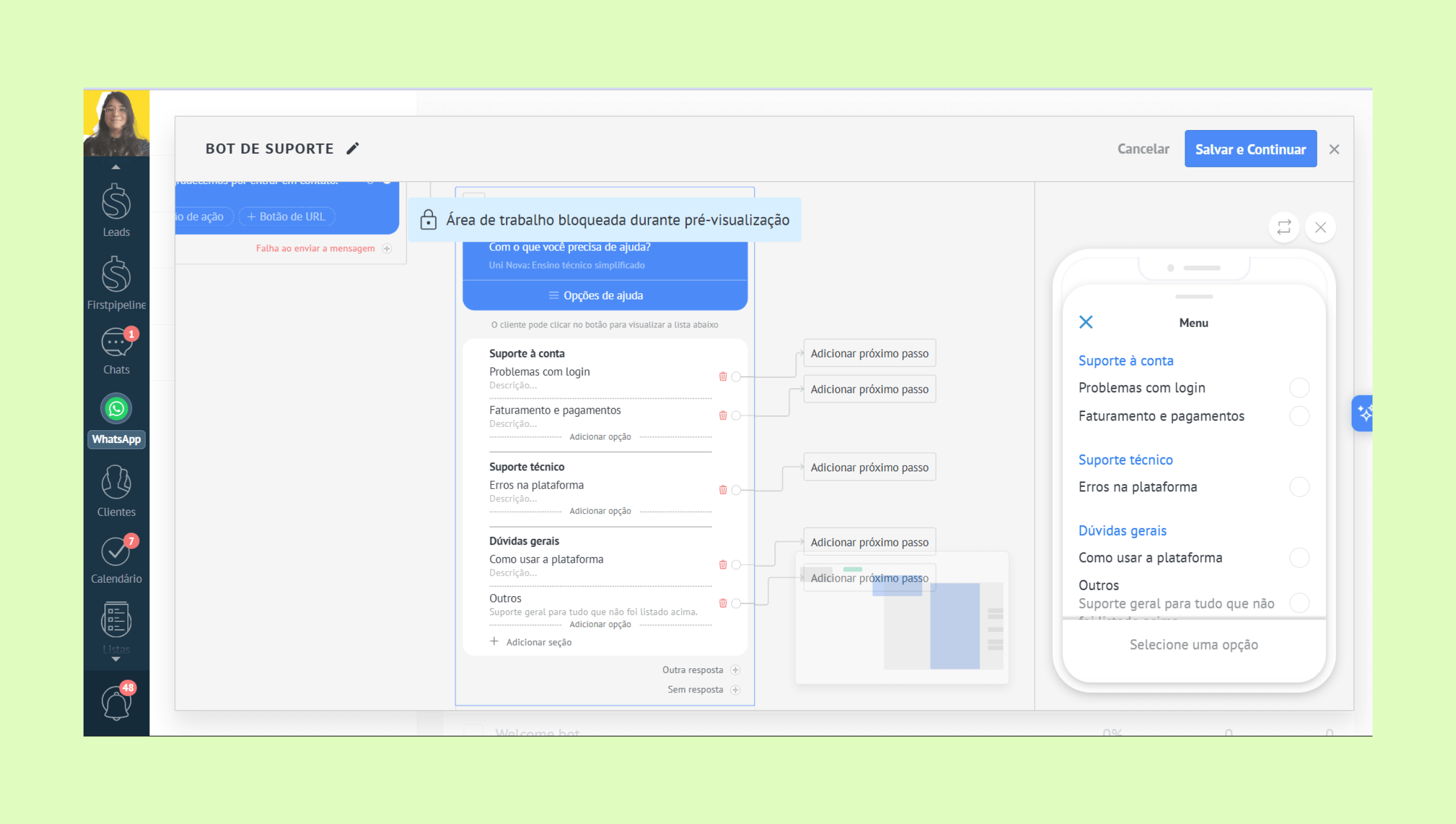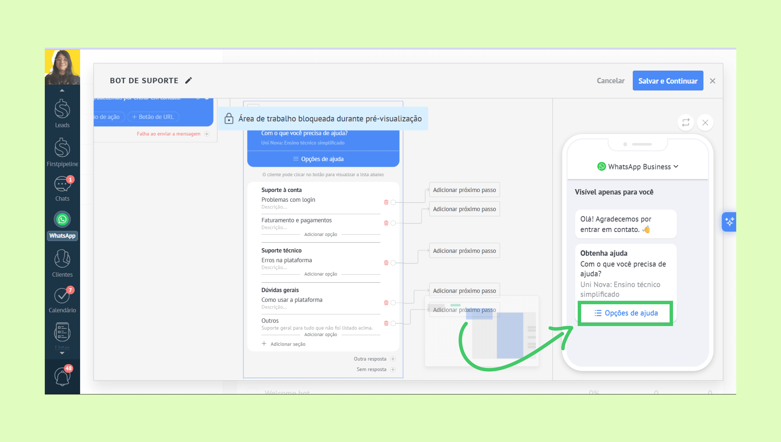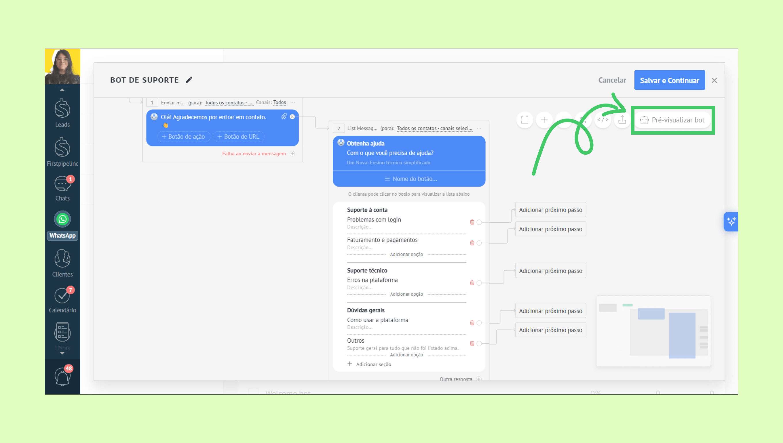 Nota: Use o recurso de Pré-visualização de bot para ver como sua Mensagem em Lista aparecerá para os usuários antes de salvá-la.