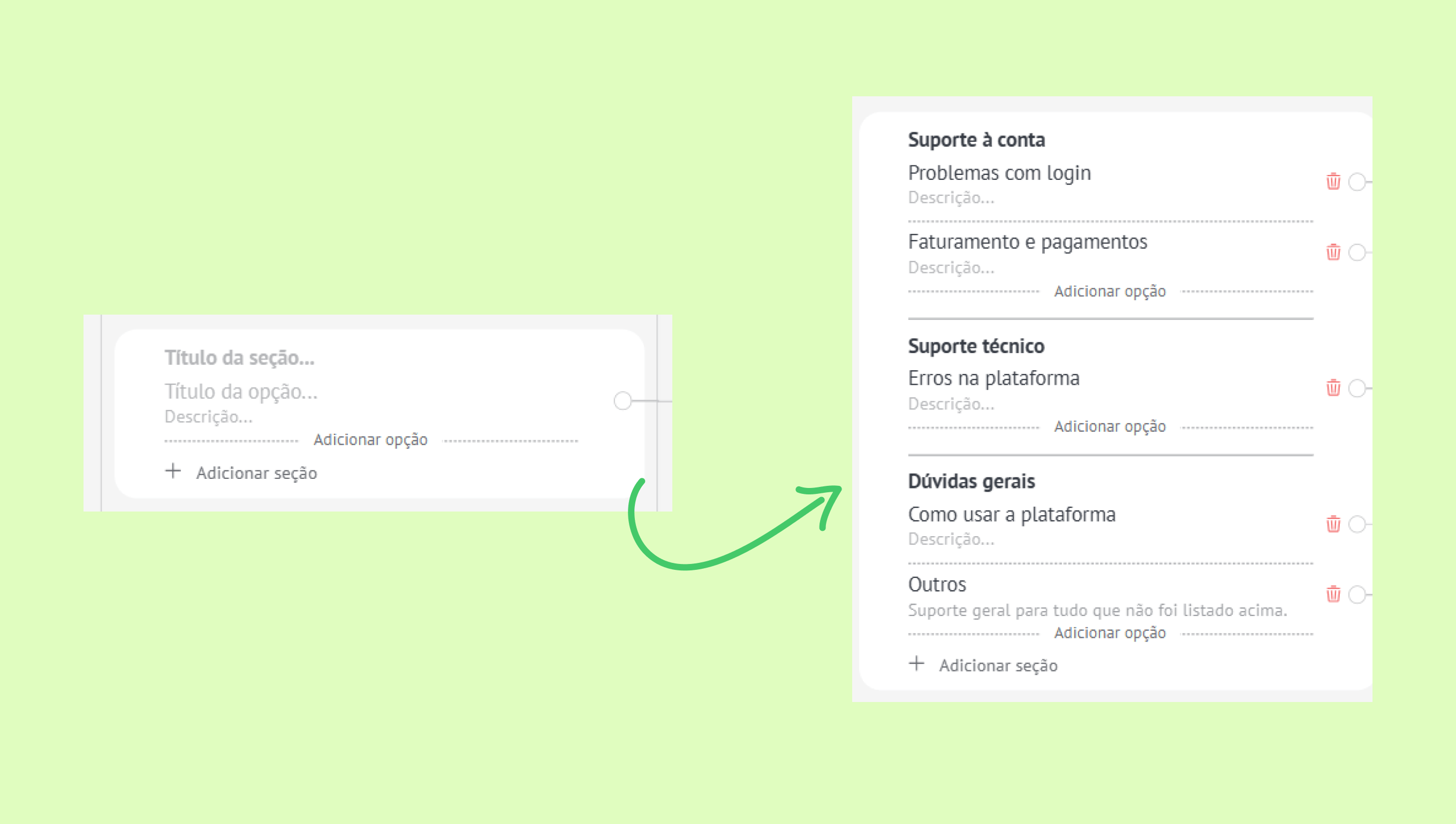Você pode agrupar opções relacionadas — como serviços, departamentos ou categorias — em seções.
