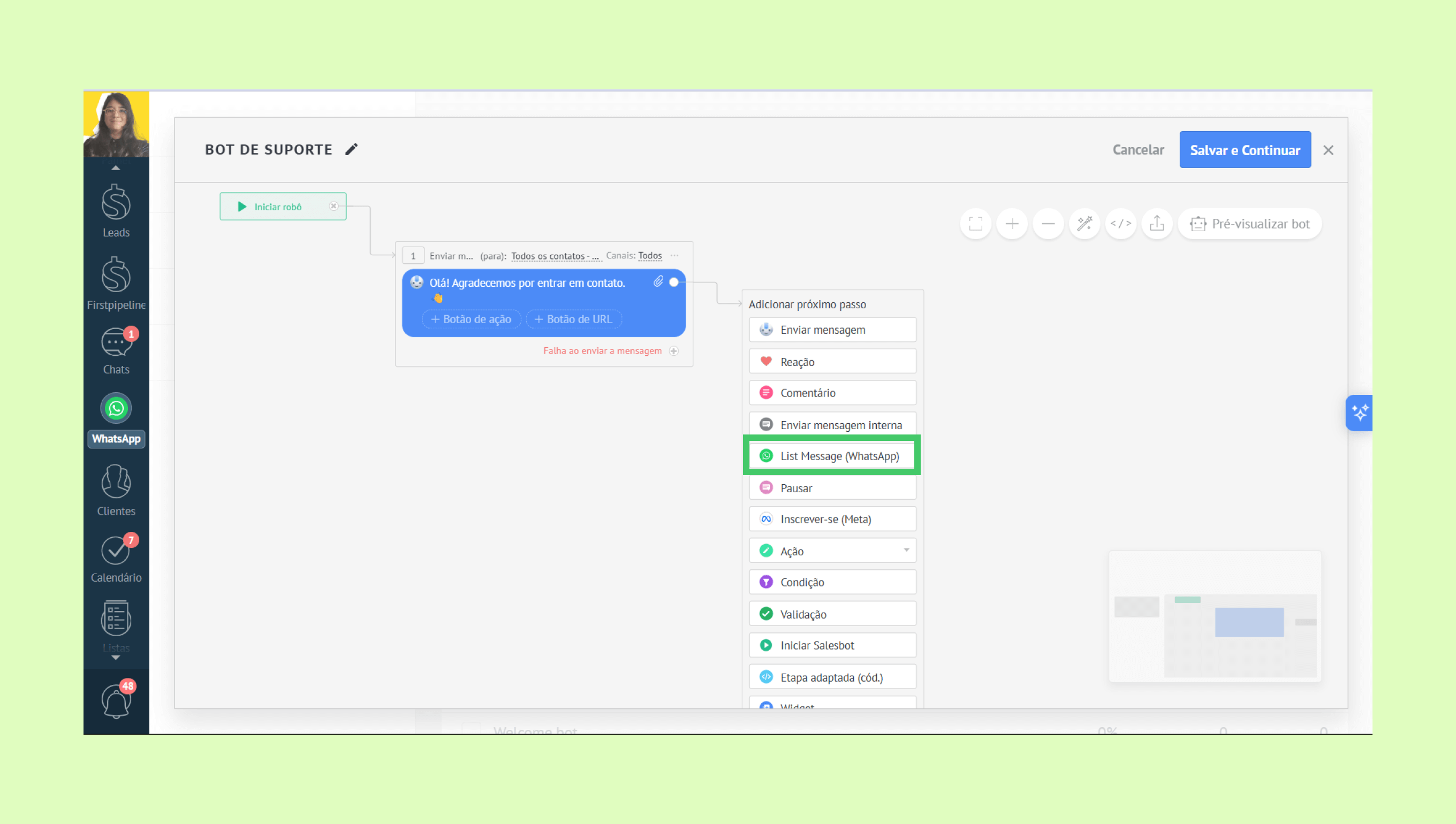 No editor de bot, selecione o passo List Message (WhatsApp).