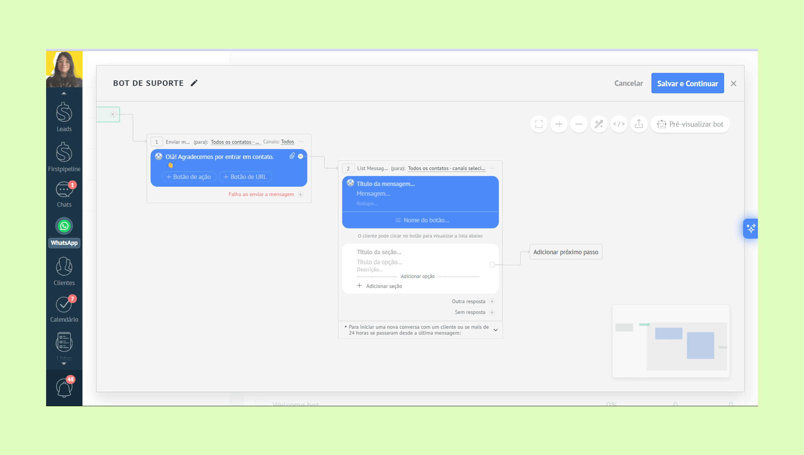 As Mensagens em Lista são adicionadas como etapas dentro do editr do Salesbot. Você pode colocá-las em qualquer lugar do fluxo do seu bot, desde que a conversa do WhatsApp já tenha começado. Para melhores resultados, inicie o chat com uma mensagem ou pergunta simples e, em seguida, continue com sua lista.