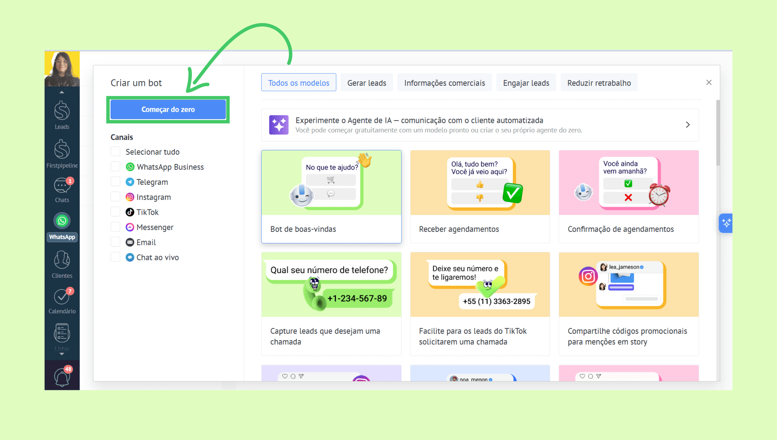 No WhatsApp, esta etapa aparecerá como uma única mensagem com um botão.