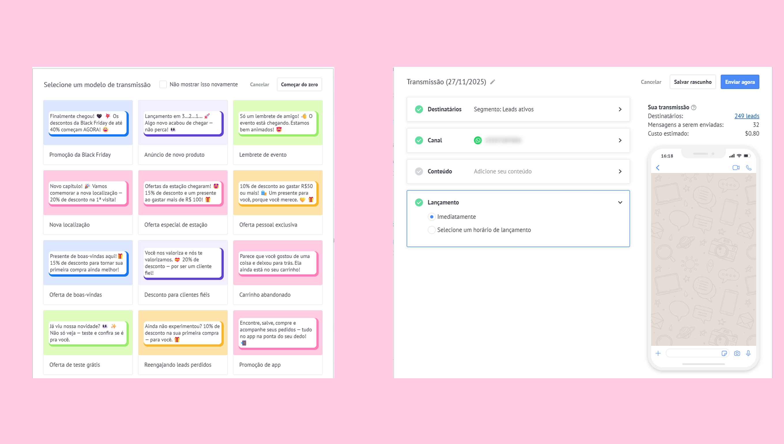 • A API MM é usada exclusivamente para o envio de mensagens de marketing. Outros tipos de mensagens serão enviados por meio do sistema de mensagens padrão do WhatsApp.