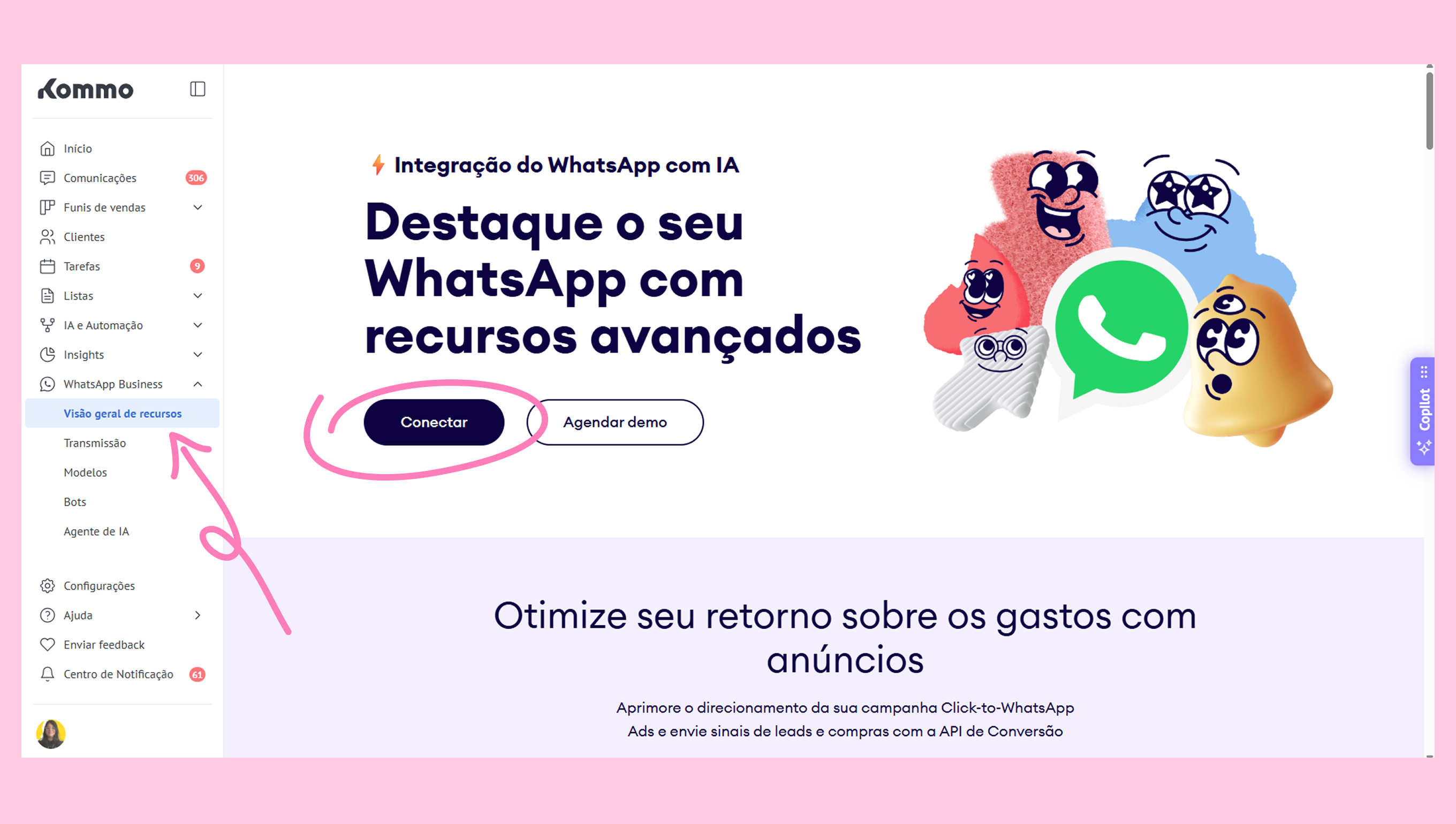 1. Conecte a integração, se necessário. Saiba como conectar o WhatsApp Business à Kommo.