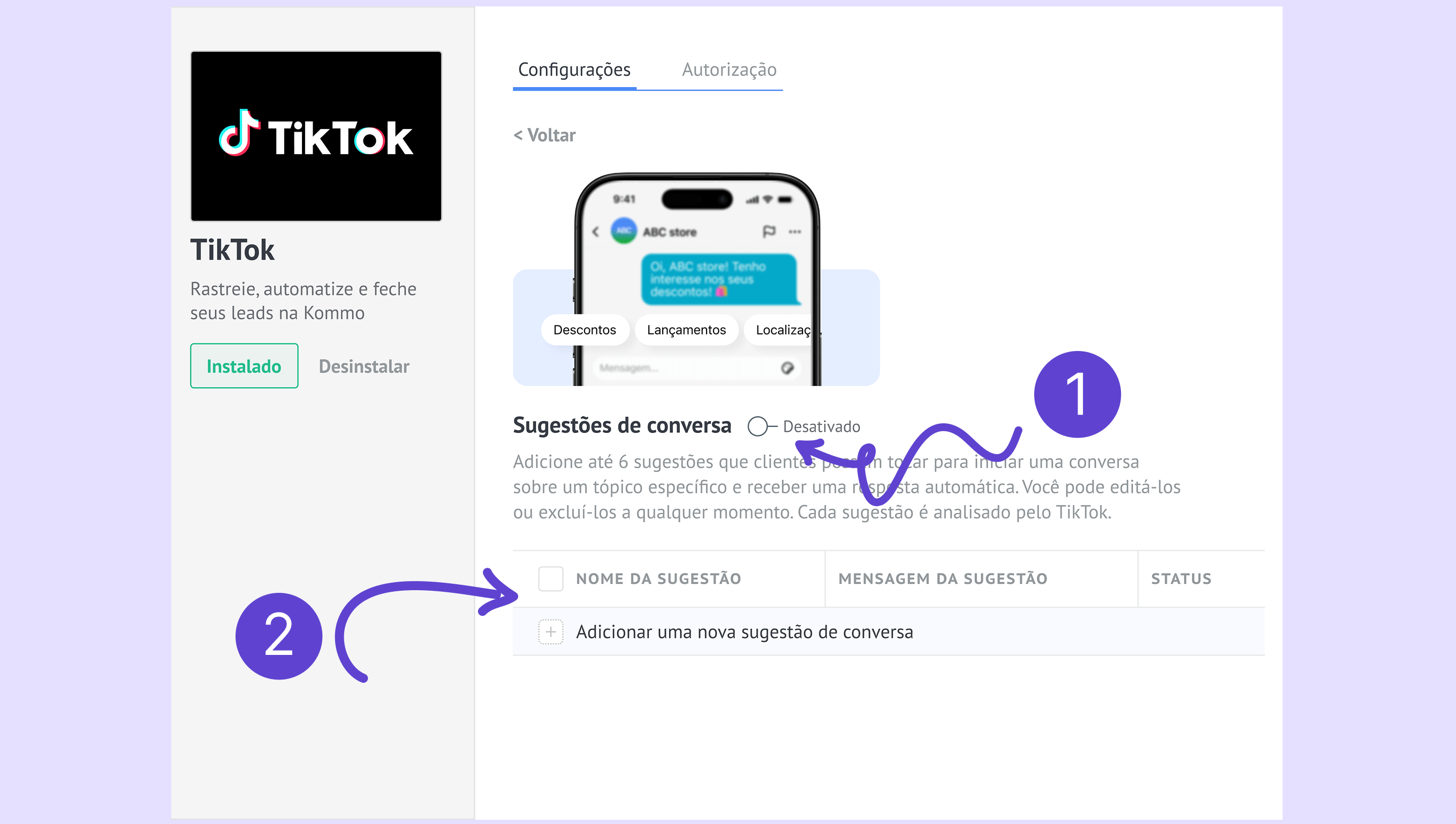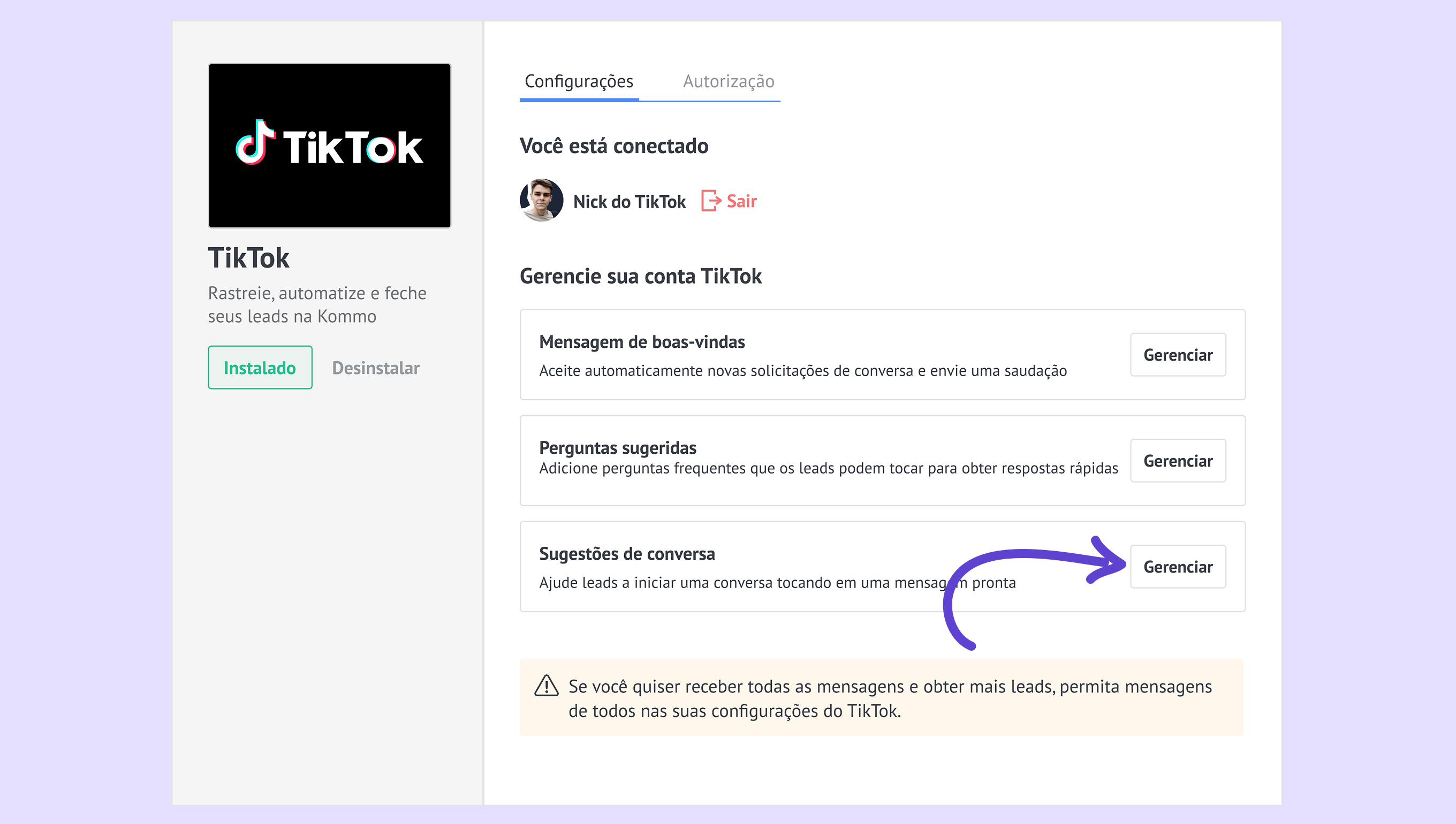 Pronto! Sua conta do TikTok está conectada à Kommo. Agora você pode:
