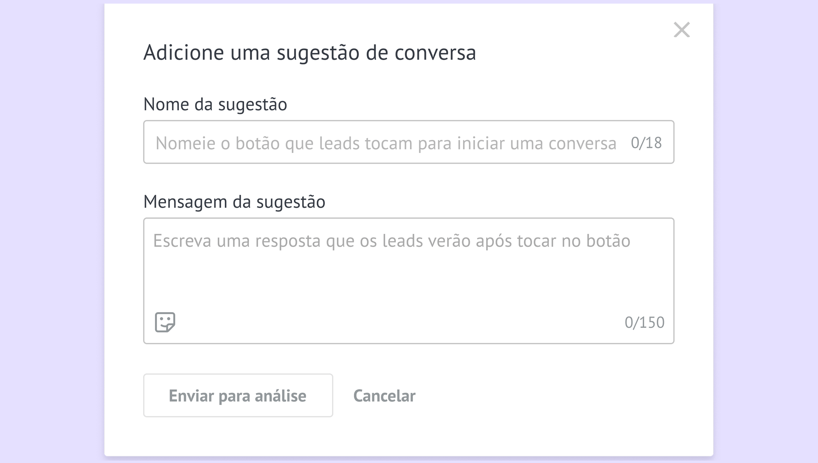 Mensagem da sugestão: A mensagem enviada quando o botão é clicado (máx. 150 caracteres)