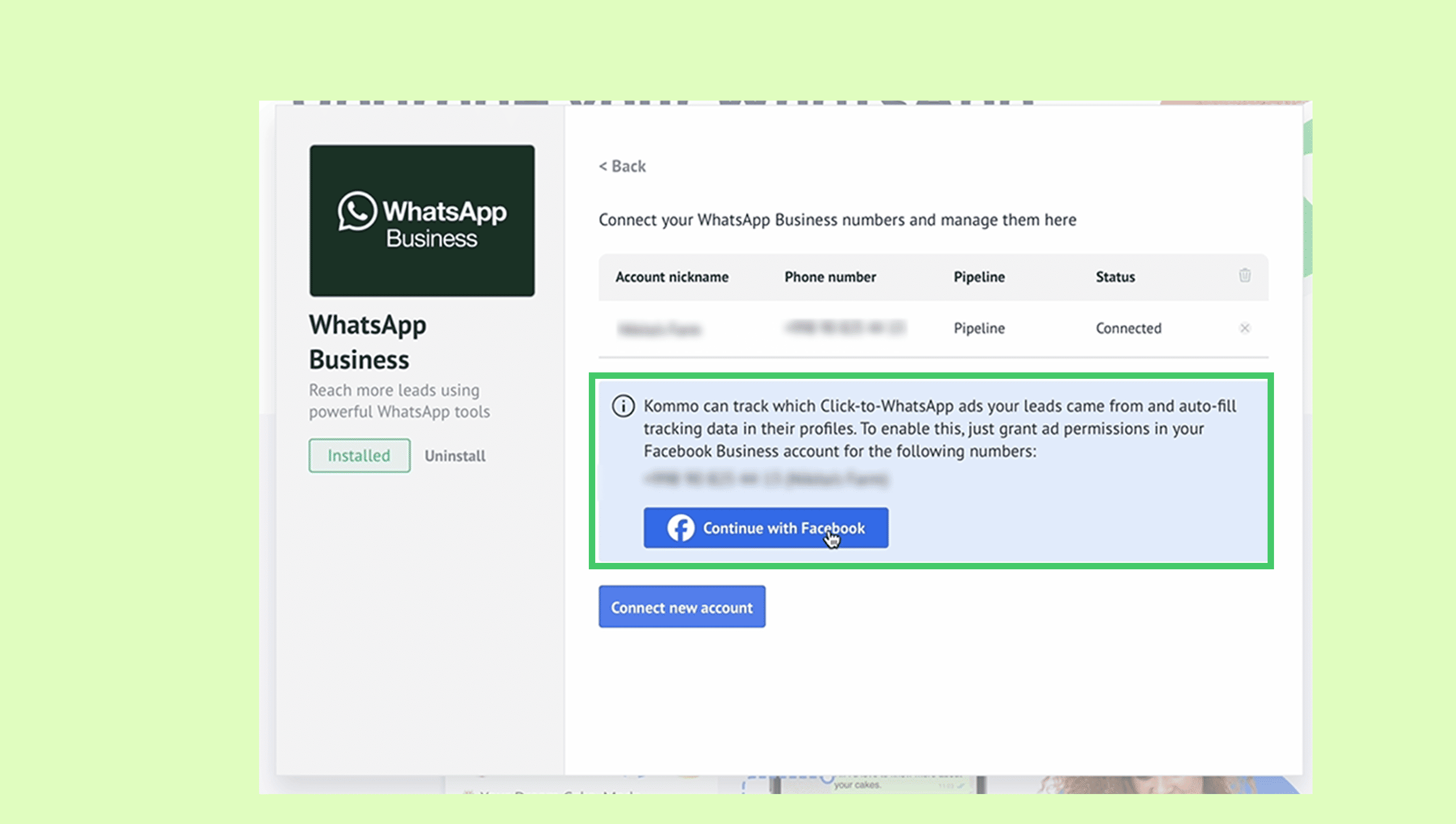 Certifique-se de que seu número do WhatsApp já esteja conectado à Kommo. Caso contrário, siga este guia para conectar o WhatsApp Business à Kommo.
