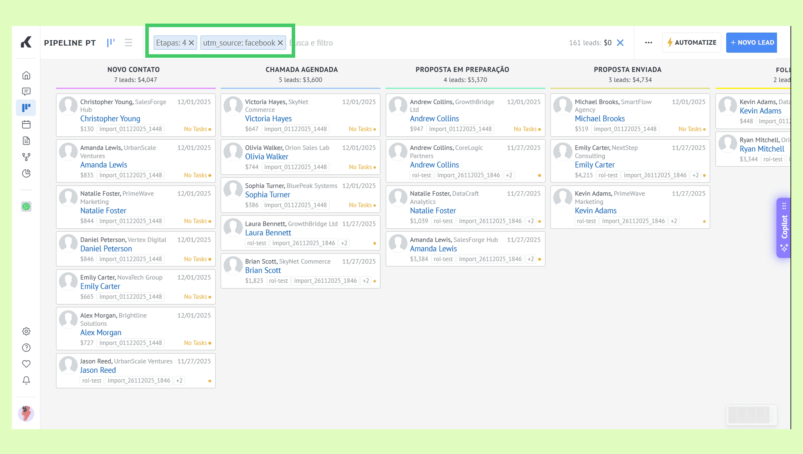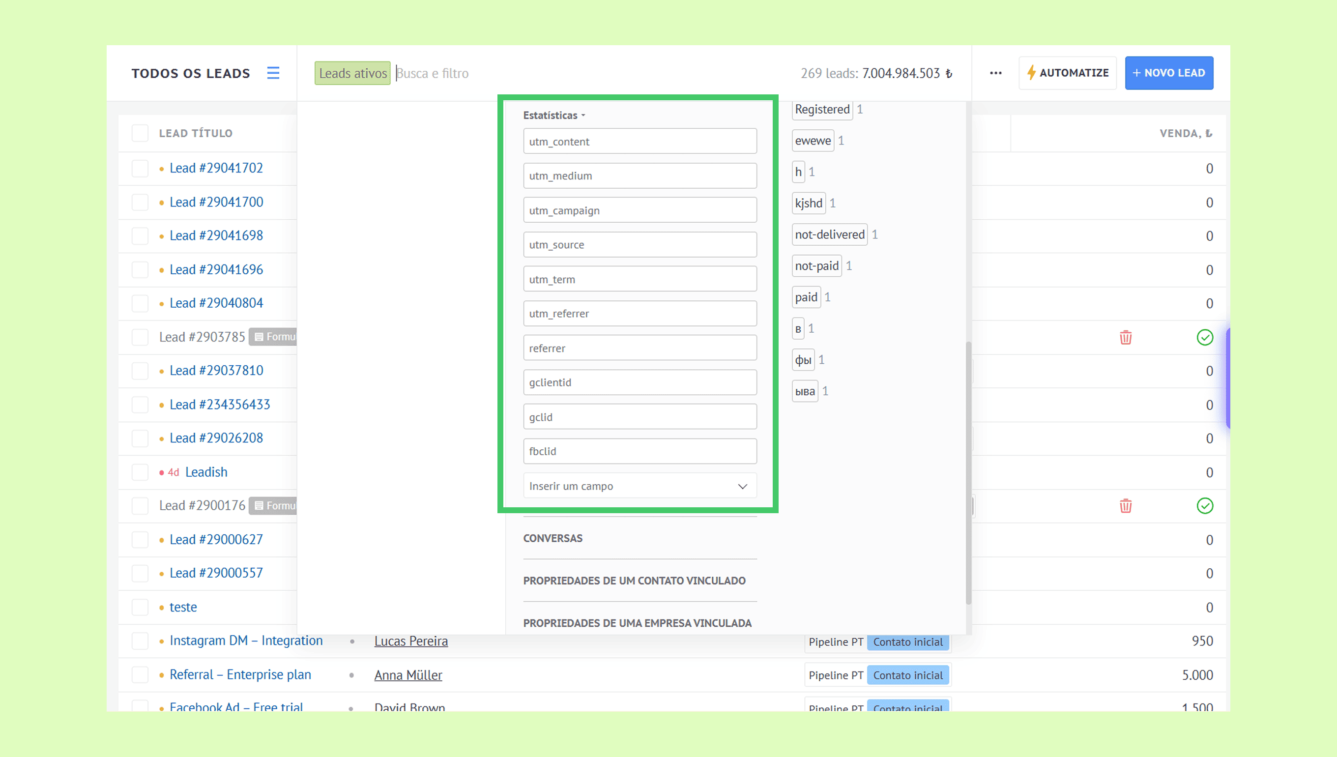 Isso exibirá todos os leads que correspondem ao valor UTM inserido, para que você possa ver quais campanhas estão gerando leads e comparar seus resultados.