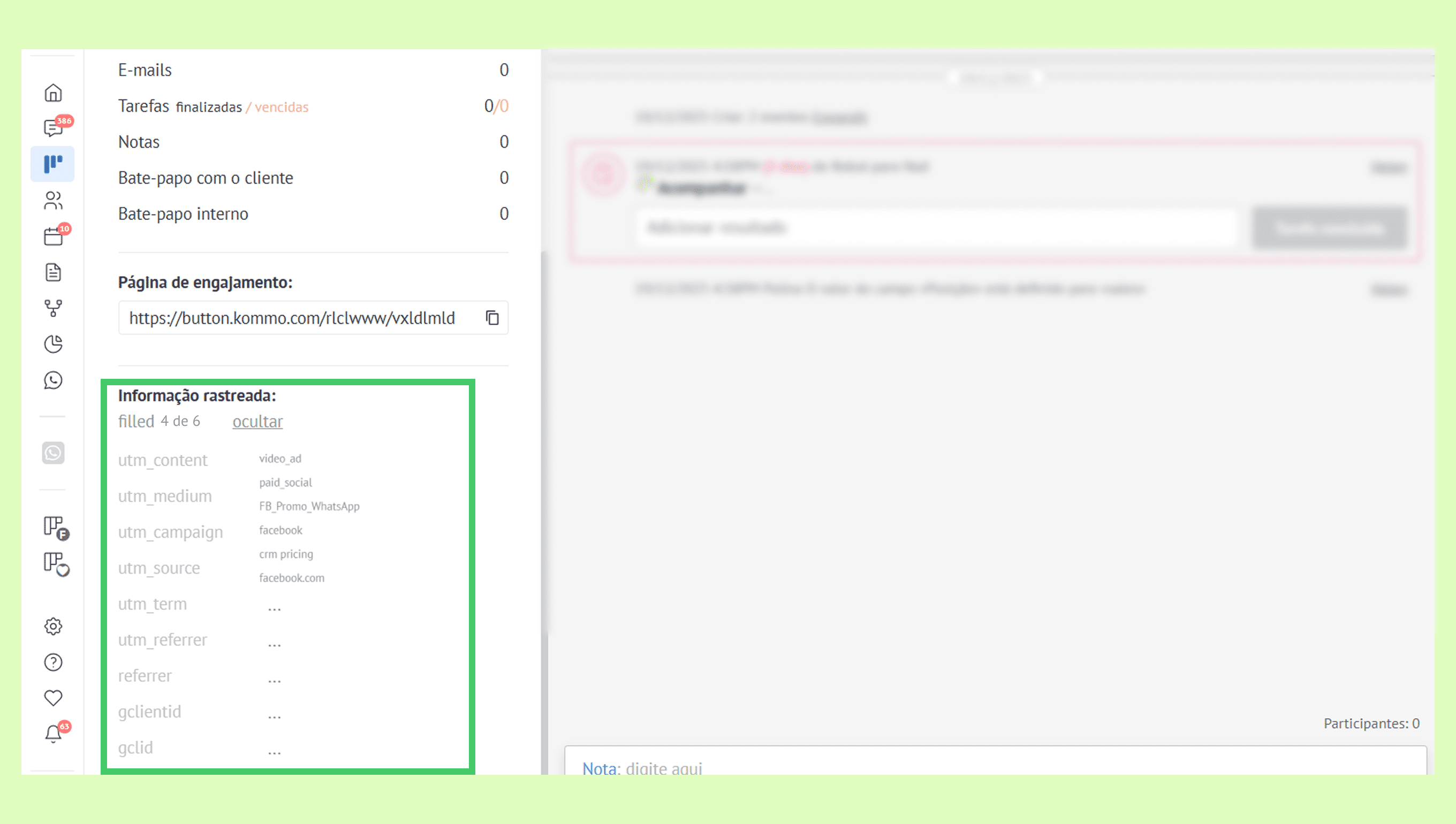 Quando alguém clica em um anúncio e inicia uma conversa no WhatsApp, a Kommo captura automaticamente esses valores UTM no cartão de leads. Isso permite conectar conversas a campanhas específicas, comparar resultados entre canais e ver quais anúncios geram mais leads.