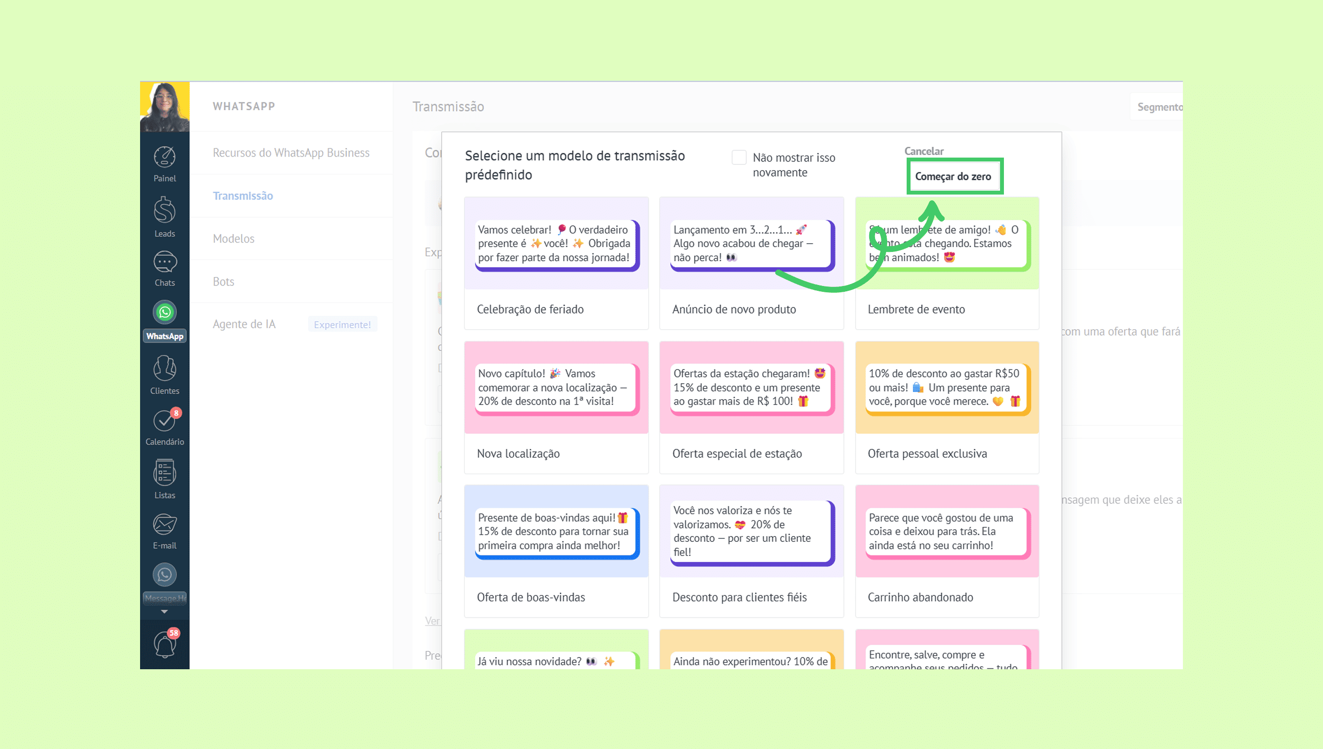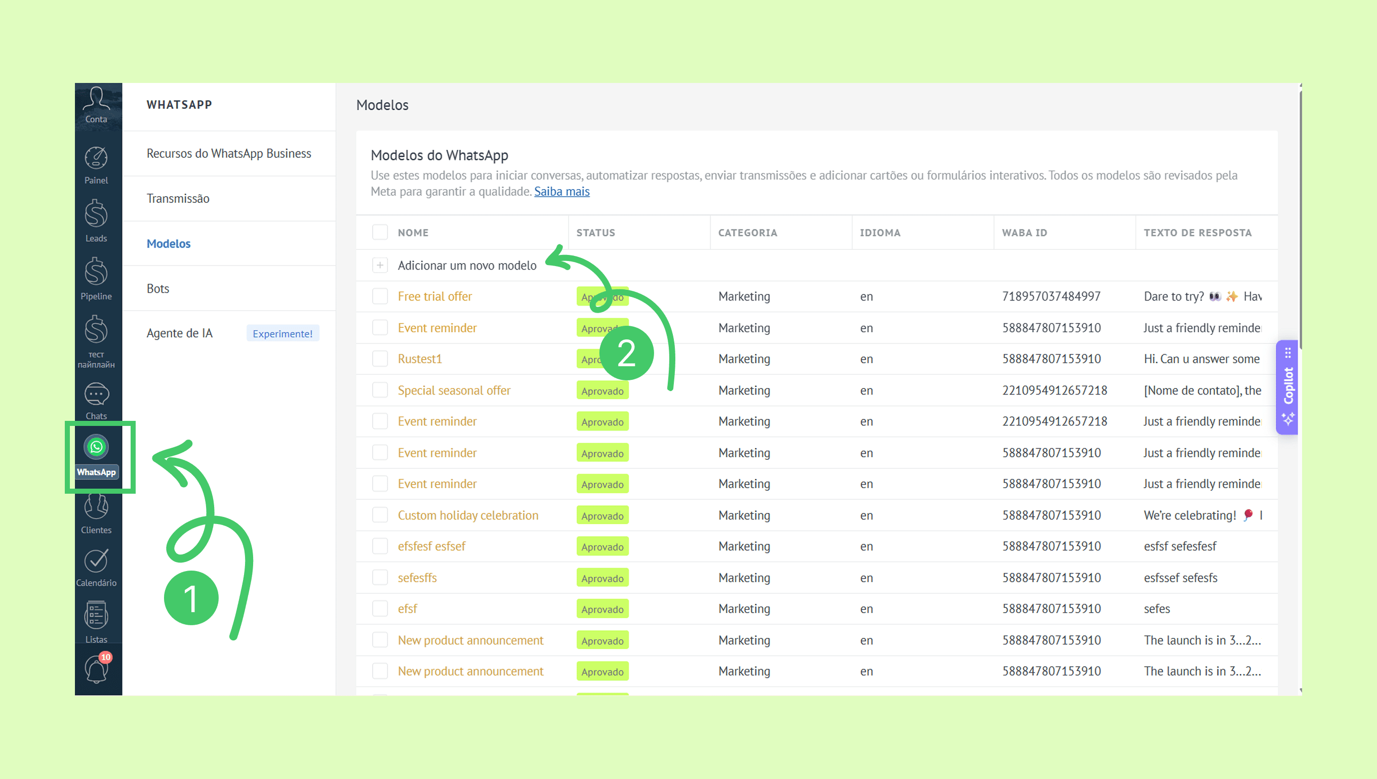 Acesse WhatsApp → Modelos → Modelos do WhatsApp e clique em Adicionar um novo modelo.