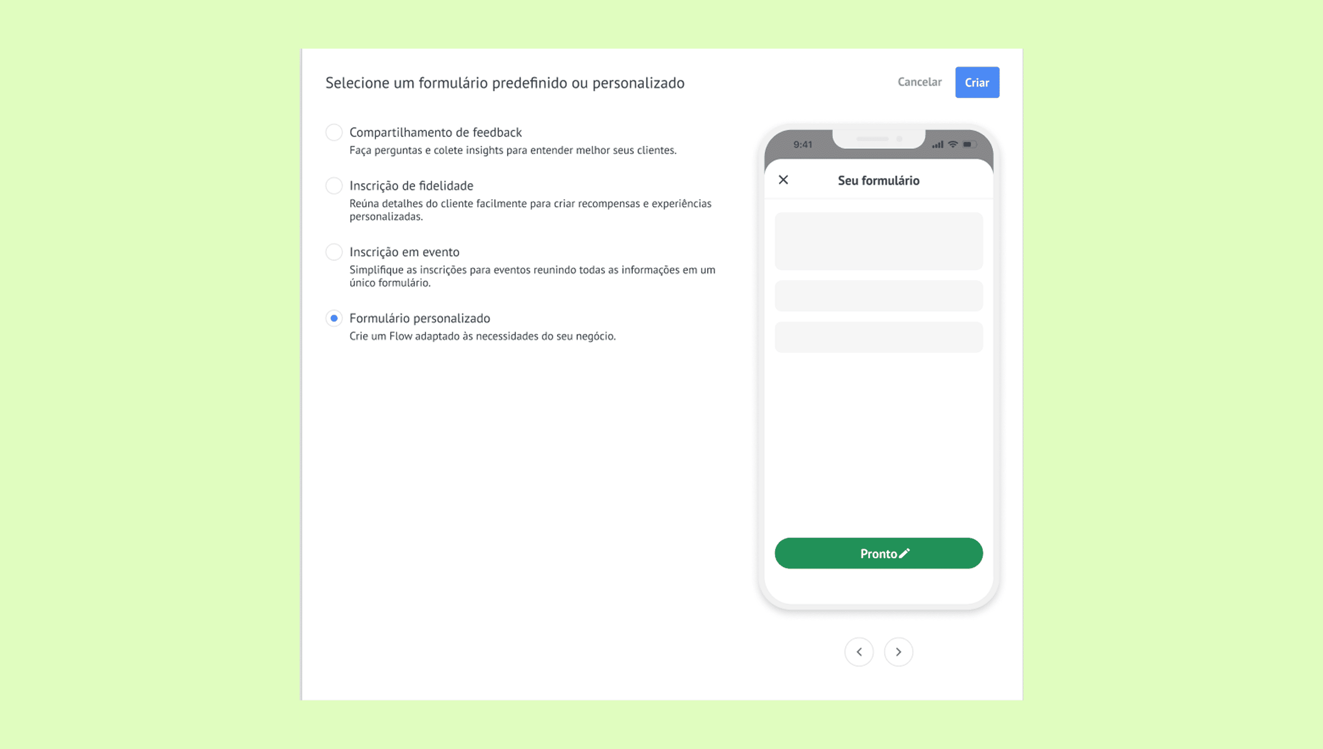 Um modelo de Flow é uma mensagem do WhatsApp que inclui um formulário interativo. Quando um cliente toca no botão da mensagem, o formulário é aberto dentro do chat do WhatsApp. Ele guia o usuário por uma série de telas onde ele pode inserir informações como nome, número de telefone, preferências e muito mais.