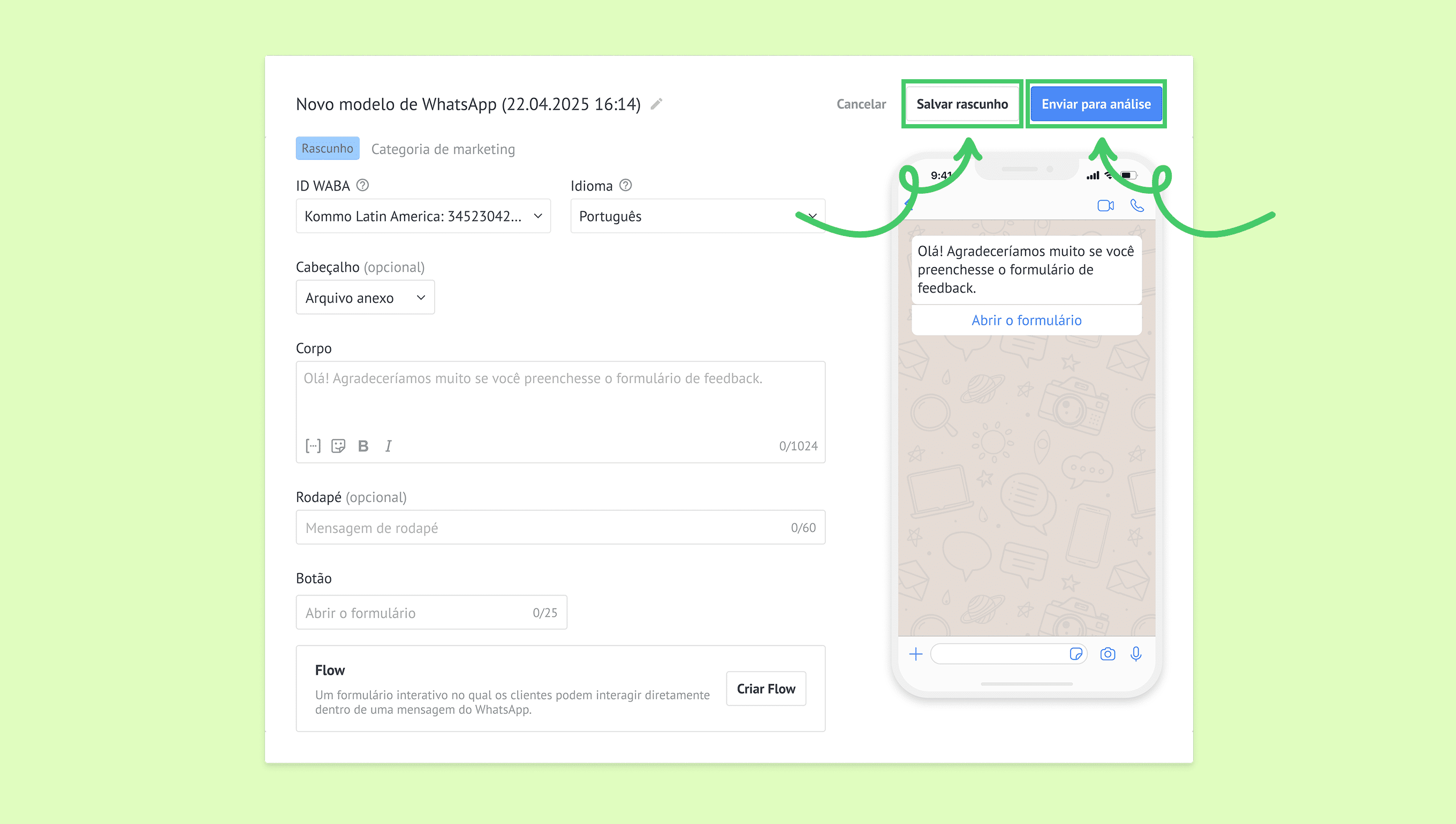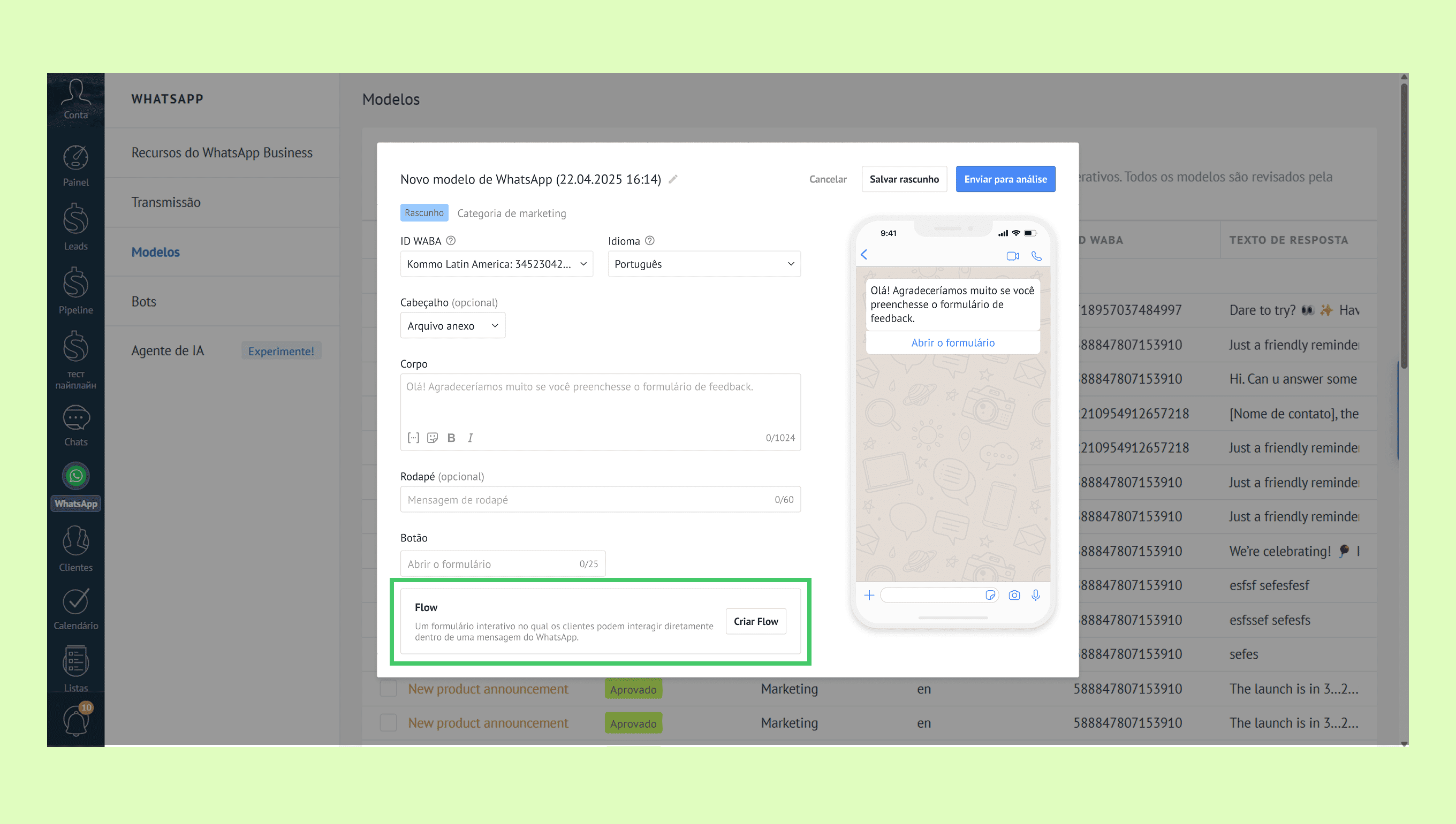 Para visualizar ou pré-visualizar seu modelo de Flow, acesse WhatsApp → Modelos → Modelos do WhatsApp, clique no nome do modelo e abra a aba Flow.