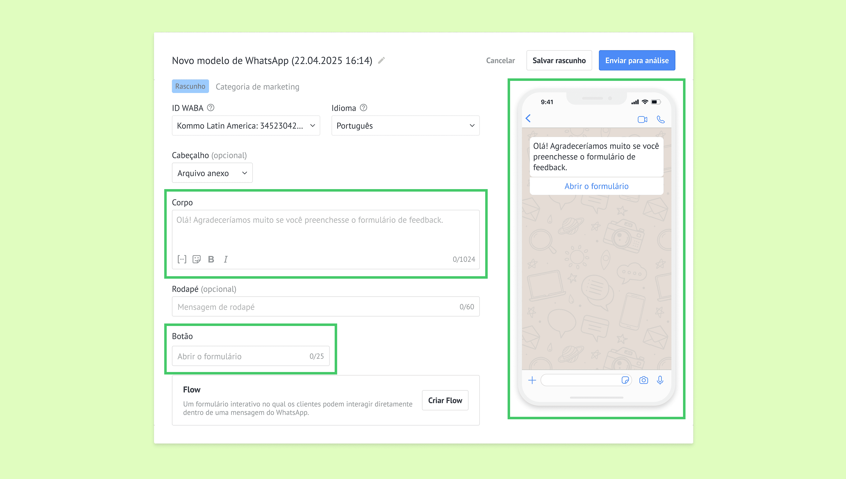 Depois de criar seu Flow, preencha o corpo e o texto do botão (é isso que o cliente vê antes de clicar para abrir o formulário).