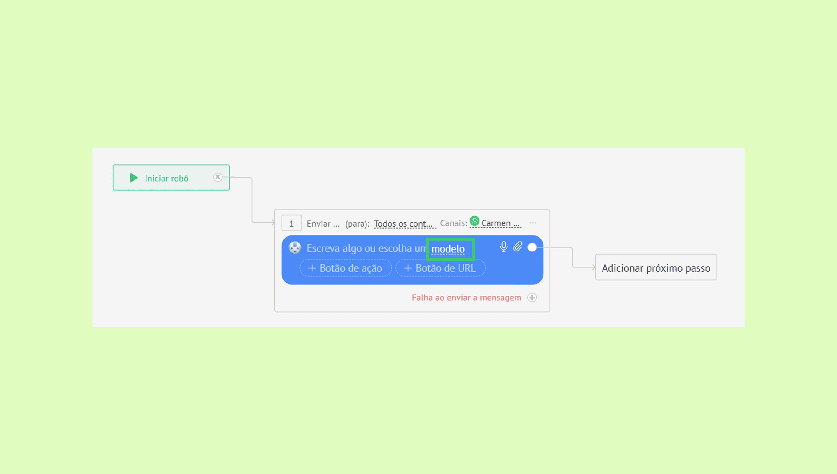 Adicione uma etapa de Mensagem e selecione o canal WhatsApp.
