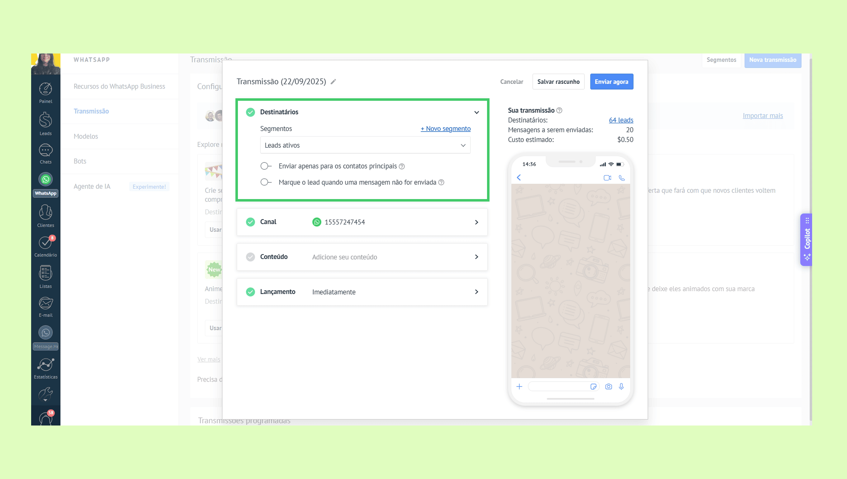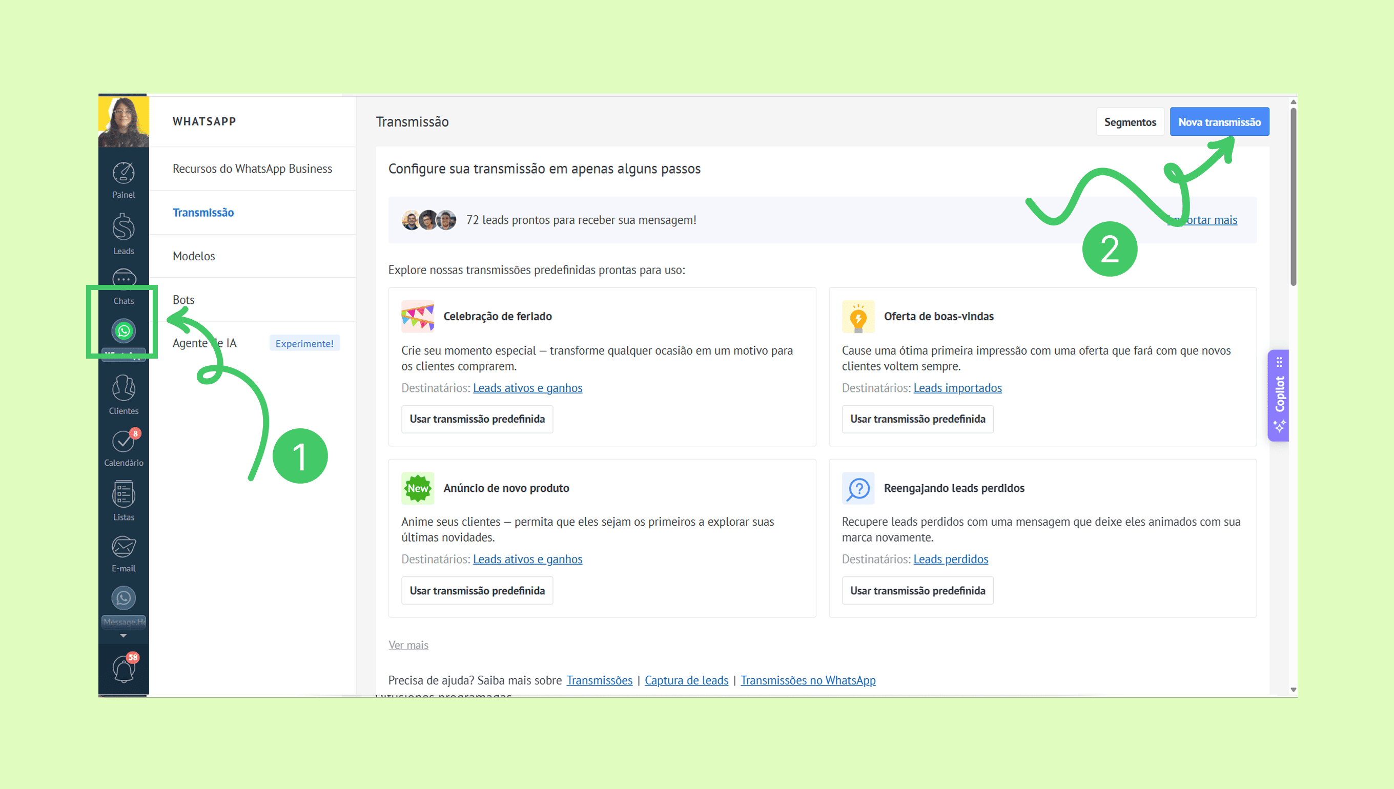Acesse WhatsApp → Transmissão → Nova transmissão.