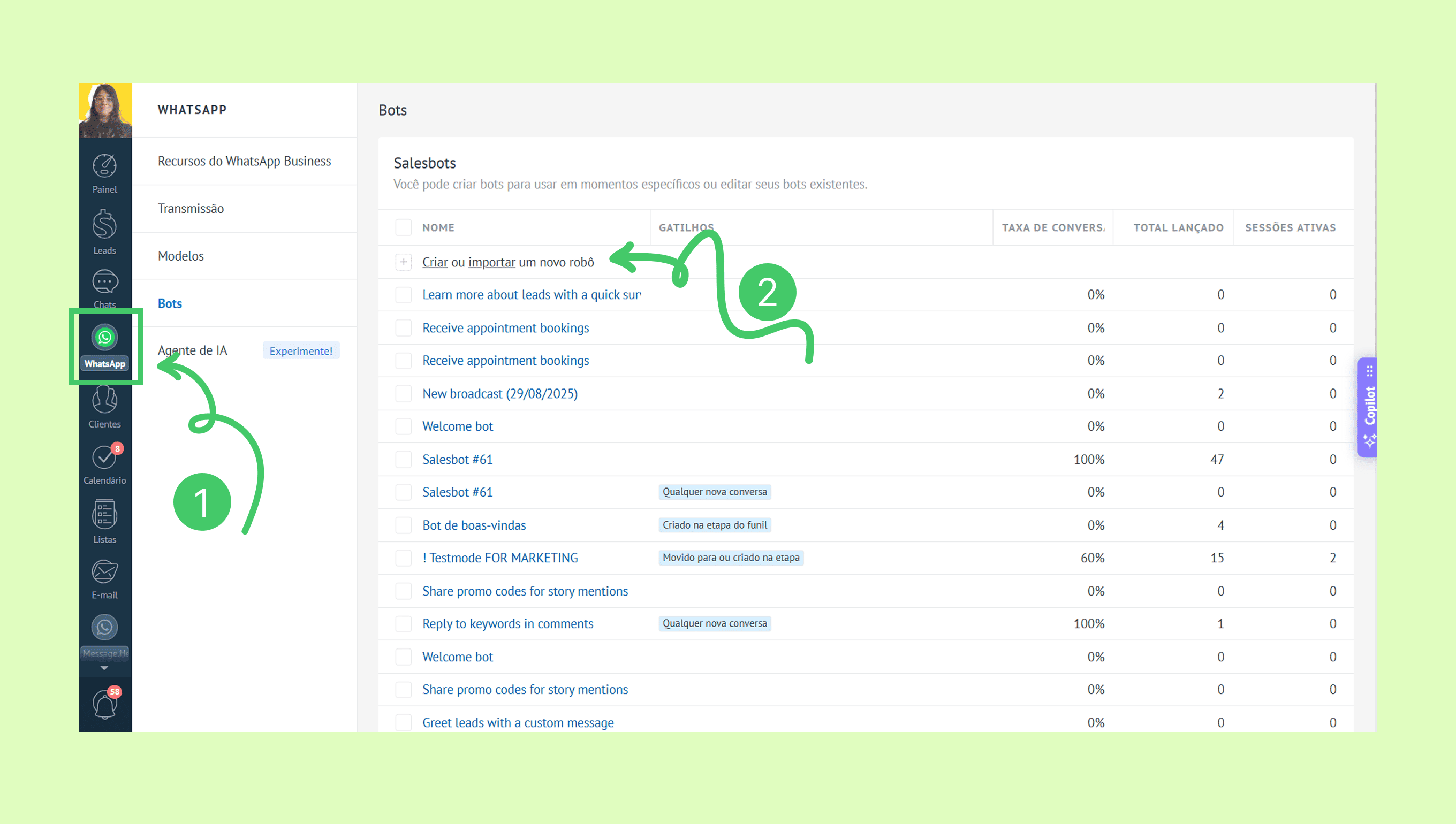 Crie um bot no WhatsApp → Bots → Criar um novo bot.