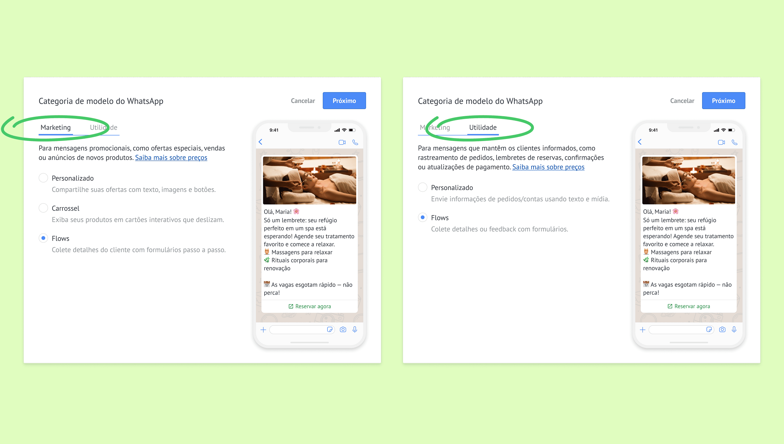 Uma janela será exibida. Escolha uma categoria de modelo — Marketing ou Utilitário. Os fluxos estão disponíveis em ambas as categorias.