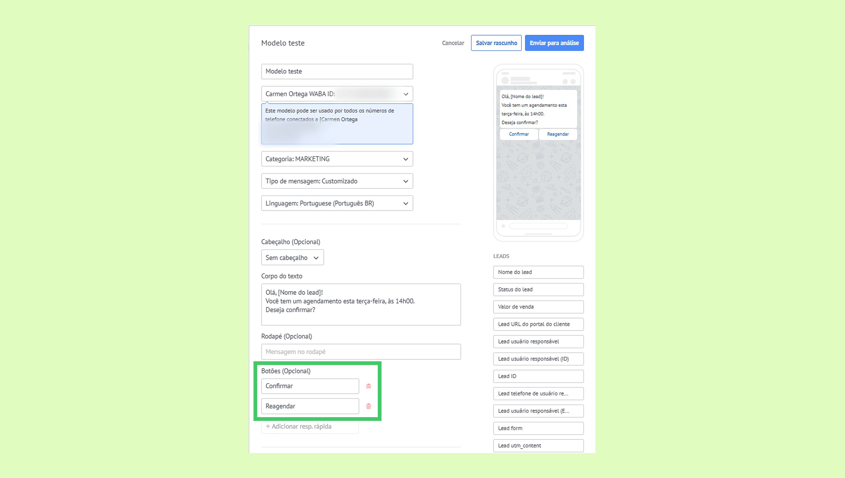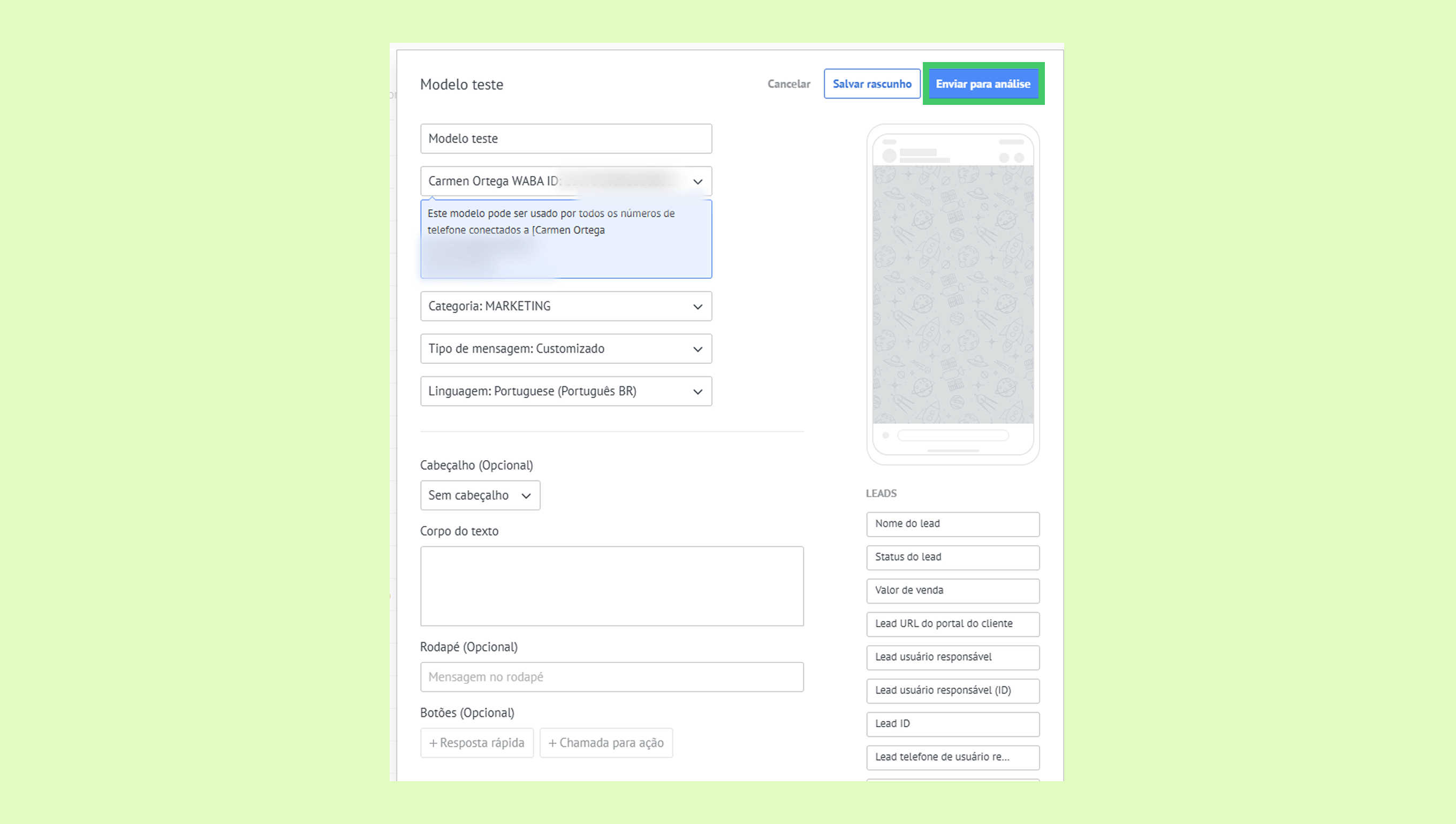 Envie para aprovação via Transmissão ou Recursos do Whatsapp Business e teste o modelo.
