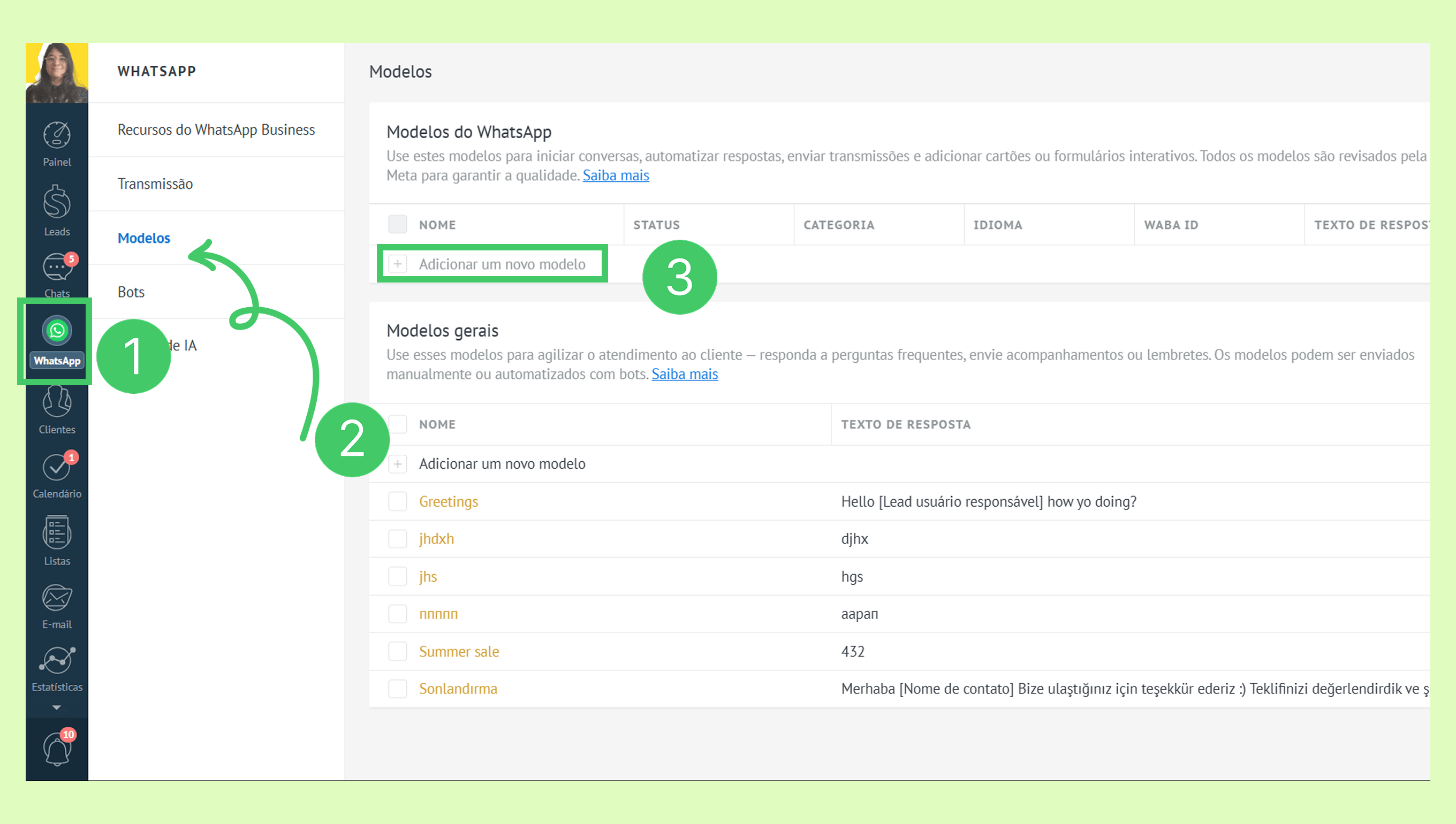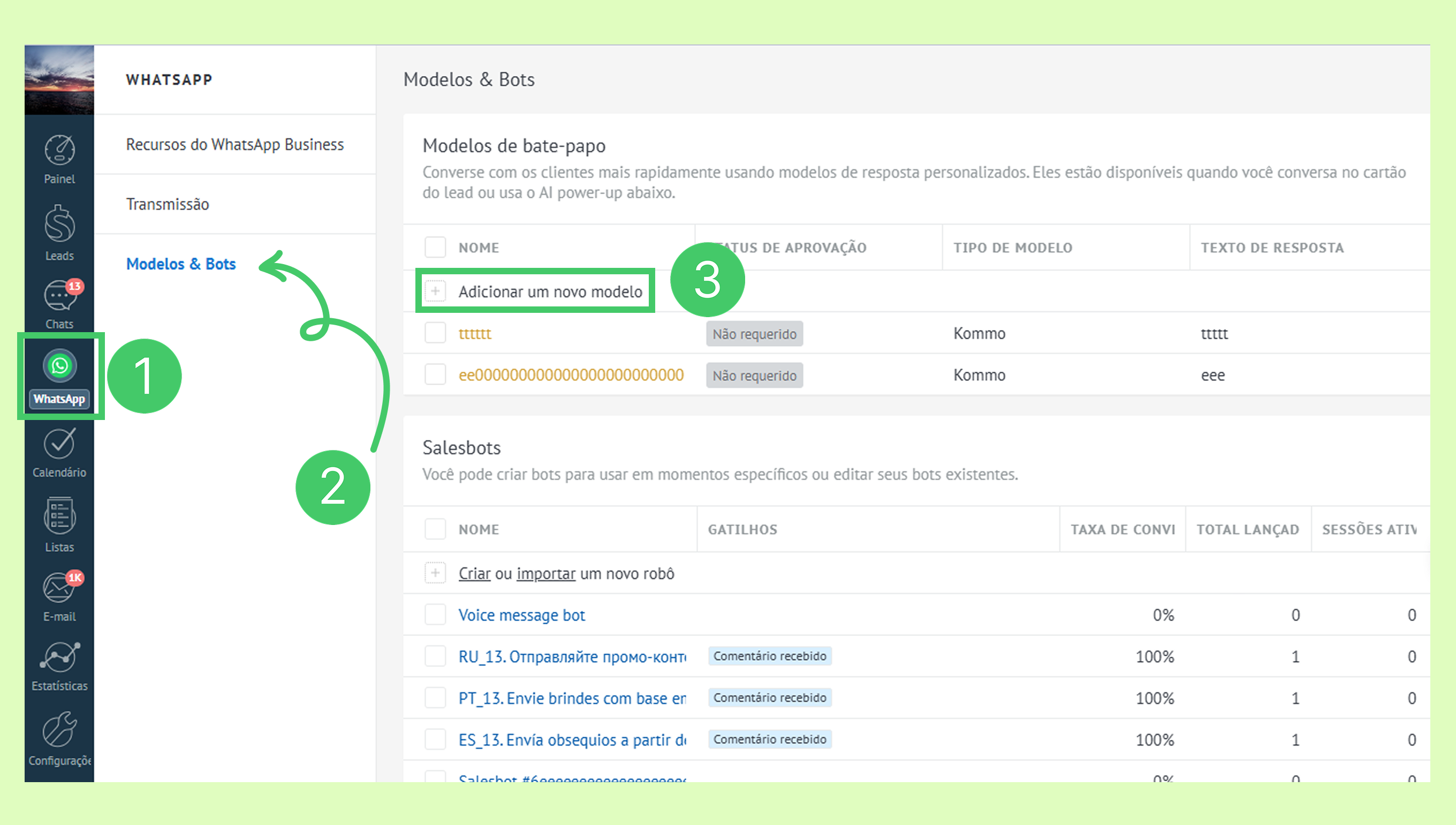 Acesse WhatsApp → Modelos → Modelos do WhatsApp na Kommo. Crie um novo modelo.