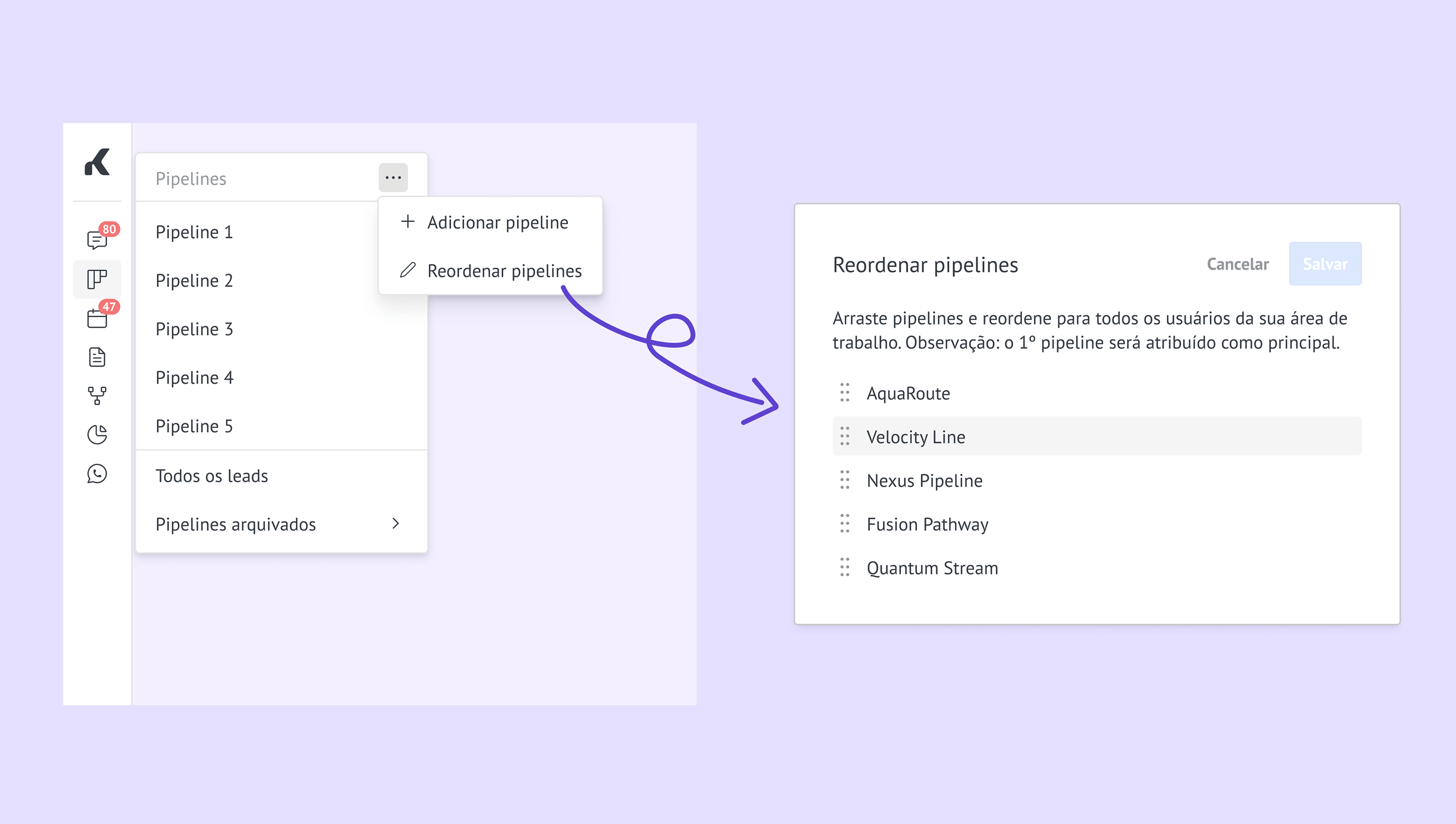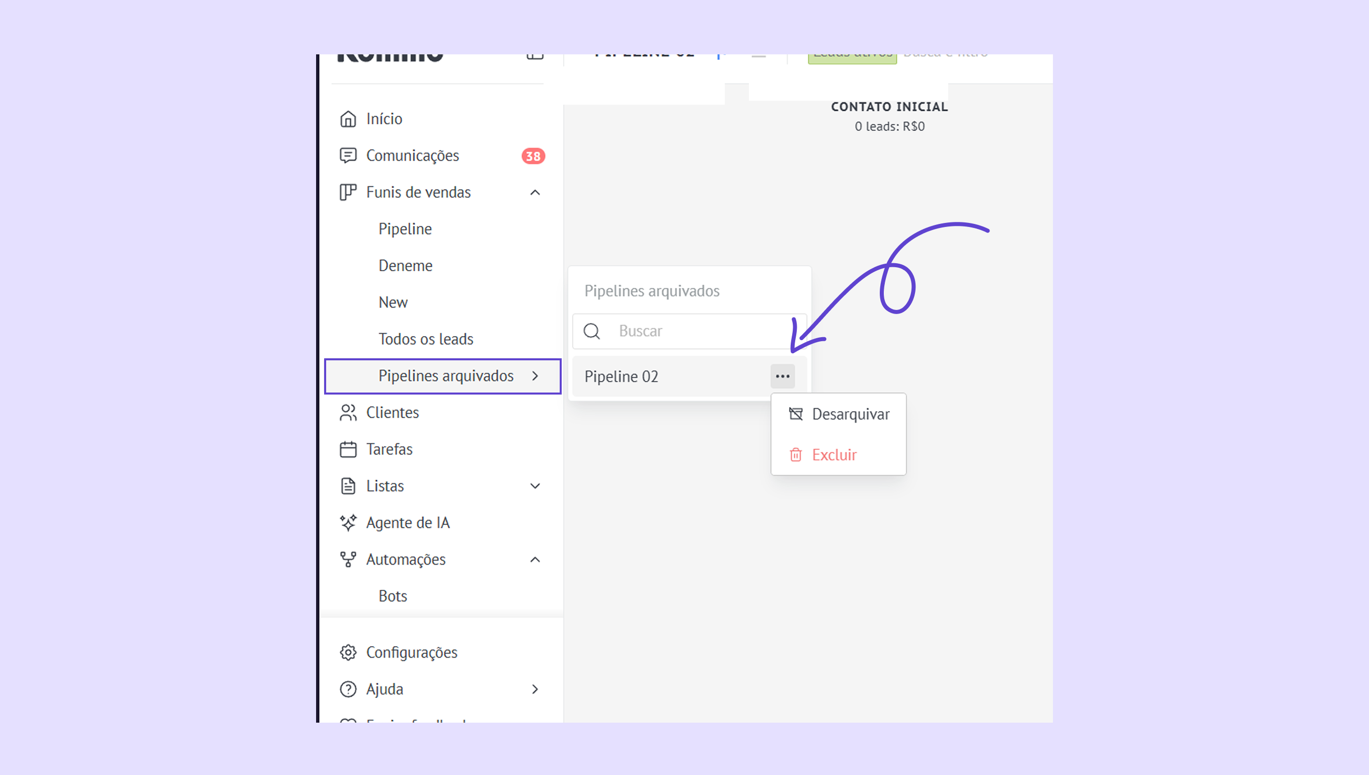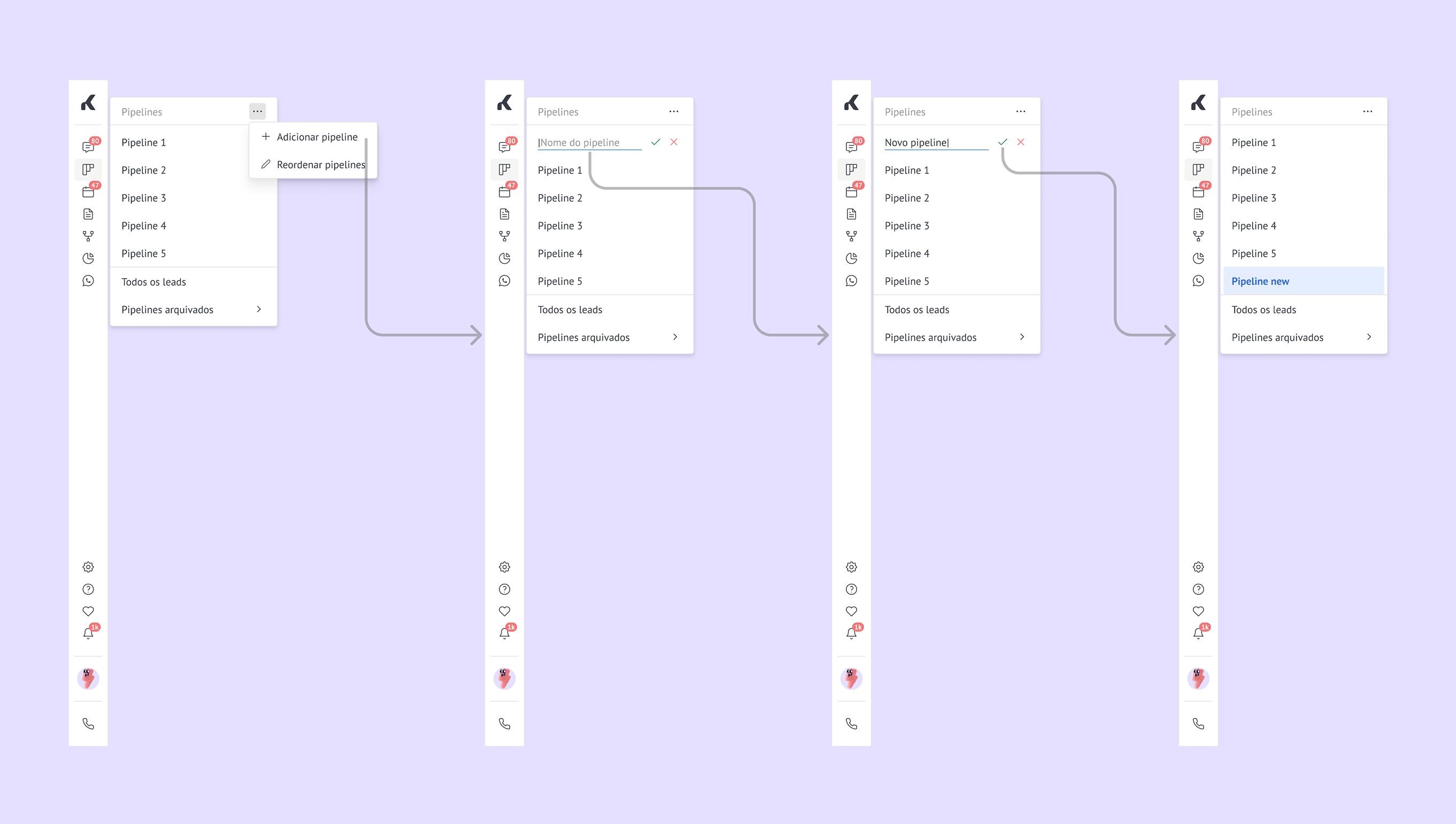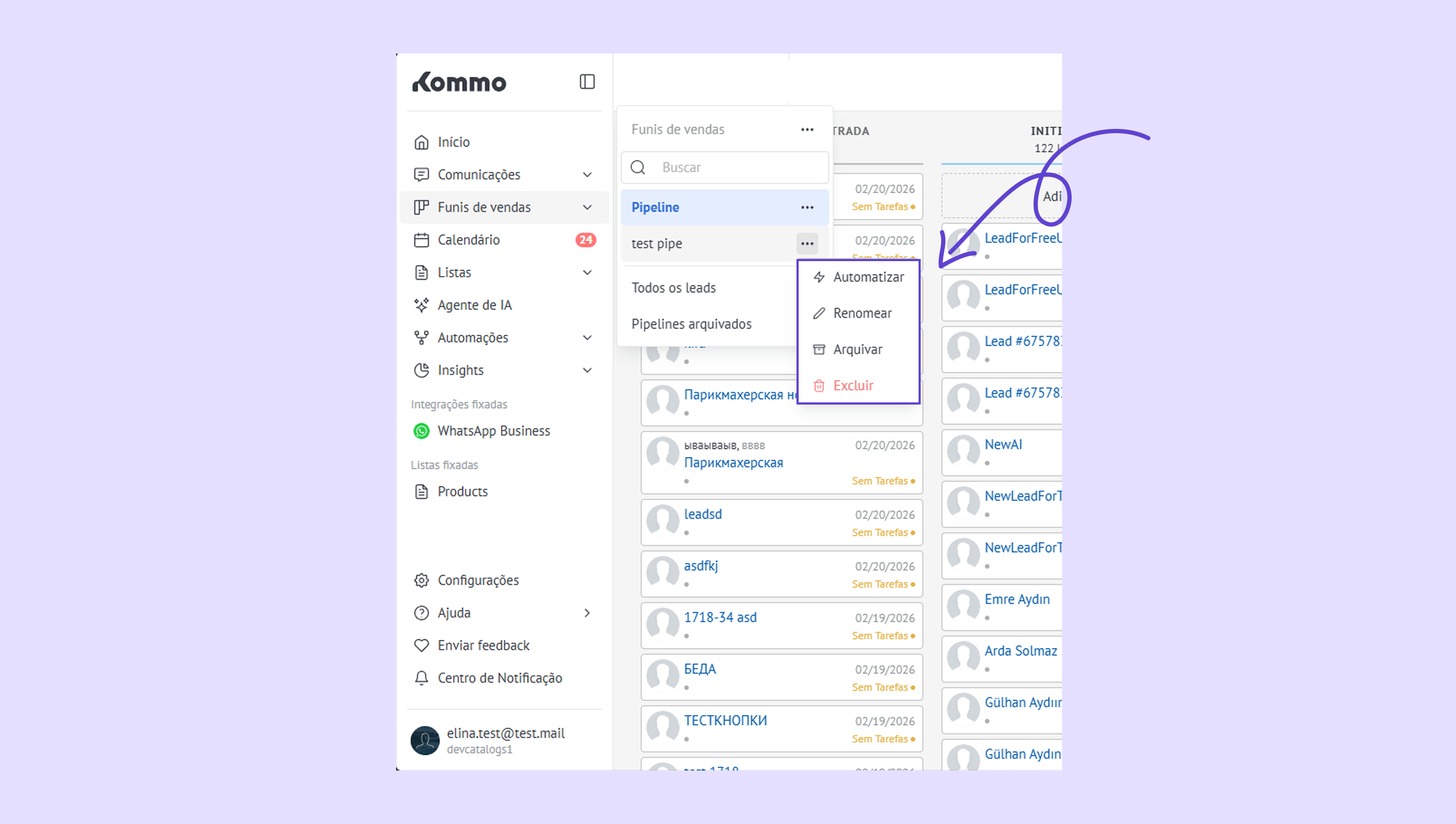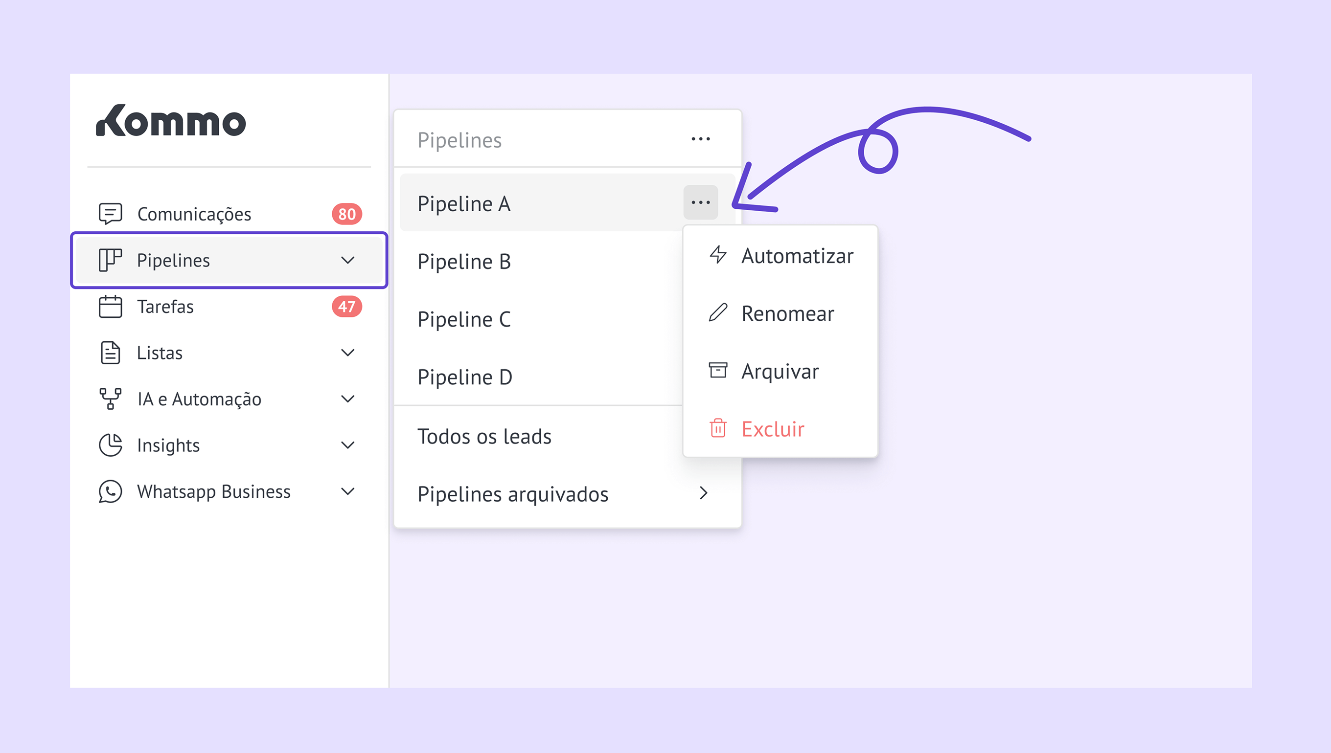 Gerencie pipelines – passe o mouse sobre o nome de um pipeline e abra o menu … para automatizar, renomear, arquivar ou excluí-lo.