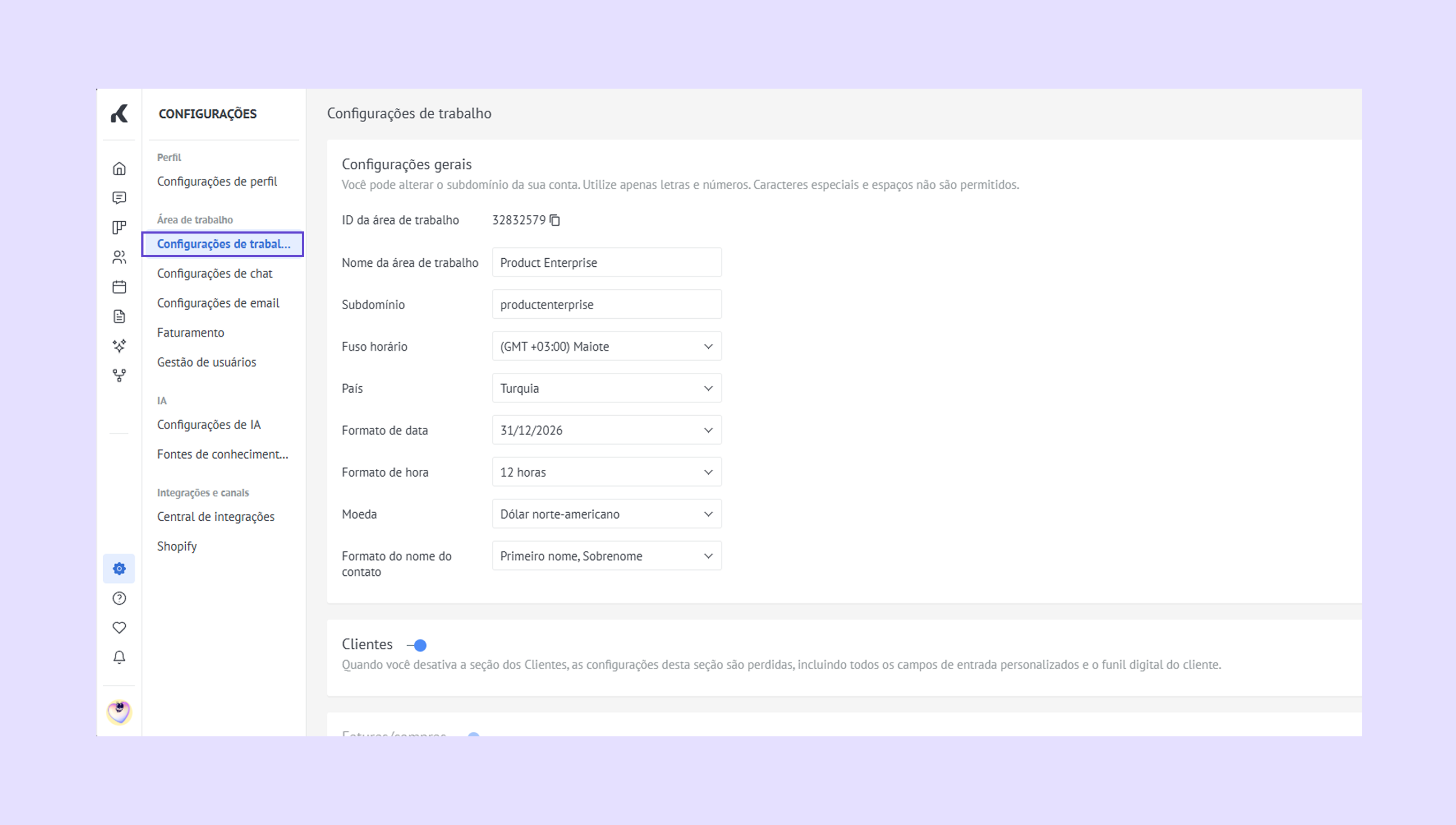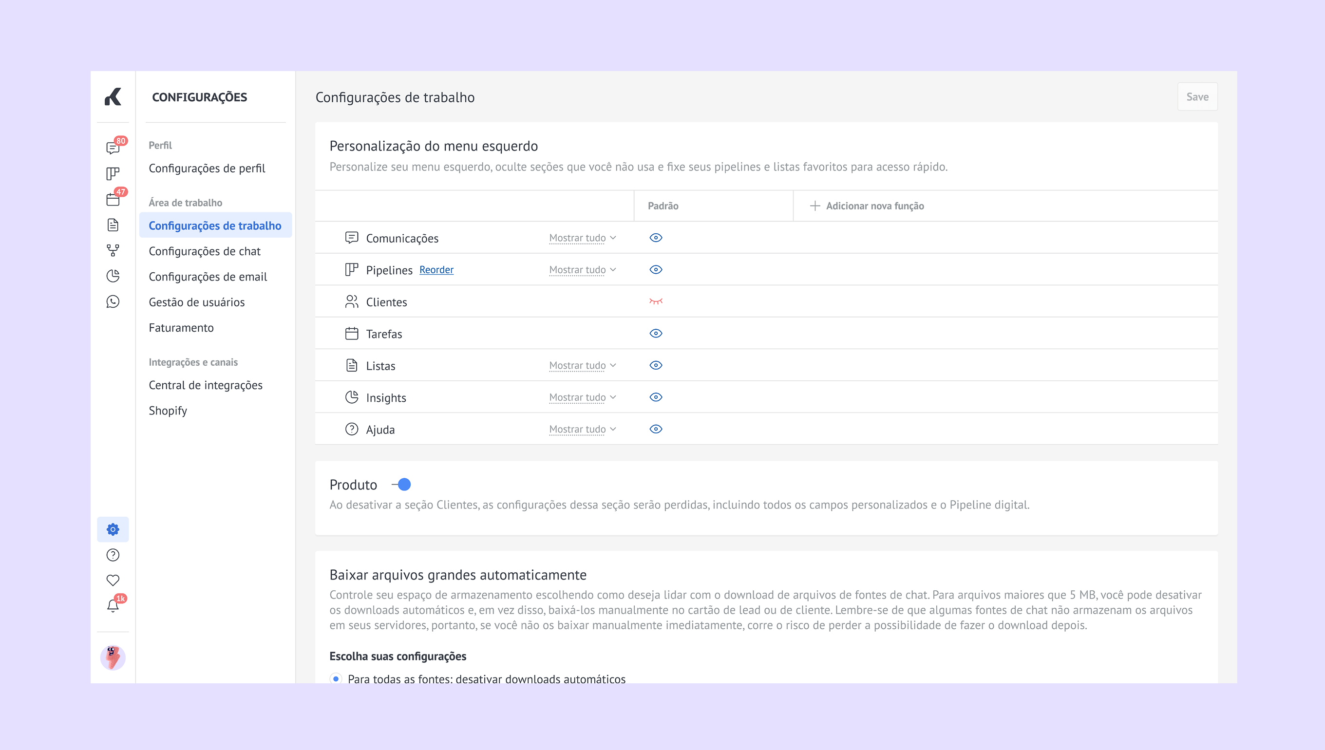 Configurações de trabalho (anteriormente Configurações gerais) – personalize sua área de trabalho para atender às necessidades da sua equipe. -