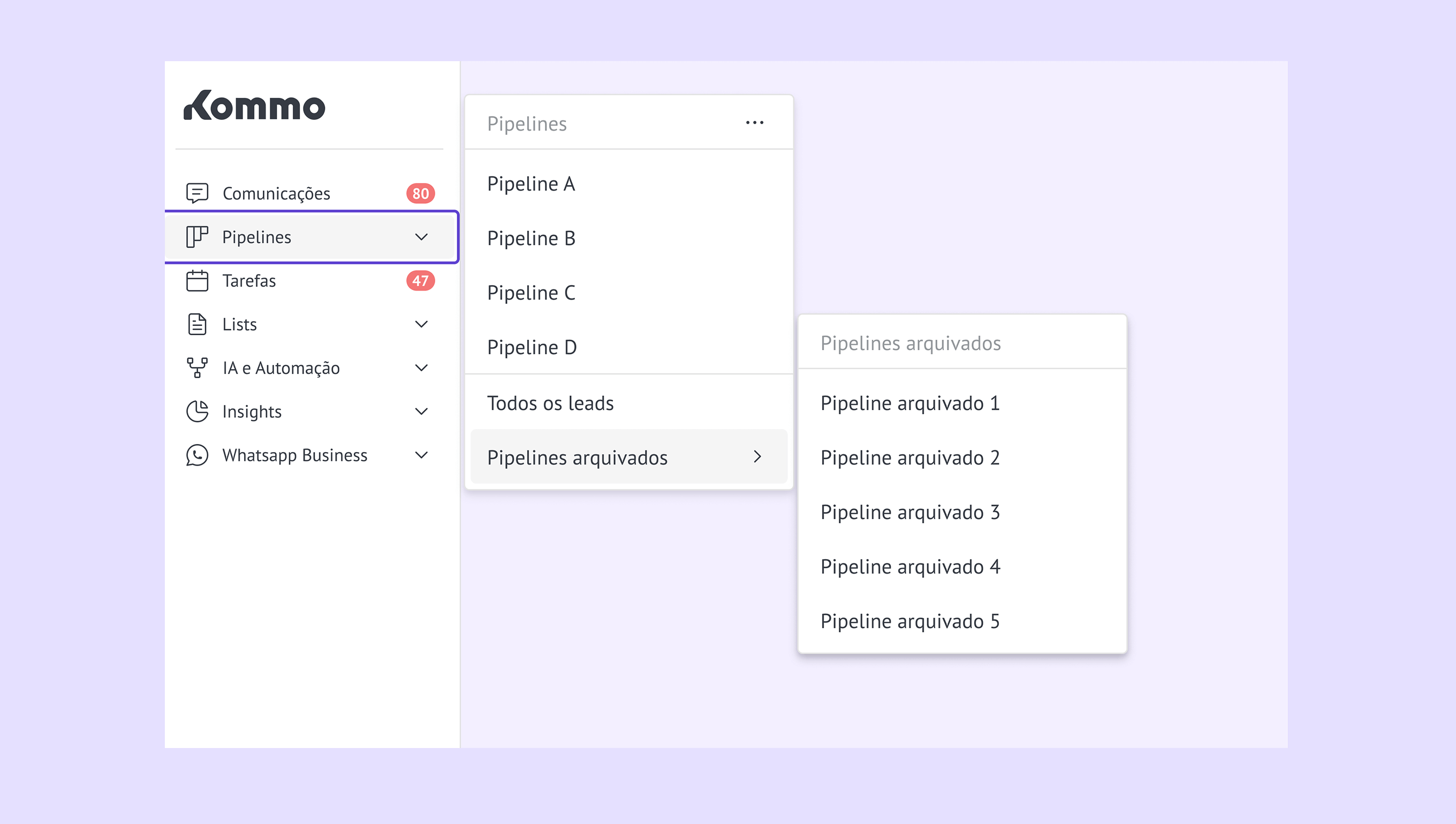 Todos os leads e arquivados – visualize todos os leads nos pipelines em Todos os leads ou verifique negócios anteriores em Pipelines arquivados.
