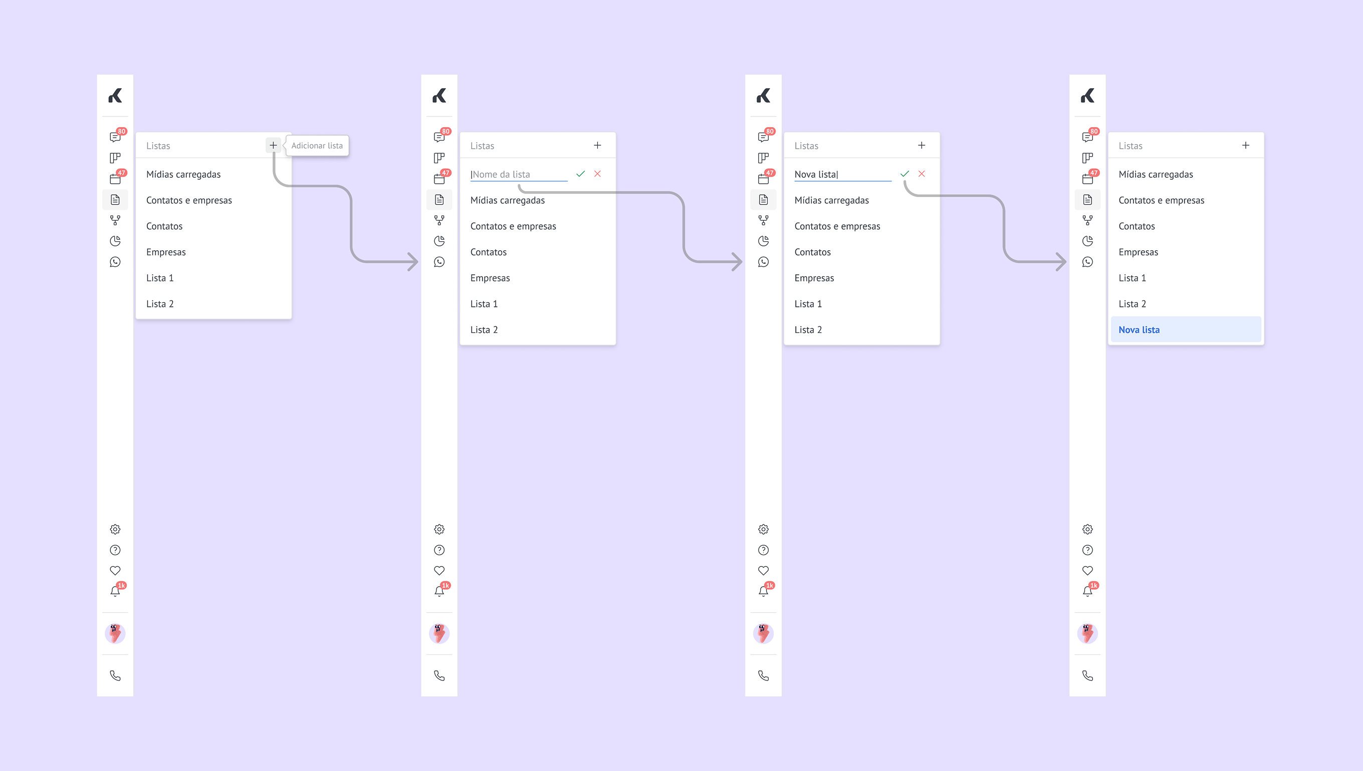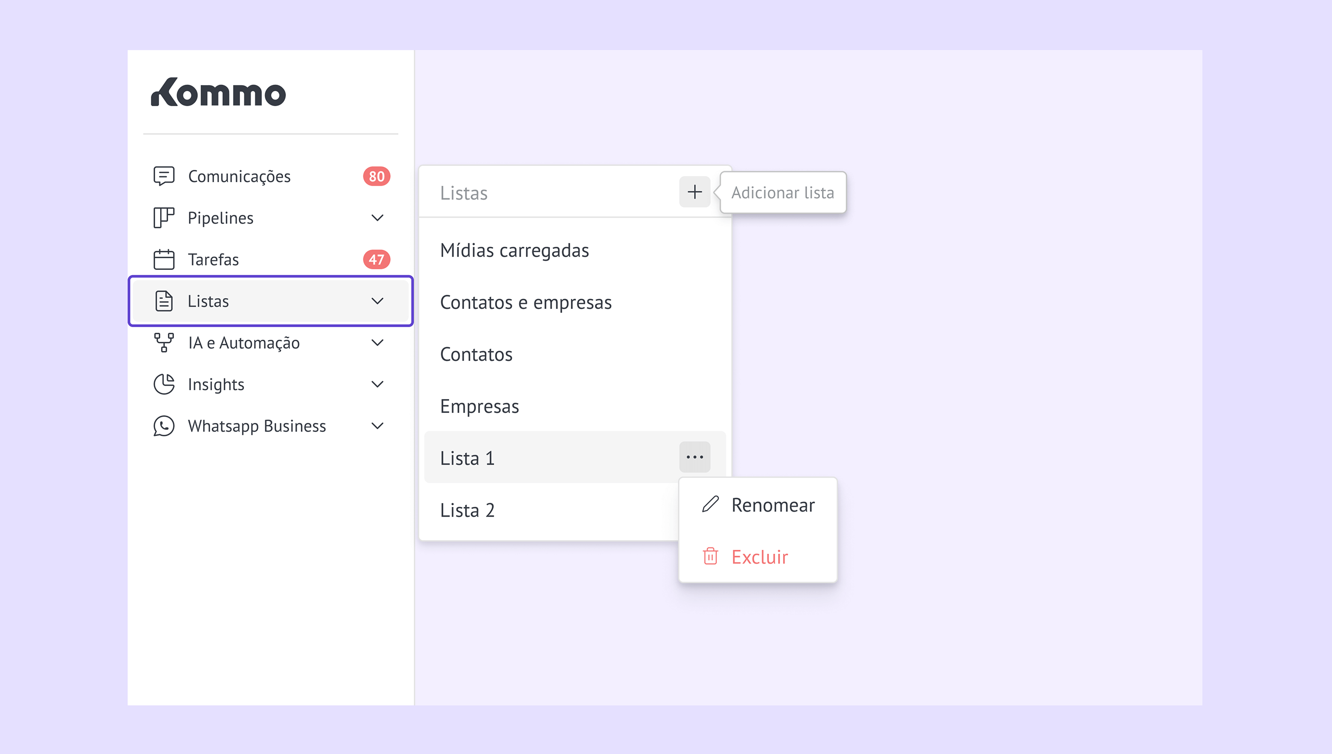 Acesse tudo – visualize uploads de mídia, listas de contatos e listas de empresas em uma seção centralizada.