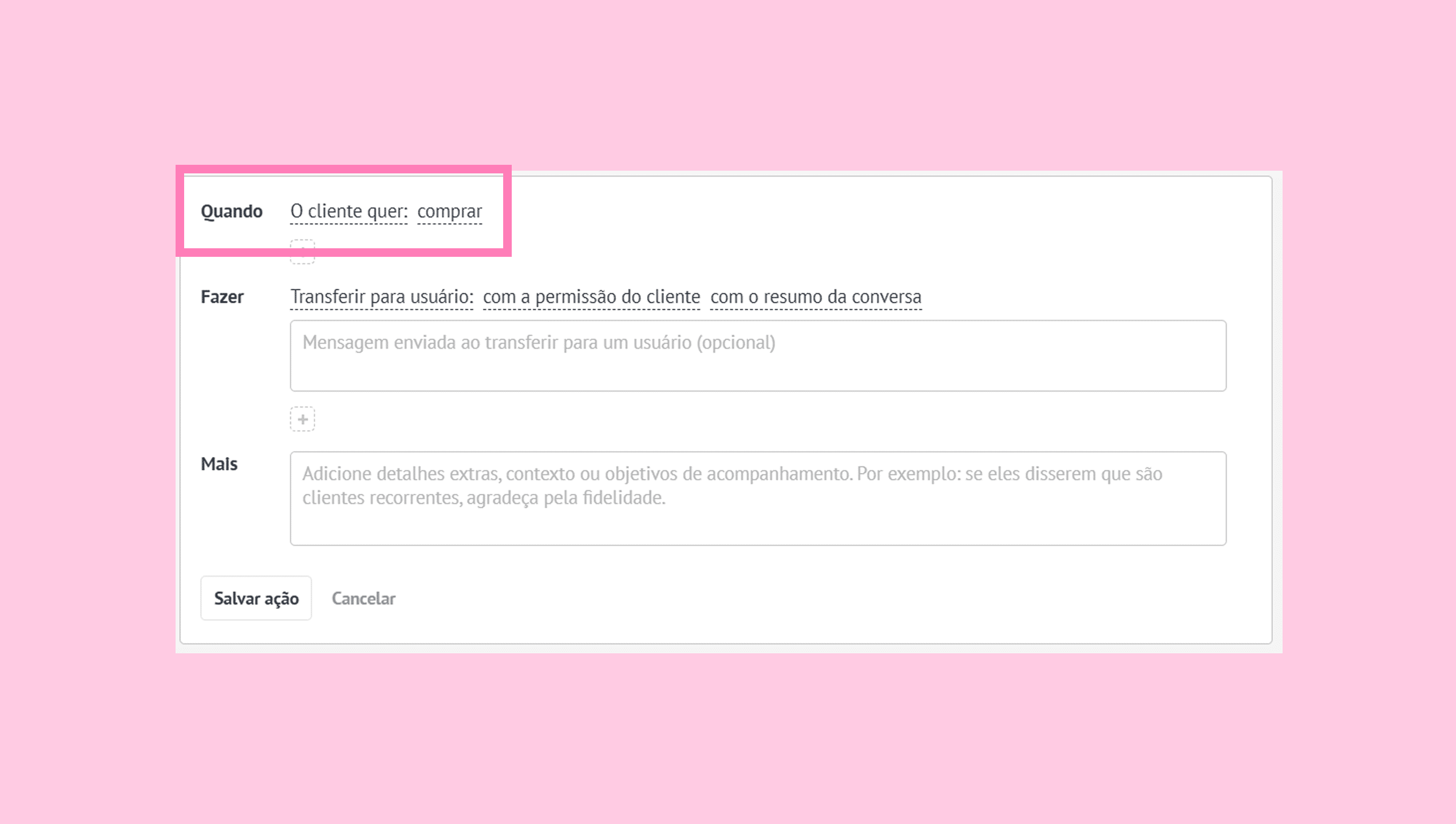 Selecione a condição QUANDO o cliente deseja: comprar. Isso ajuda o agente de IA a reconhecer clientes que podem precisar de ajuda para escolher um produto ou serviço.