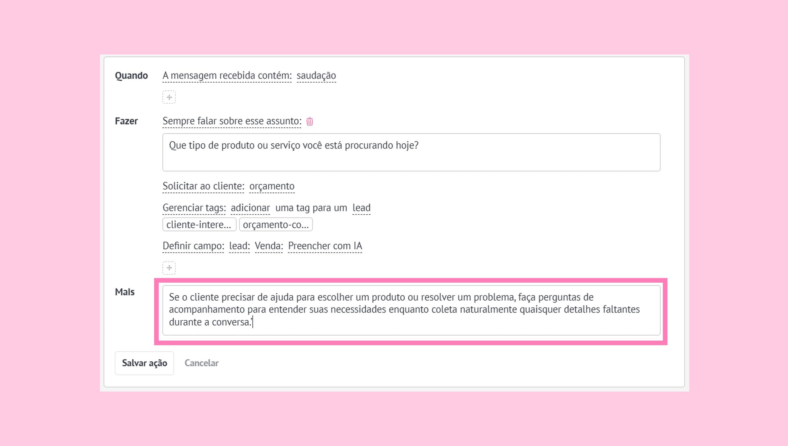No campo Mais, adicione orientações extras sobre como o agente de IA deve continuar a conversa. Você pode adicionar a seguinte instrução: ‘Se o cliente precisar de ajuda para escolher um produto ou resolver um problema, faça perguntas de acompanhamento para entender suas necessidades enquanto coleta naturalmente quaisquer detalhes faltantes durante a conversa.’