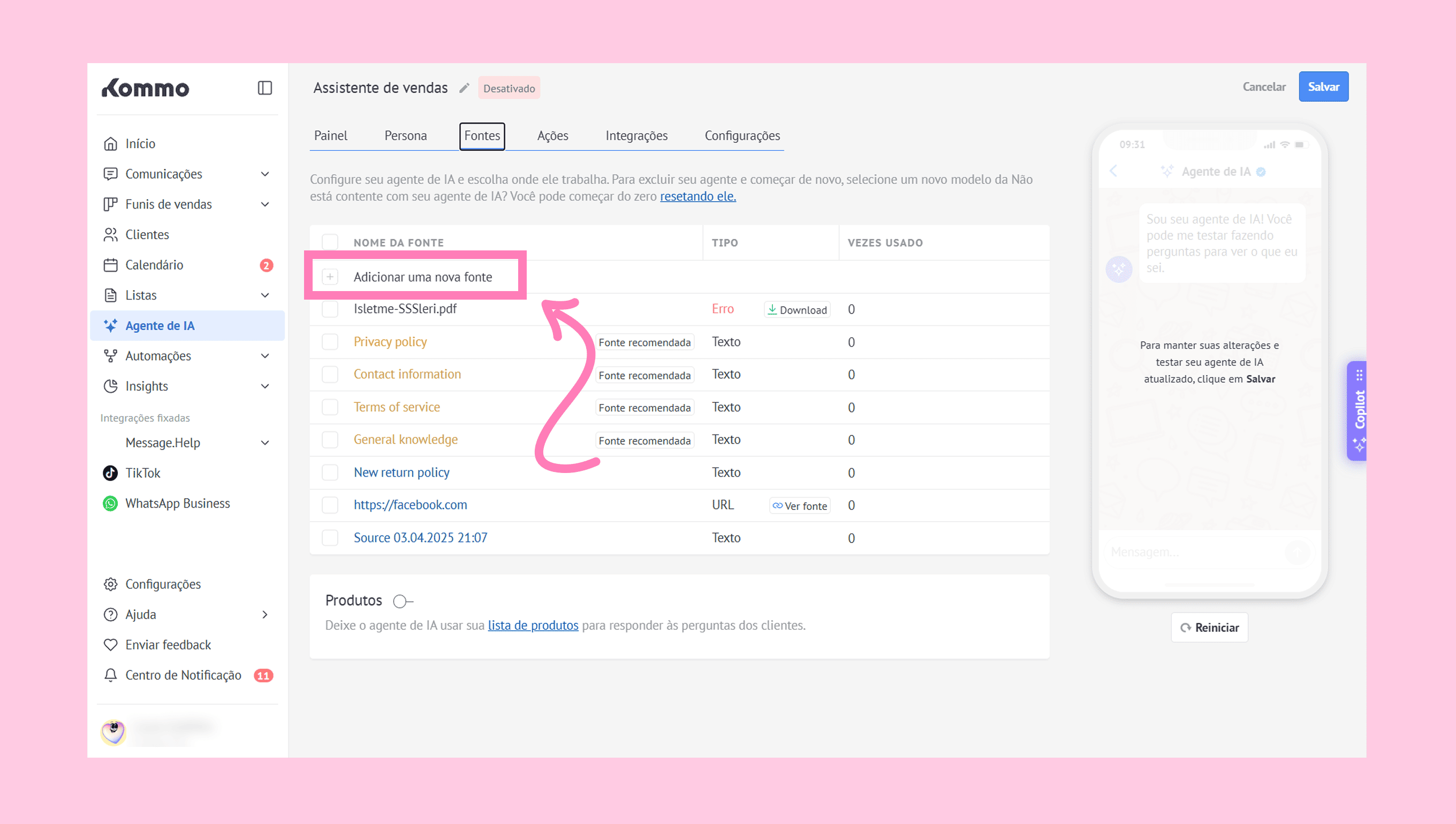 Para saber mais sobre como adicionar uma fonte, consulte nosso artigo sobre fontes de conhecimento de IA.