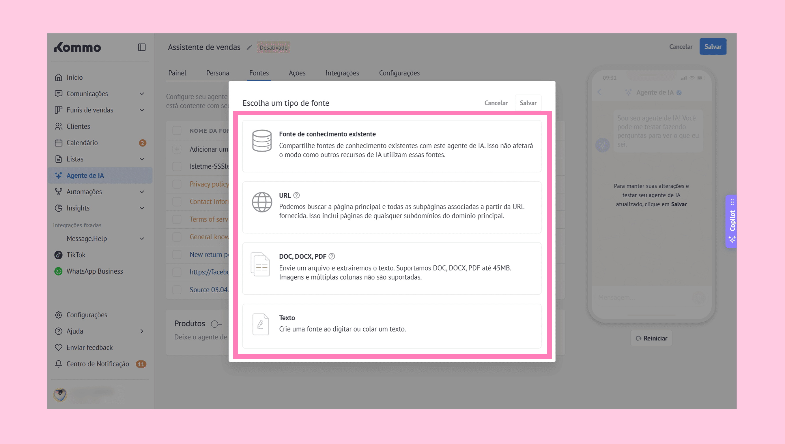 Escolha um tipo de fonte para adicionar informações relevantes sobre o seu negócio. Isso permitirá que o agente de IA forneça respostas com base nas informações da sua empresa (por exemplo, serviços oferecidos, preços, horário de funcionamento ou perguntas frequentes).