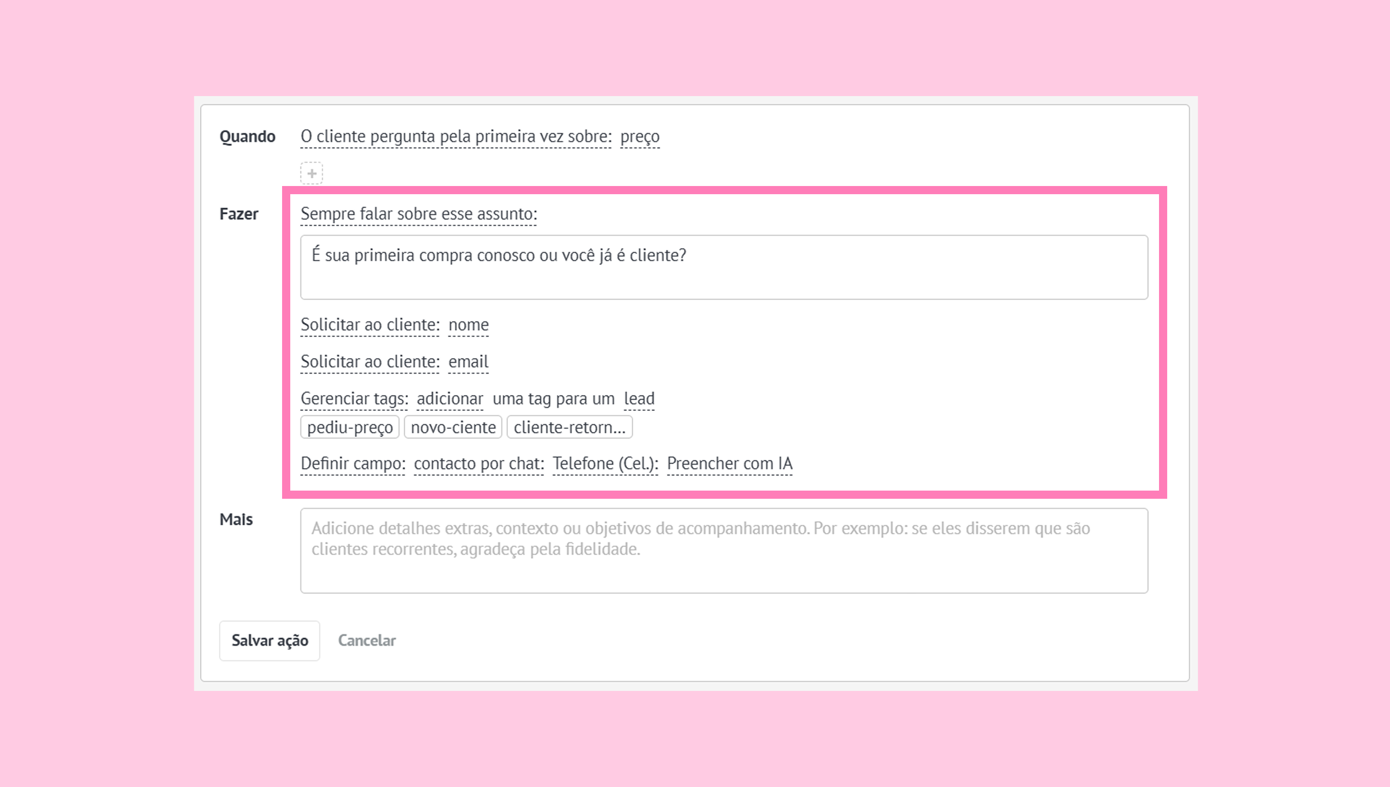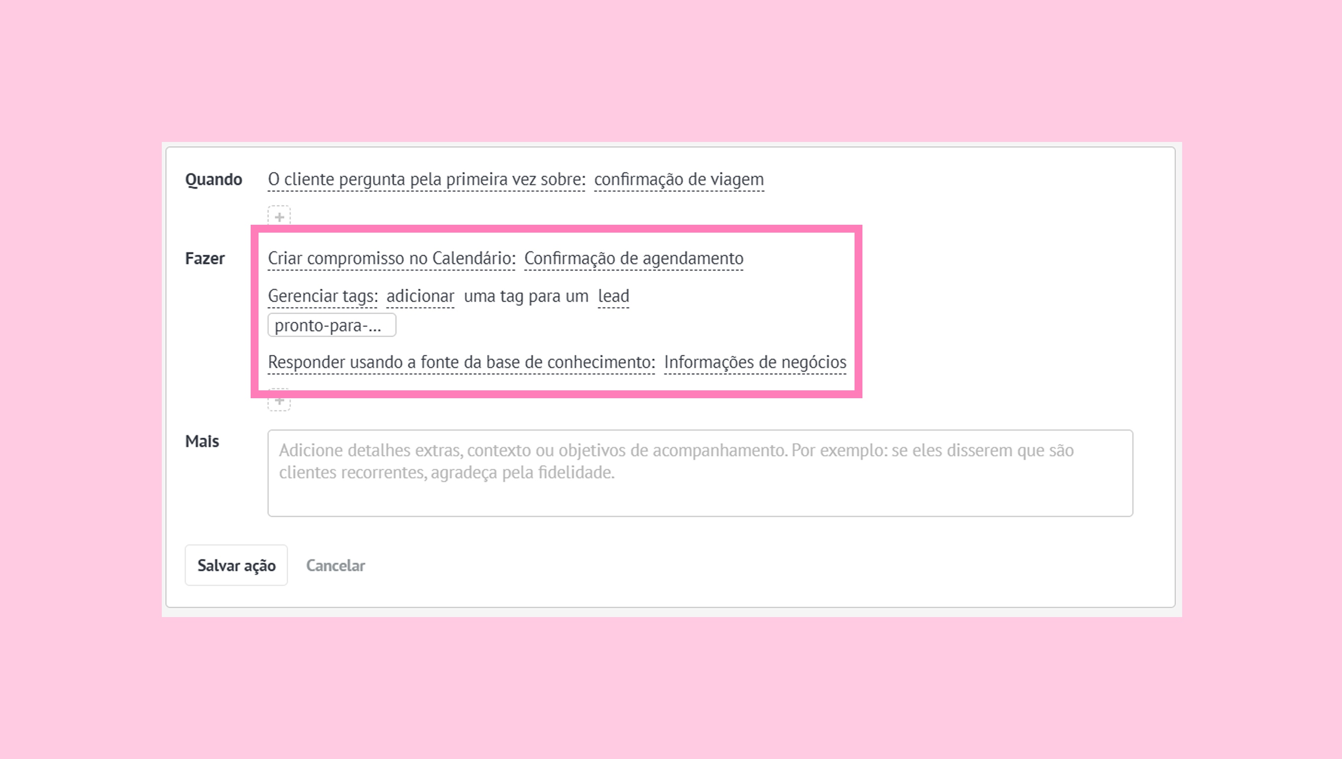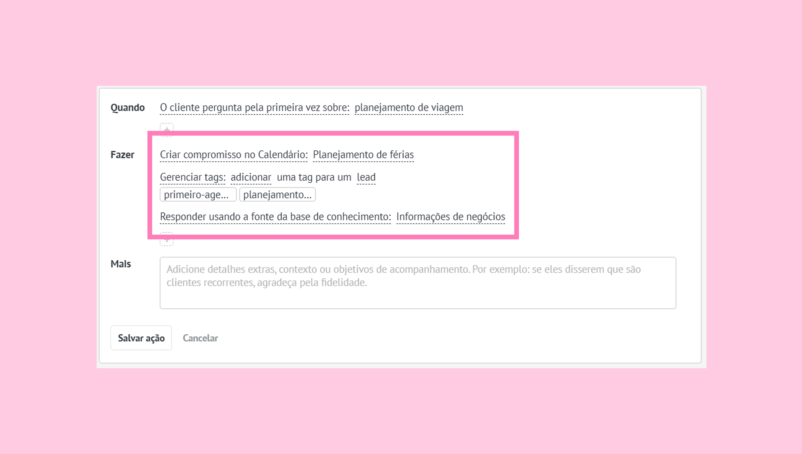 FAZER — ações que o agente de IA executará quando as condições forem atendidas.