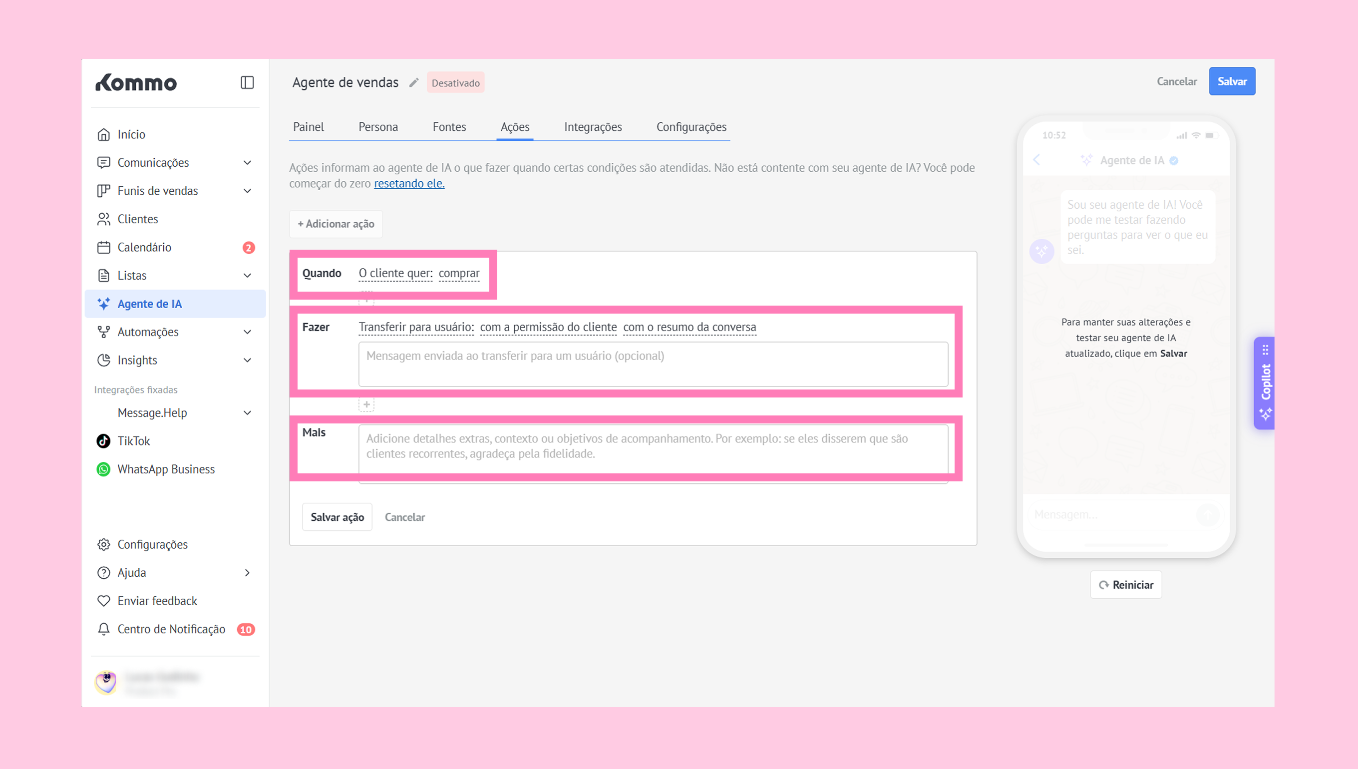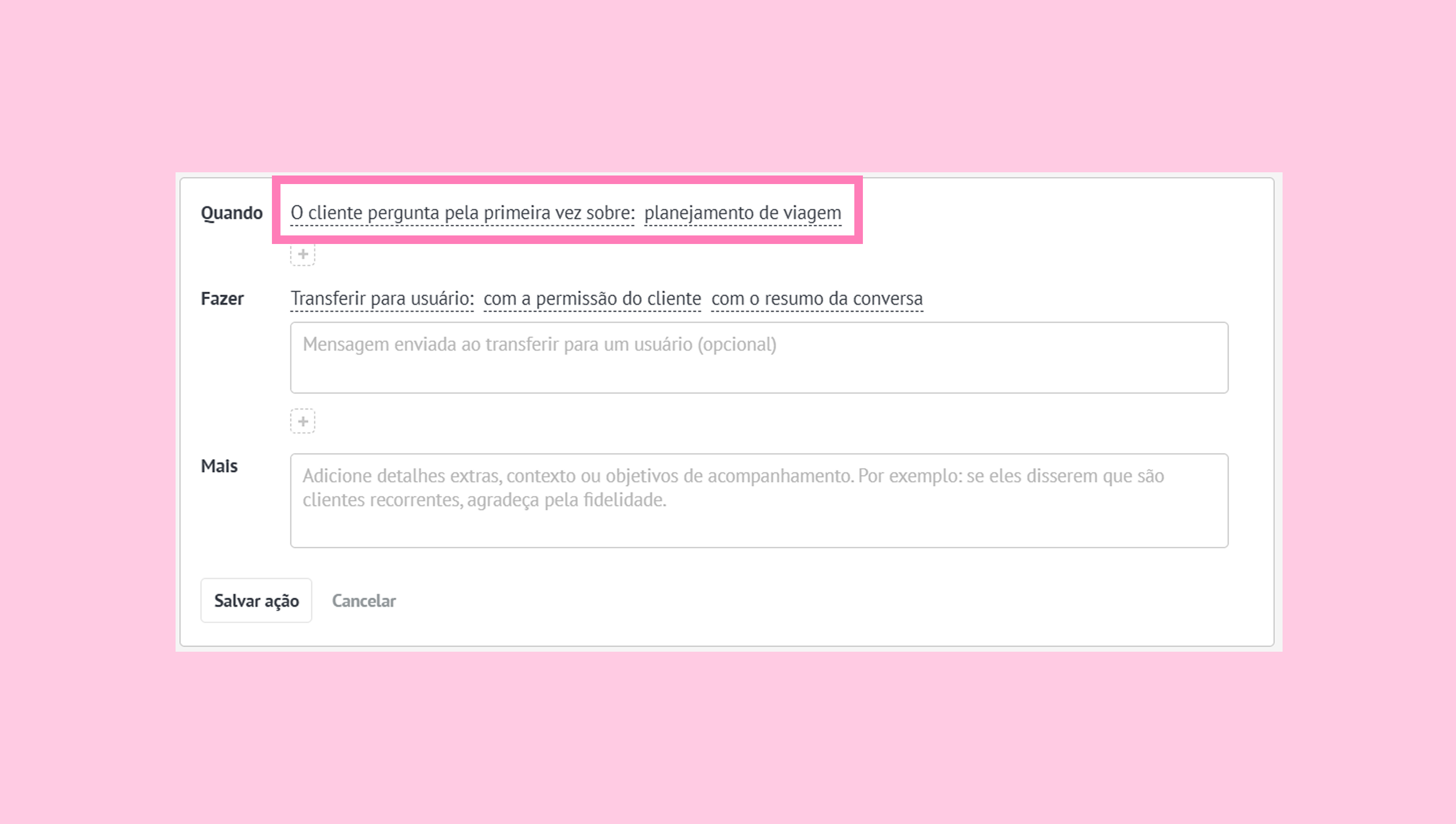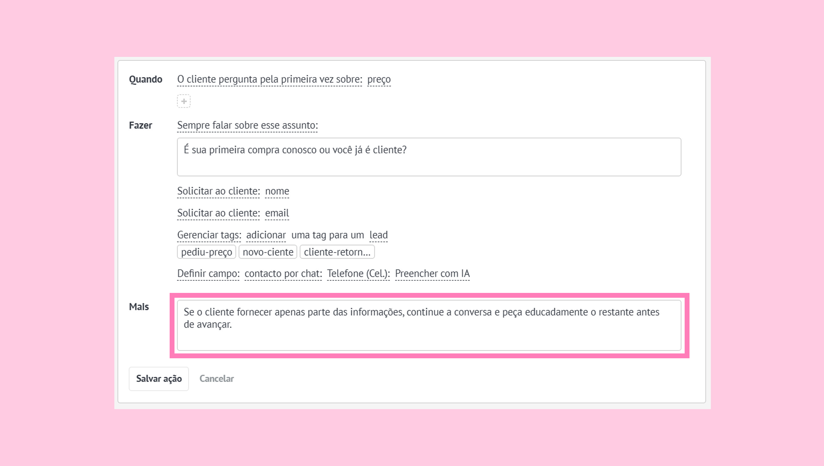 FAZER — ações que o agente de IA executará quando as condições forem atendidas.