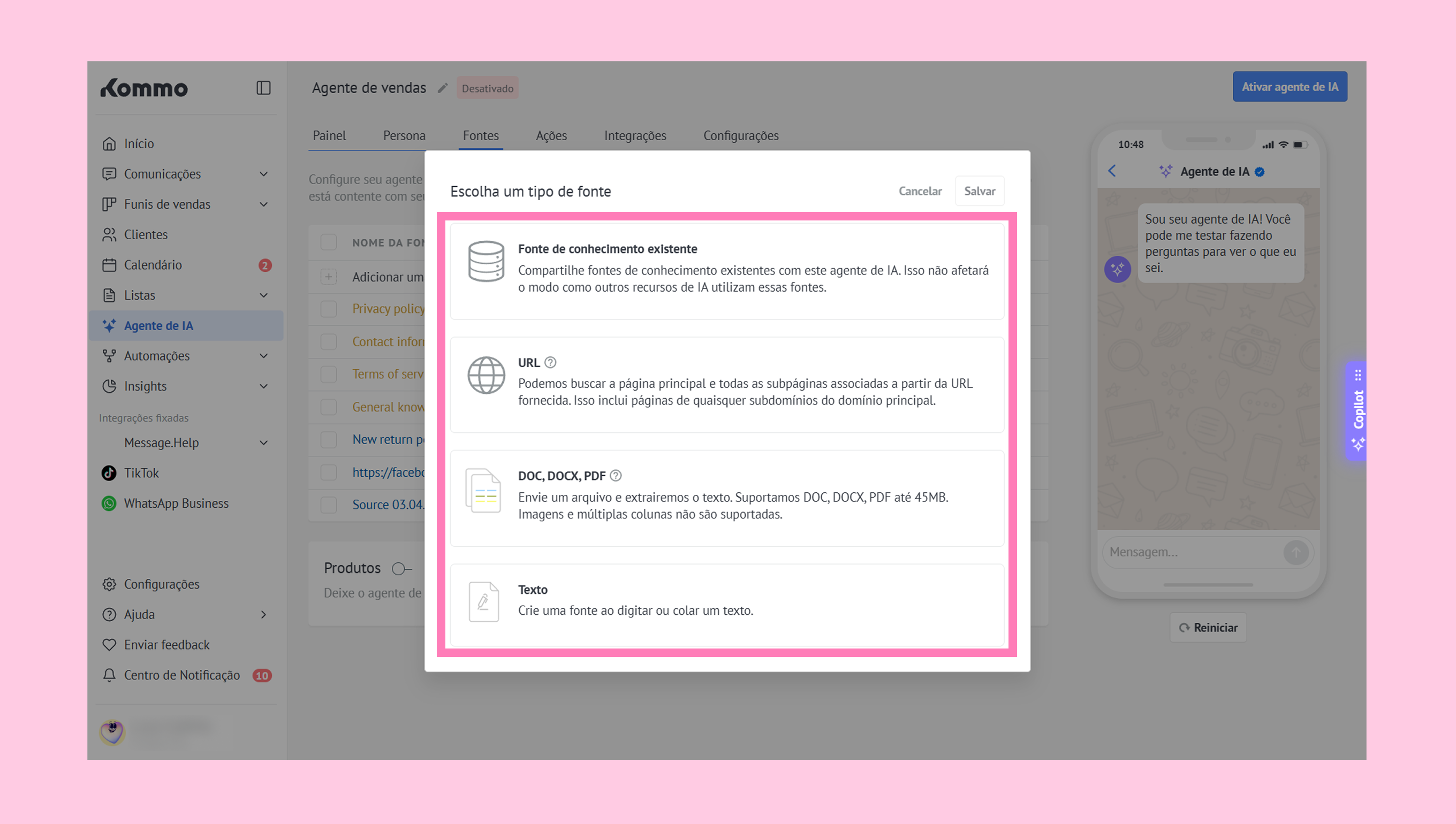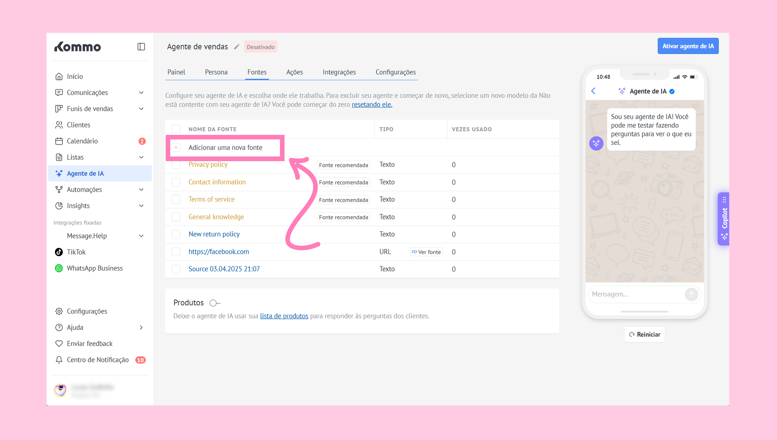 Para ajudar o agente de IA a entender seus serviços e responder com mais precisão, vá até a aba Fontes → clique em + Adicionar nova fonte de conhecimento.