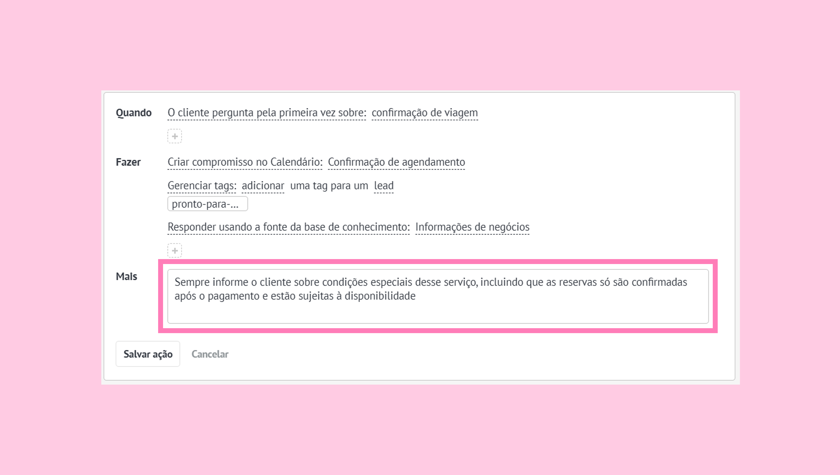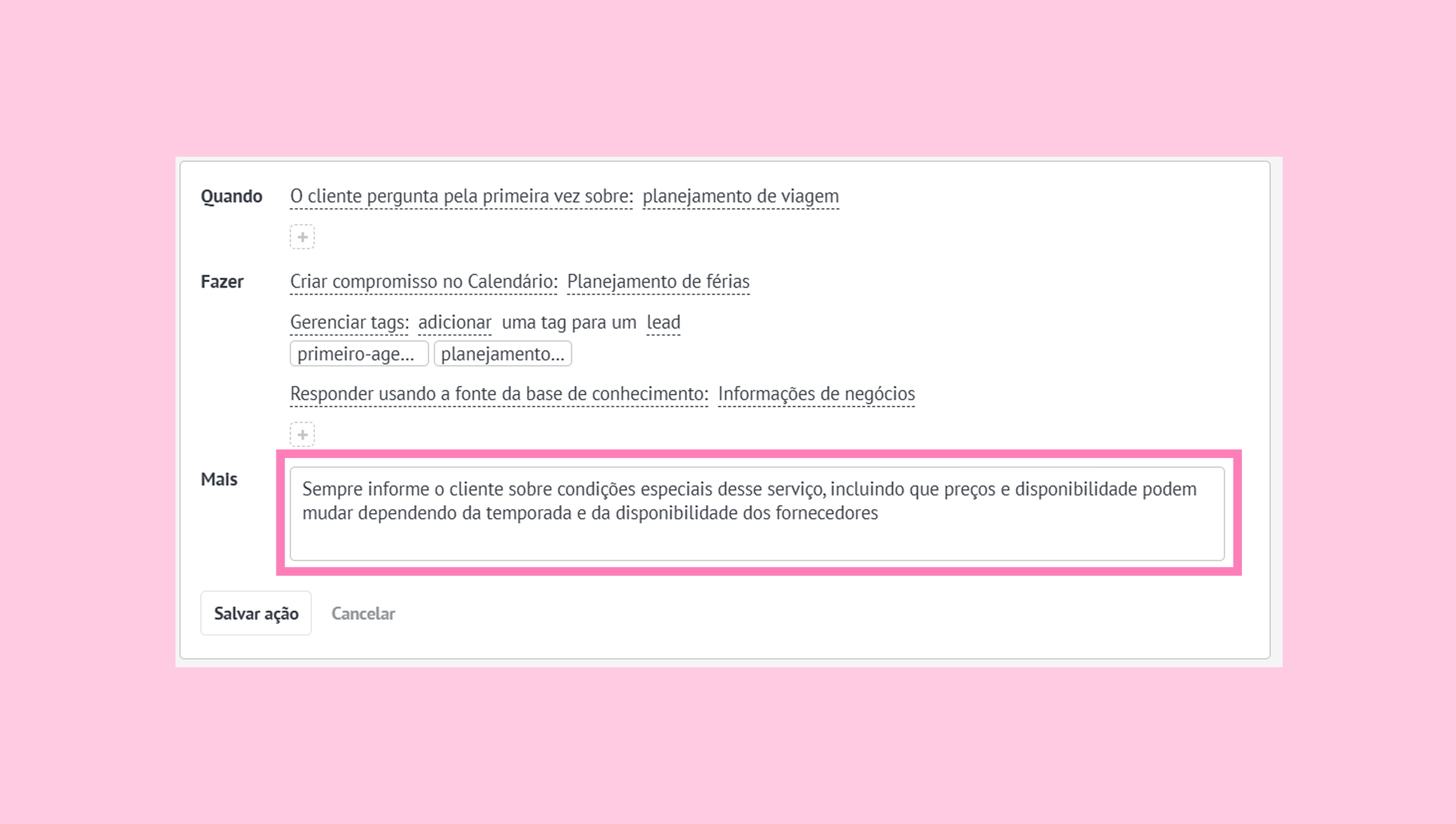 3. No campo Mais, adicione instruções mais detalhadas, como: ‘Sempre informe o cliente sobre condições especiais desse serviço, incluindo que preços e disponibilidade podem mudar dependendo da temporada e da disponibilidade dos fornecedores’.