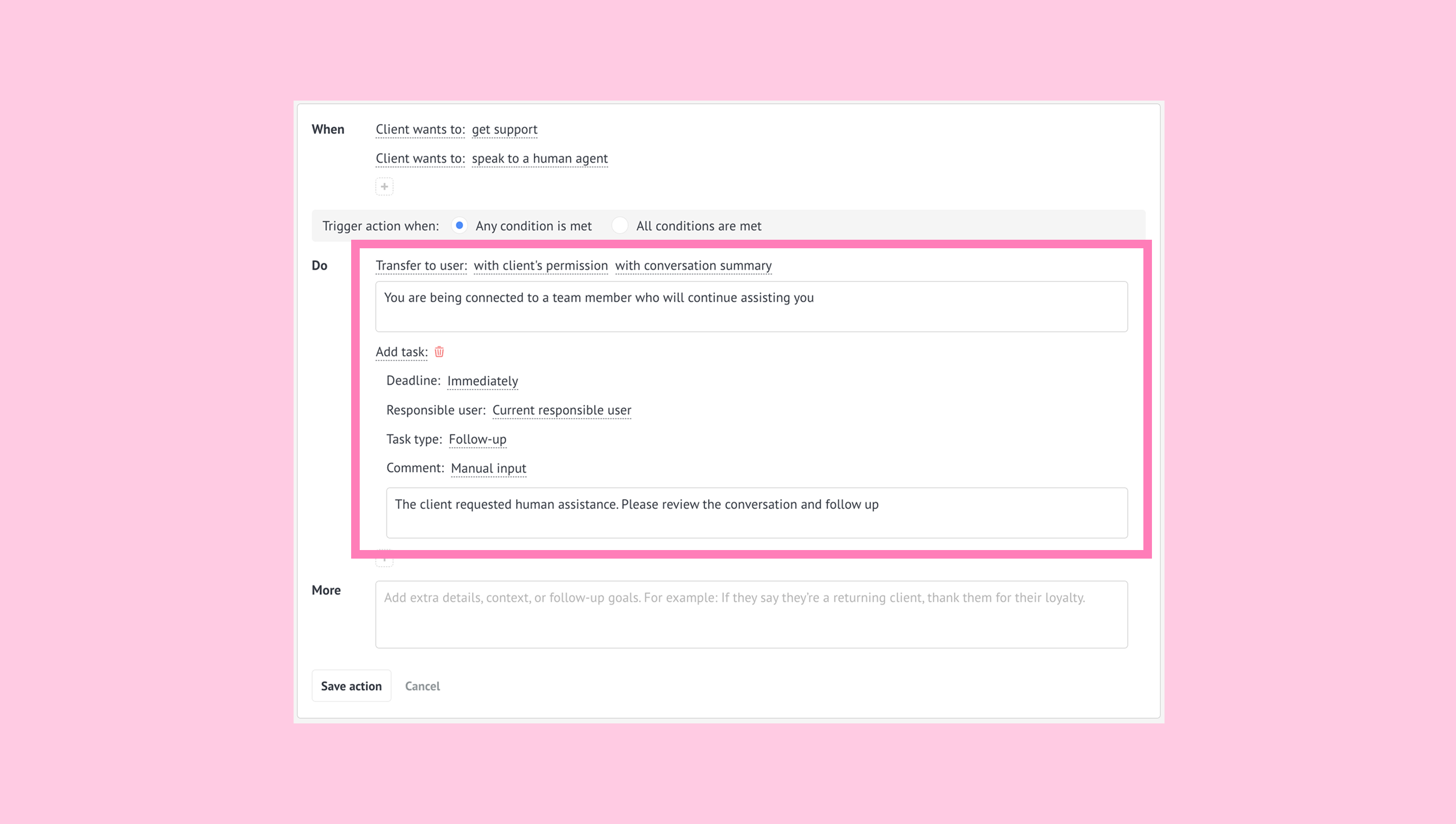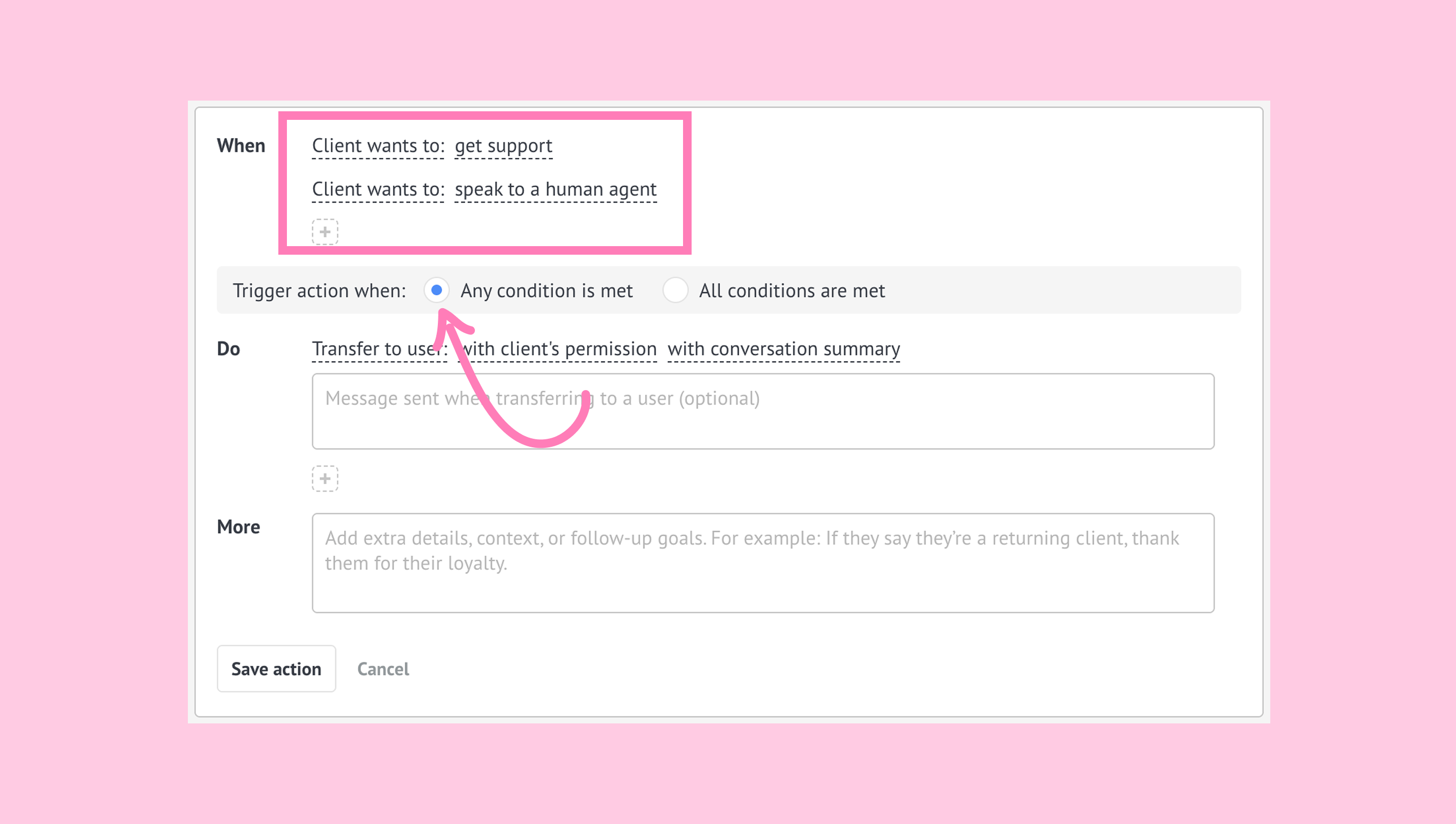 Defina a ação para ser executada quando Qualquer condição é atendida. Isso ajuda o agente de IA a reconhecer diferentes solicitações que precisam de assistência humana.