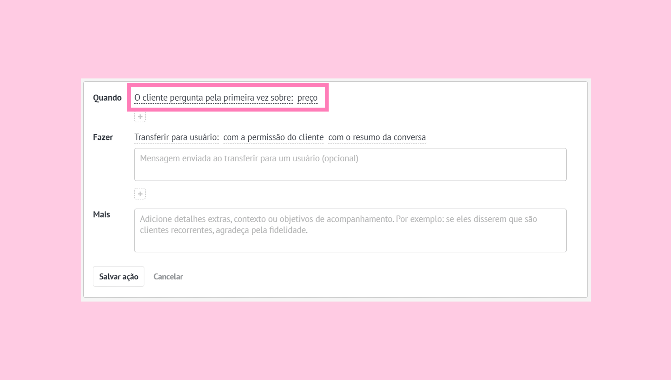 Escolha a condição QUANDO O cliente pergunta pela primeira vez sobre: preço. Isso ajuda a identificar novos leads com intenção de compra.