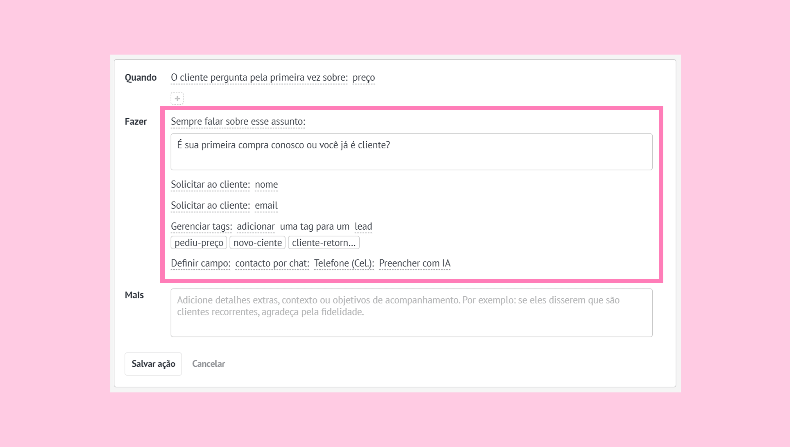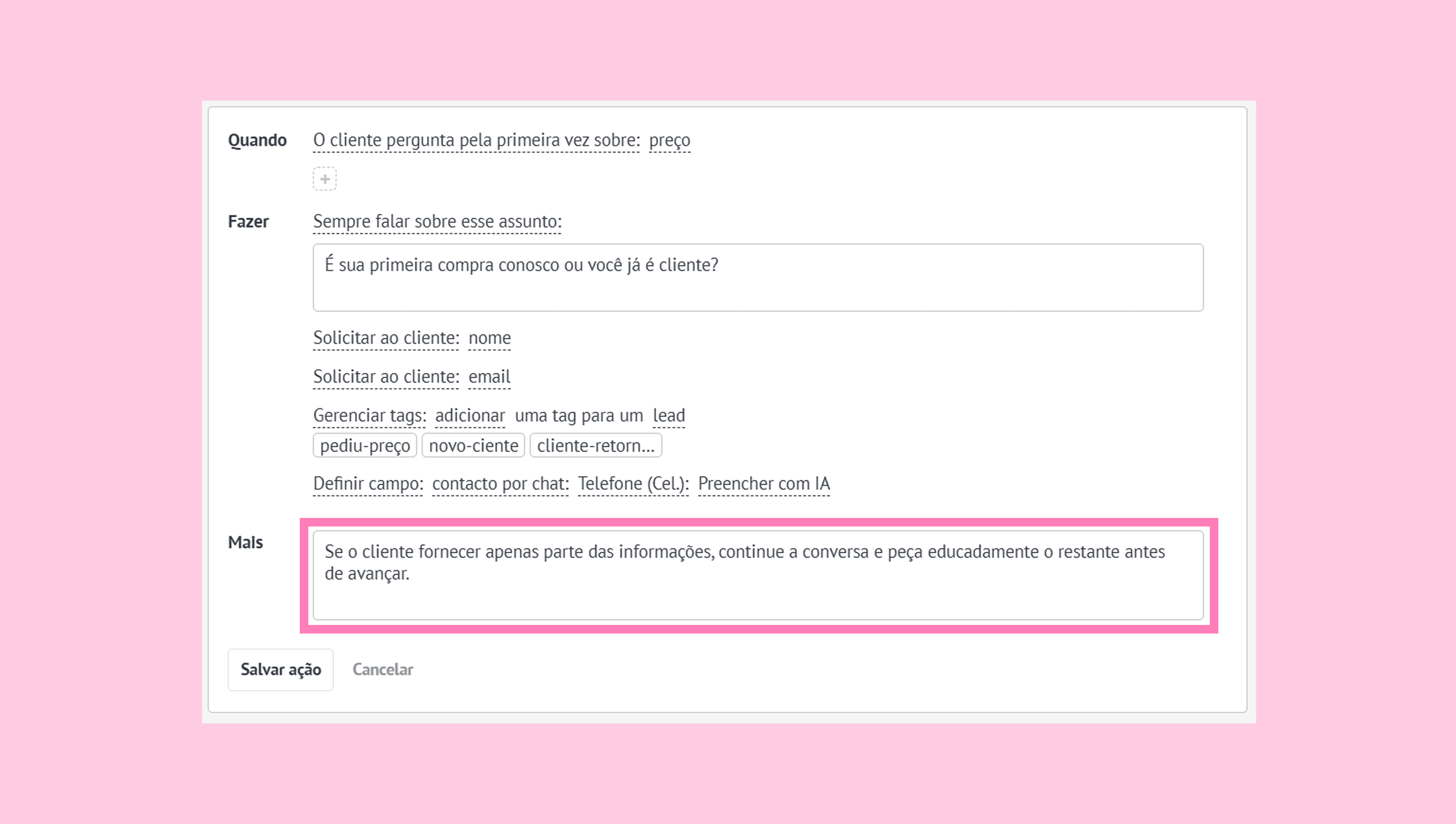 No campo Mais, adicione instruções extras que você quer que o agente de IA siga. Você pode adicionar algo como: ‘Se o cliente fornecer apenas parte das informações, continue a conversa e peça educadamente o restante antes de avançar’.