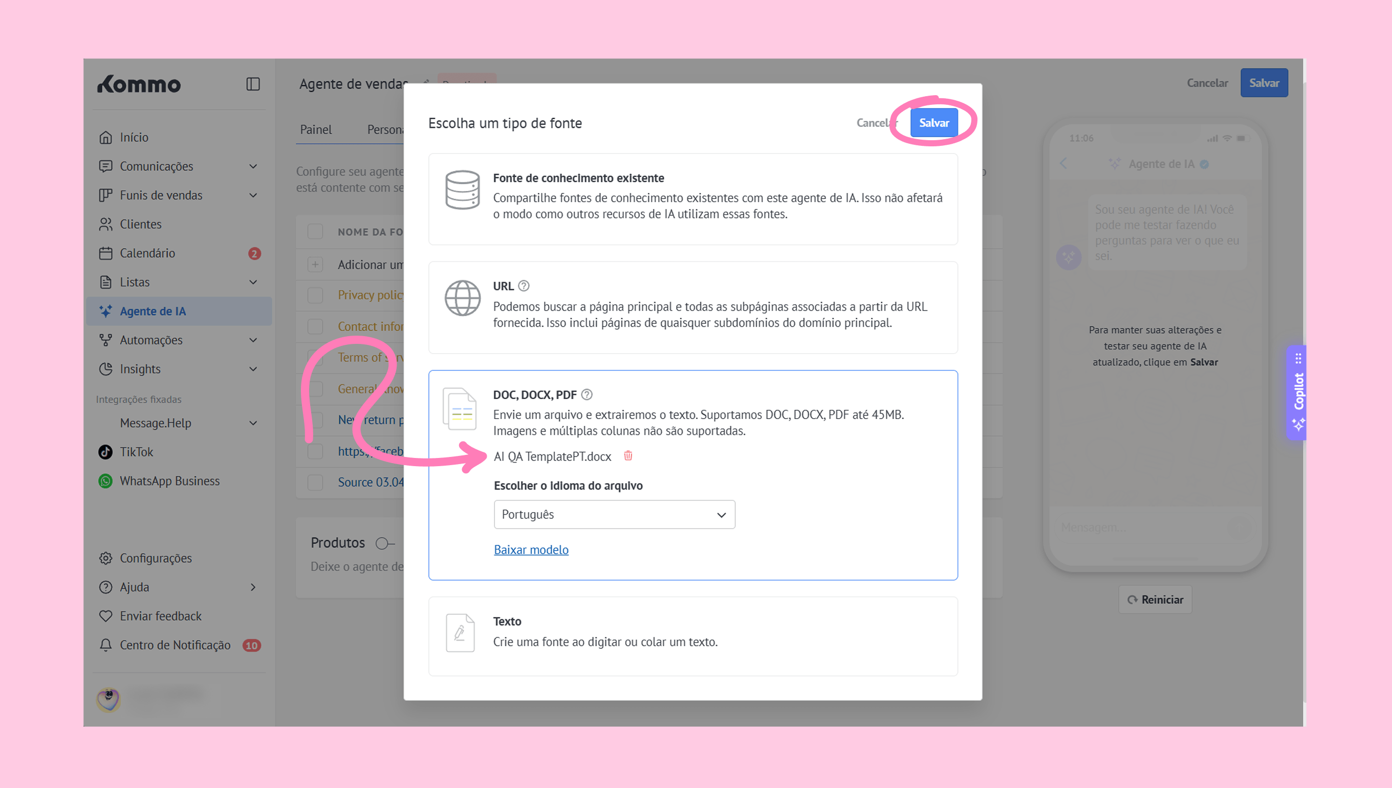 Escolha um tipo de fonte para adicionar informações relevantes sobre o seu negócio. Isso permitirá que o agente de IA forneça respostas com base nas informações da sua empresa (por exemplo, serviços oferecidos, preços, horário de funcionamento ou perguntas frequentes).