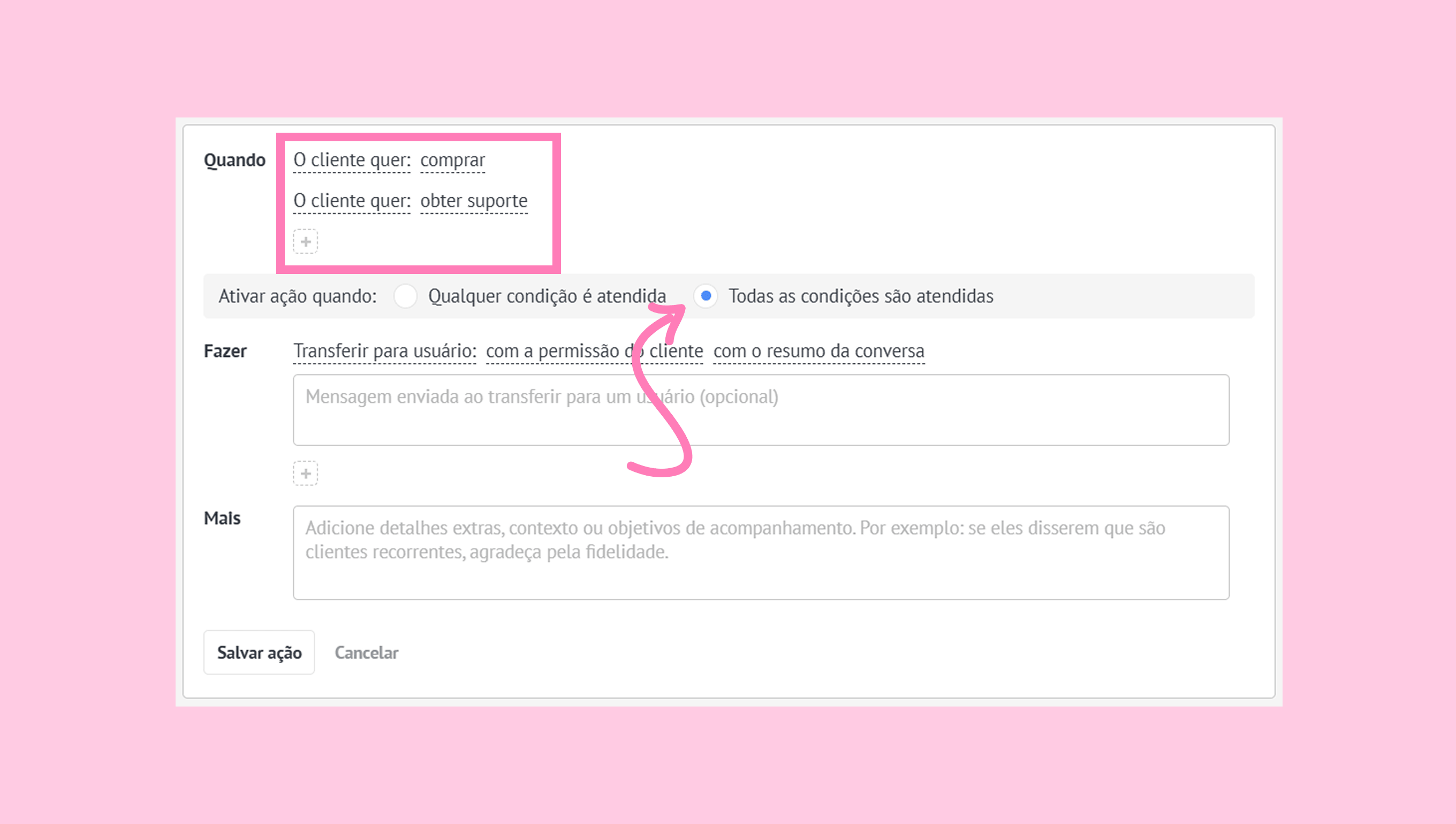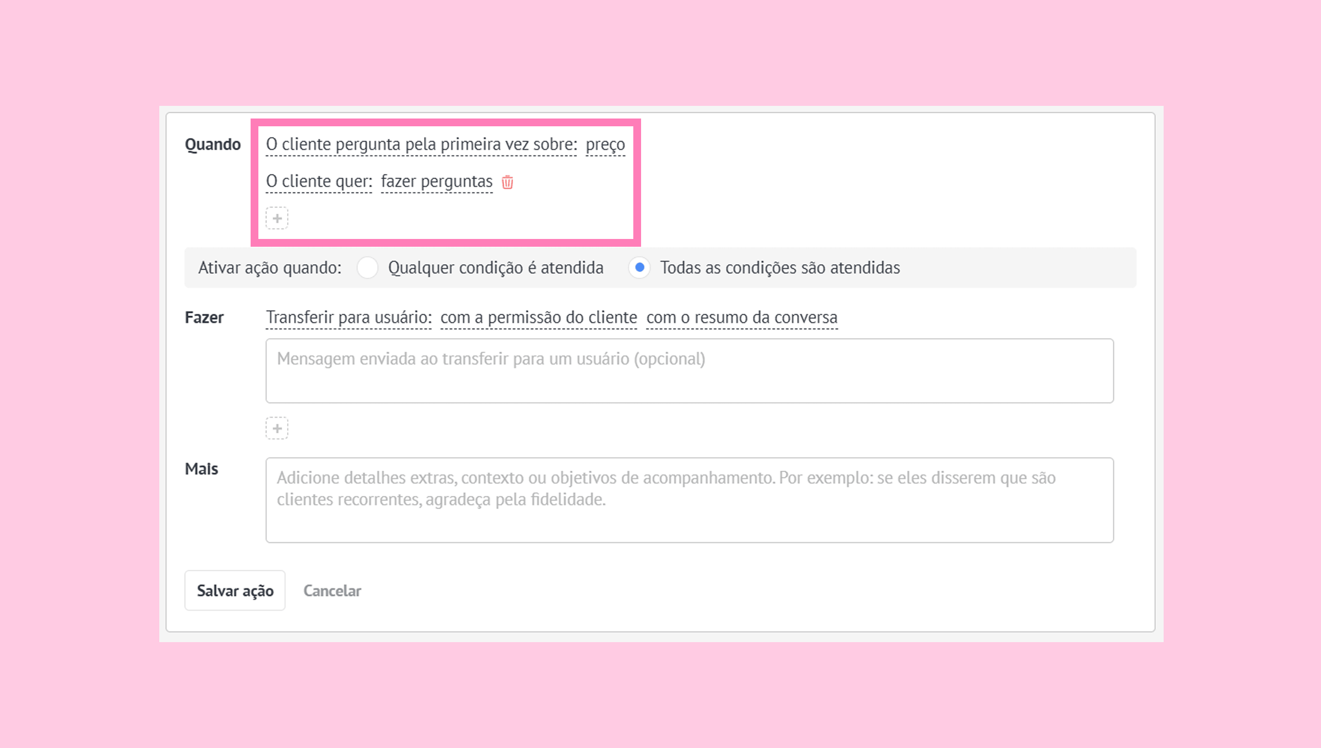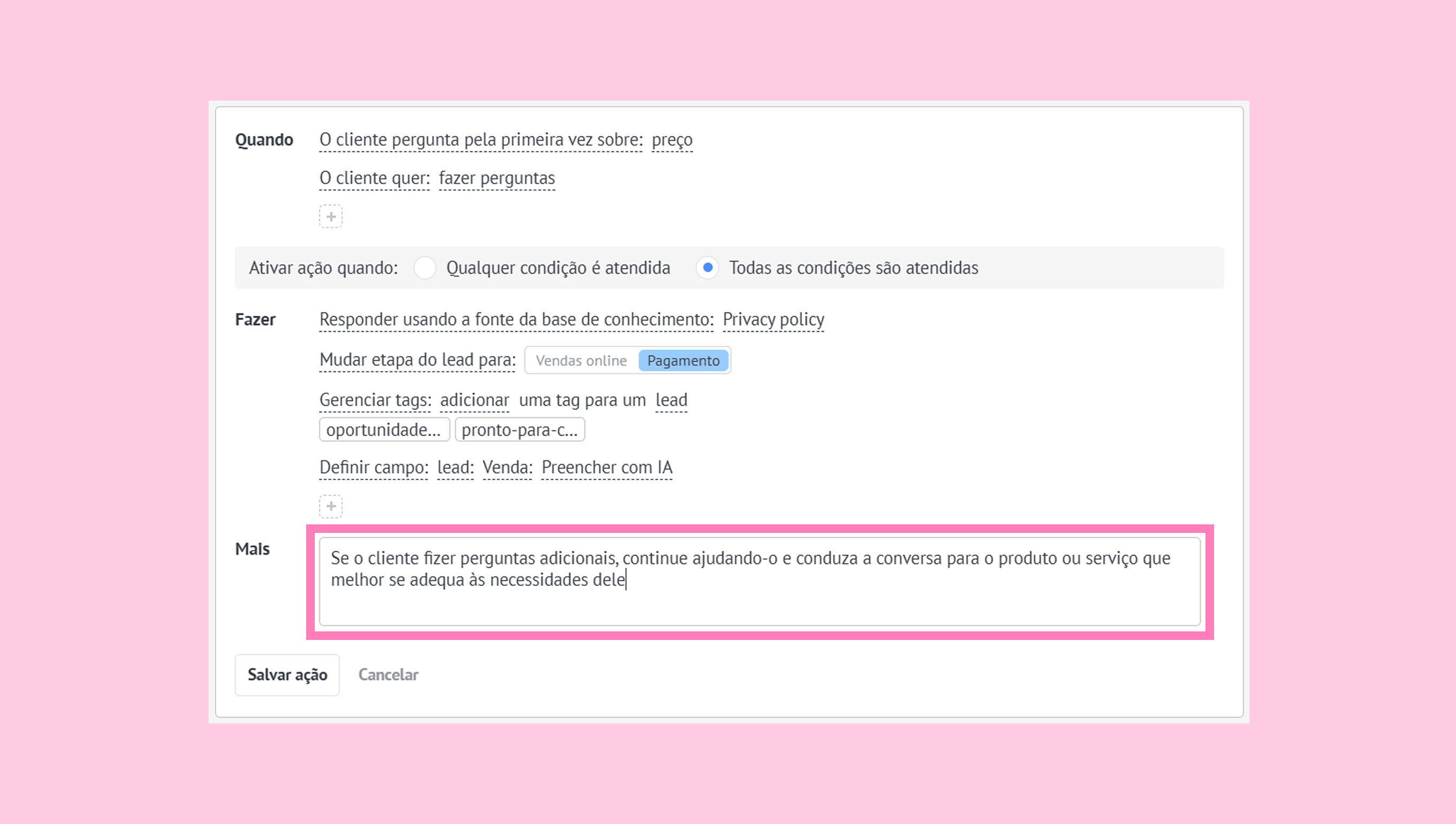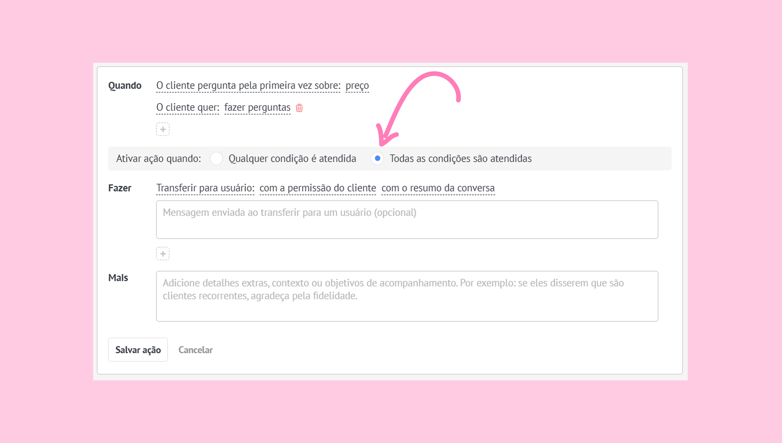 Selecione a opção abaixo para acionar a ação quando todas as condições são atendidas. Isso garante que a ação seja executada quando o cliente demonstrar intenção de primeira compra e fizer uma pergunta pré-venda.