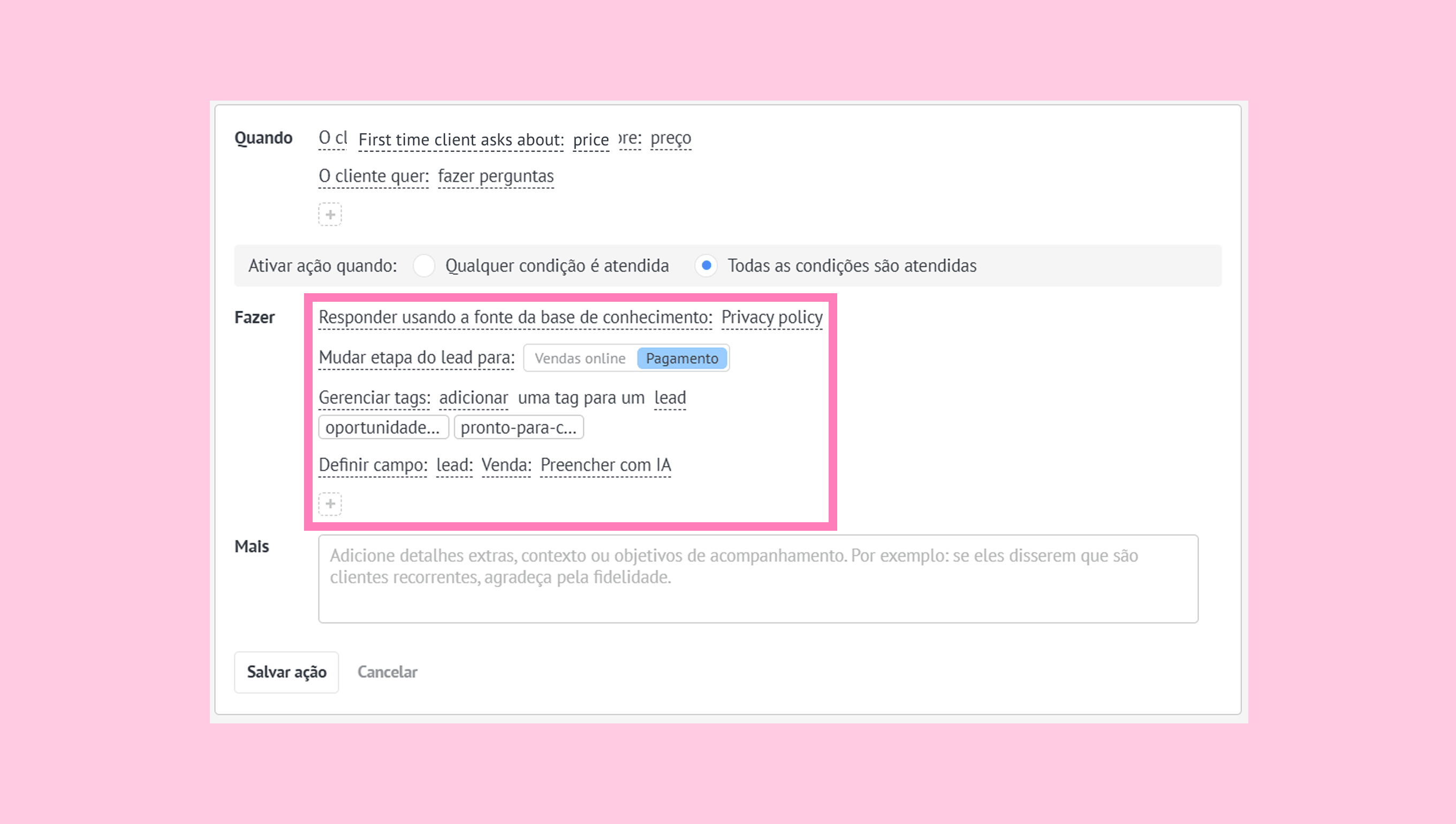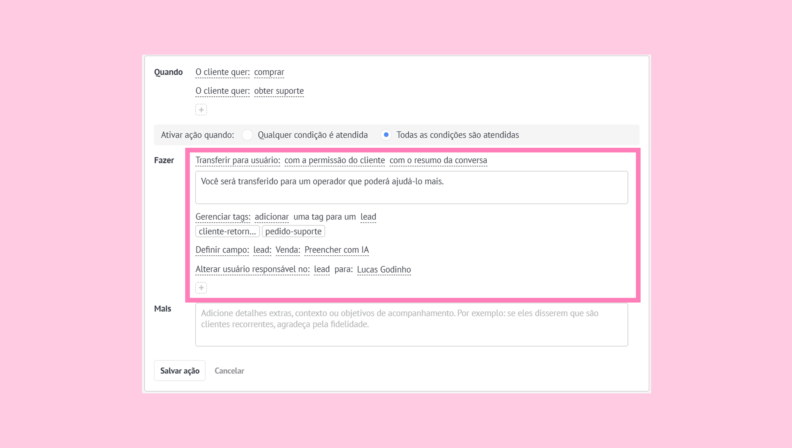 FAZER — ações que o agente de IA executará quando as condições forem atendidas.