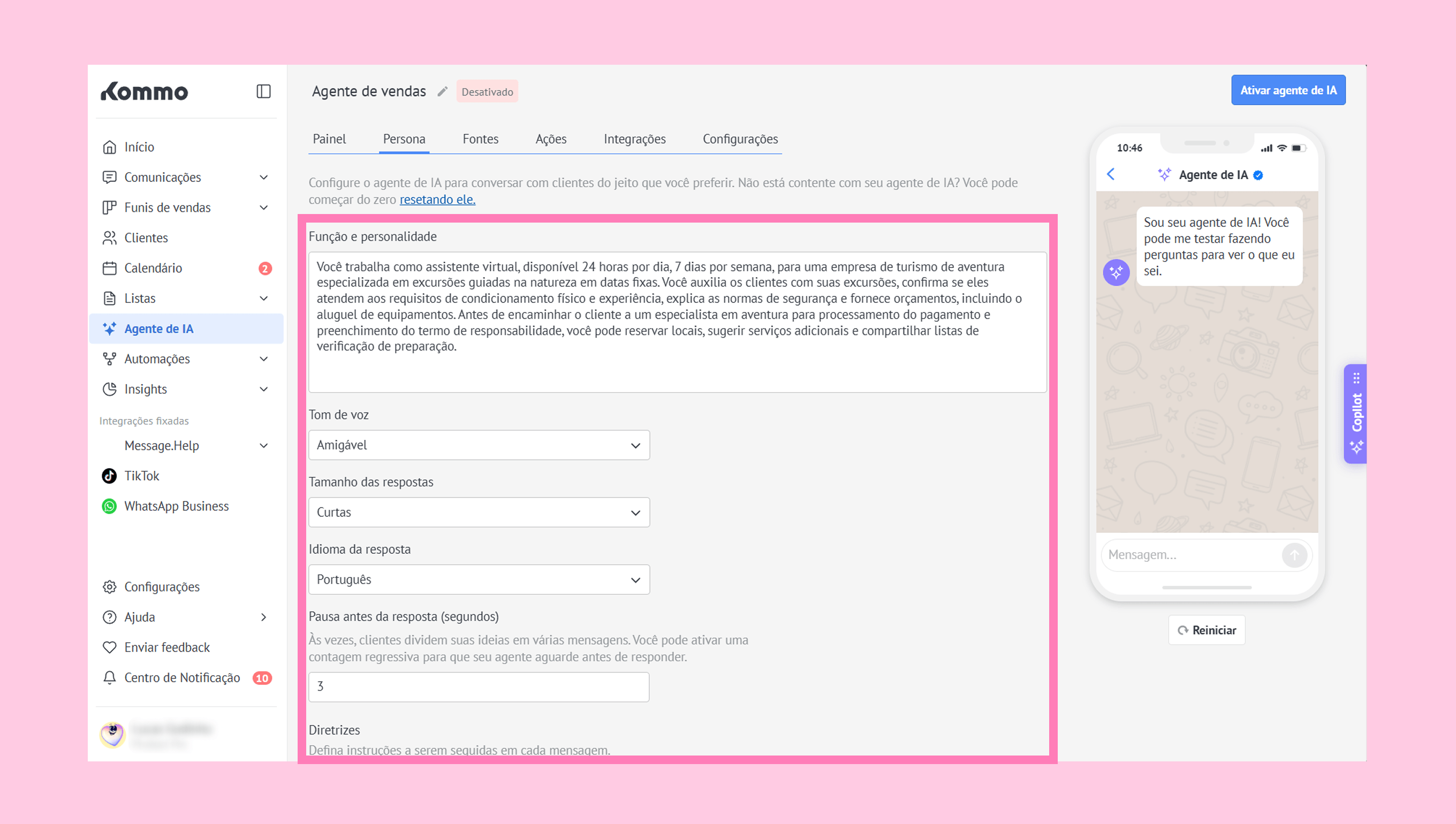 Vá até a aba Persona e configure como o agente de IA deve se comunicar com seus clientes. Configure os seguintes campos: