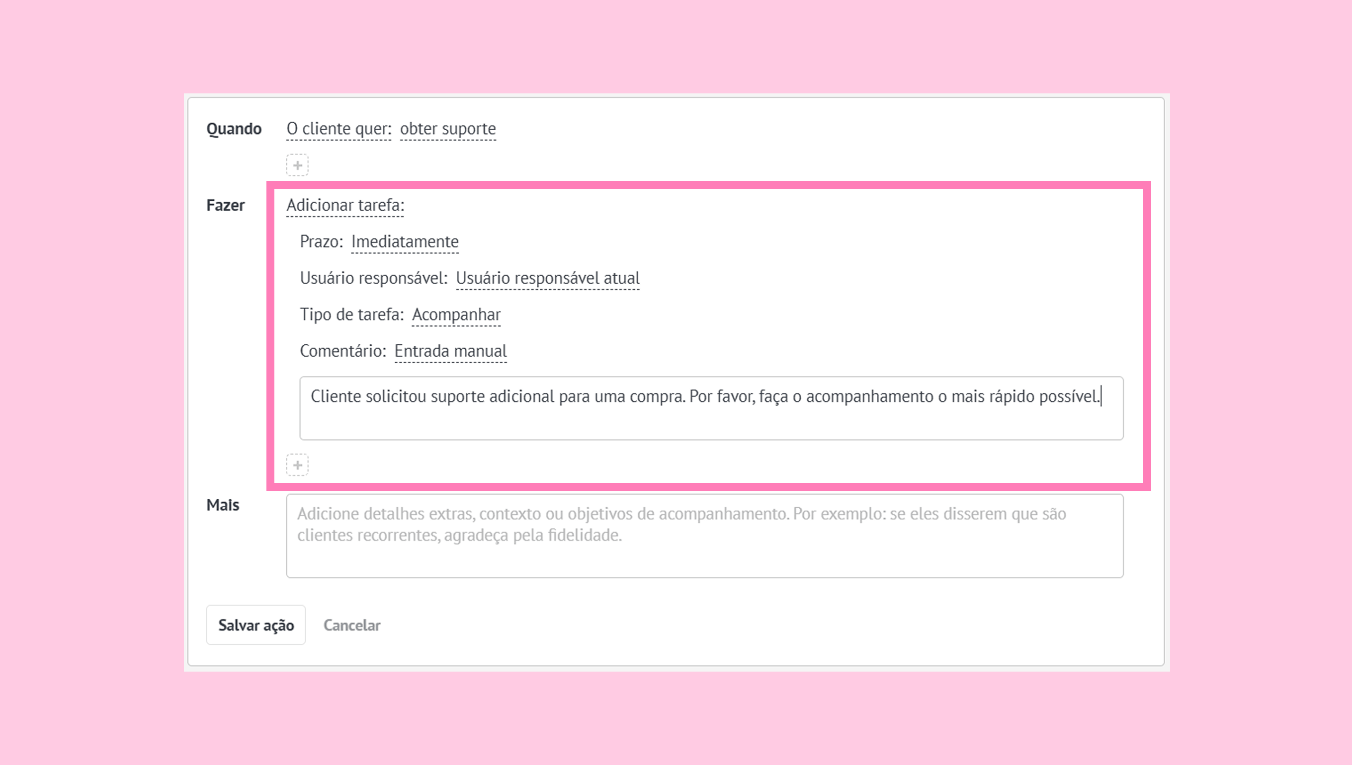 Para a ação FAZER, selecione Adicionar tarefa para criar uma tarefa para o usuário responsável pelo lead, para que ele possa fazer o acompanhamento o mais rápido possível. Inclua uma breve nota na tarefa explicando o que o cliente precisa de ajuda, como: 'Cliente solicitou suporte adicional para uma compra. Por favor, faça o acompanhamento o mais rápido possível'.