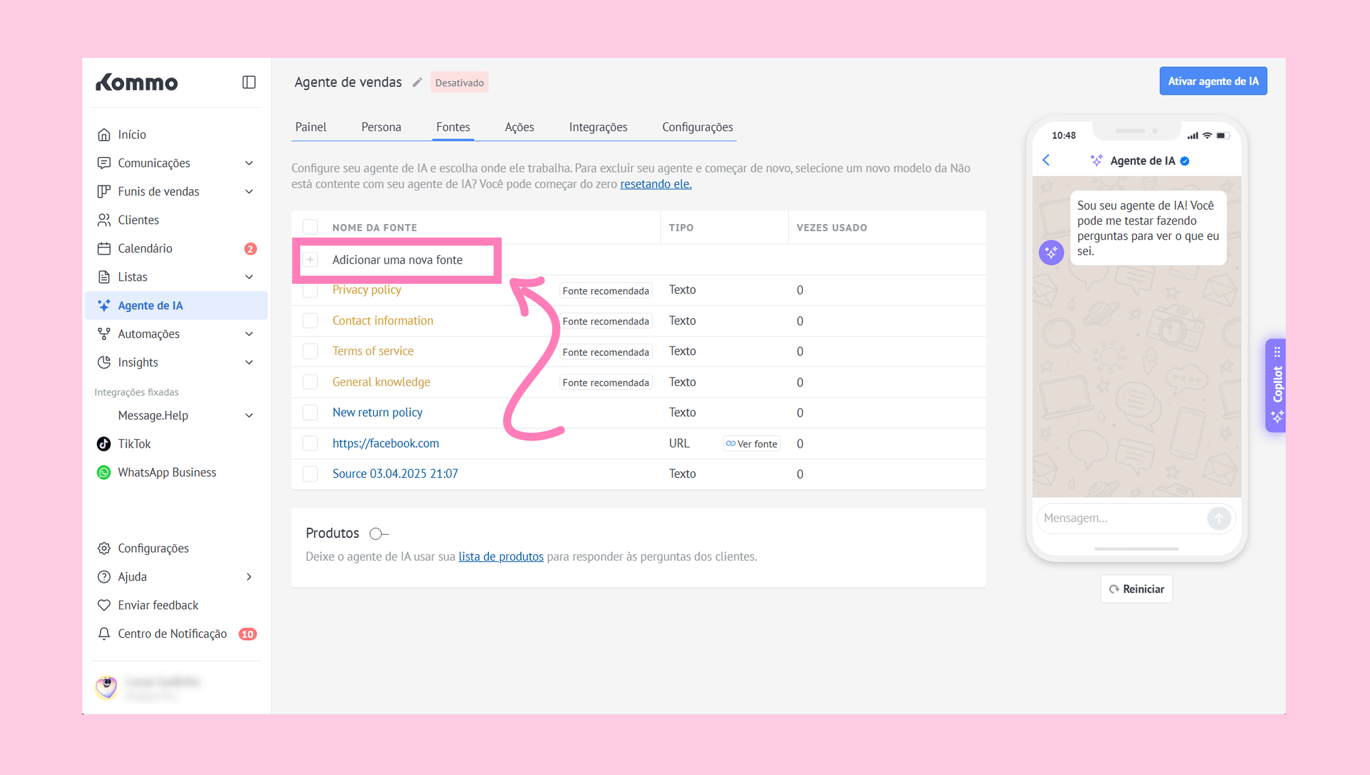 Vá até a aba Fontes e adicione uma fonte de conhecimento com as perguntas frequentes do seu negócio. Isso pode incluir informações como preços, prazos de entrega, formas de pagamento ou perguntas comuns antes da compra.