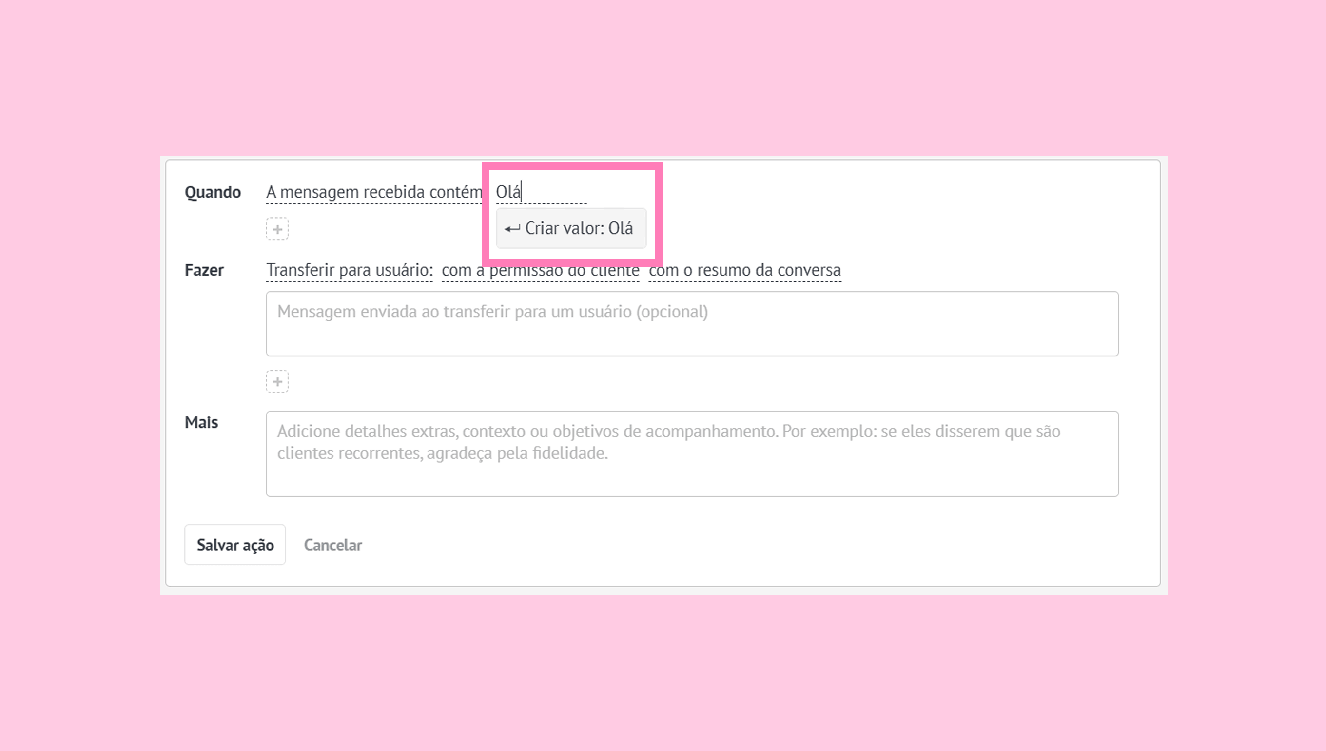 Você também pode digitar sua própria condição QUANDO personalizada manualmente e pressionar Enter para salvar. Por exemplo: adicione frases como olá ou como vai.