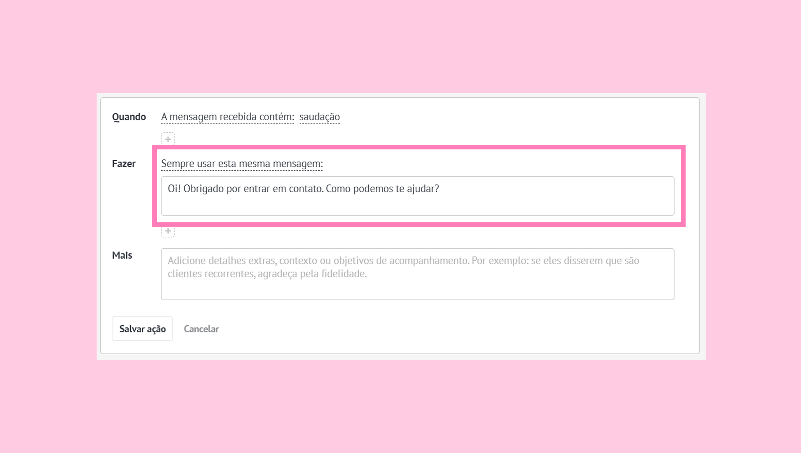 Selecione a ação FAZER Sempre usar exatamente esta mesma mensagem e adicione uma mensagem de boas-vindas. Por exemplo: 'Oi! Obrigado por entrar em contato. Como podemos te ajudar?'.